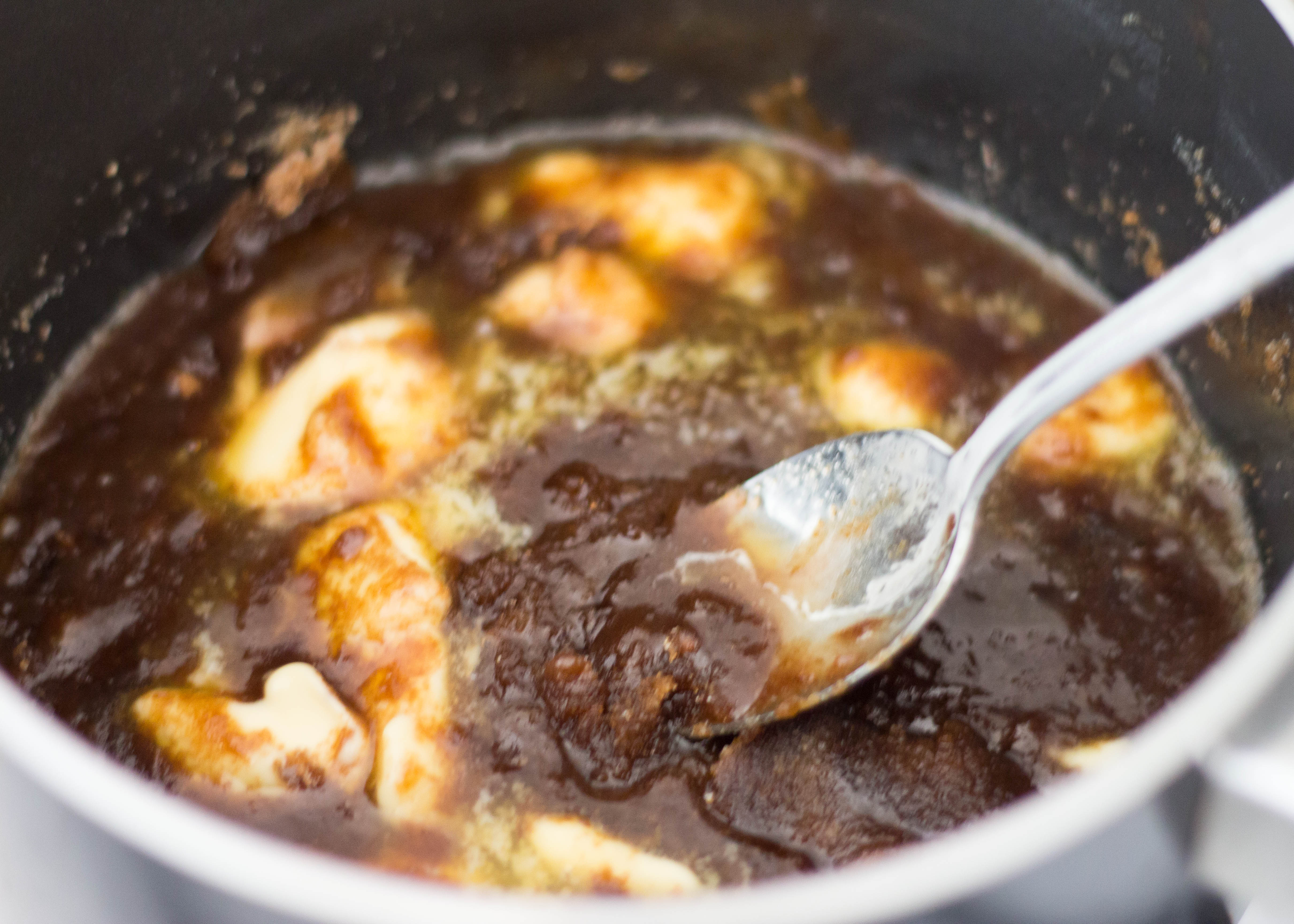 Gently melt the butter and sugar in a saucepan over medium heat.