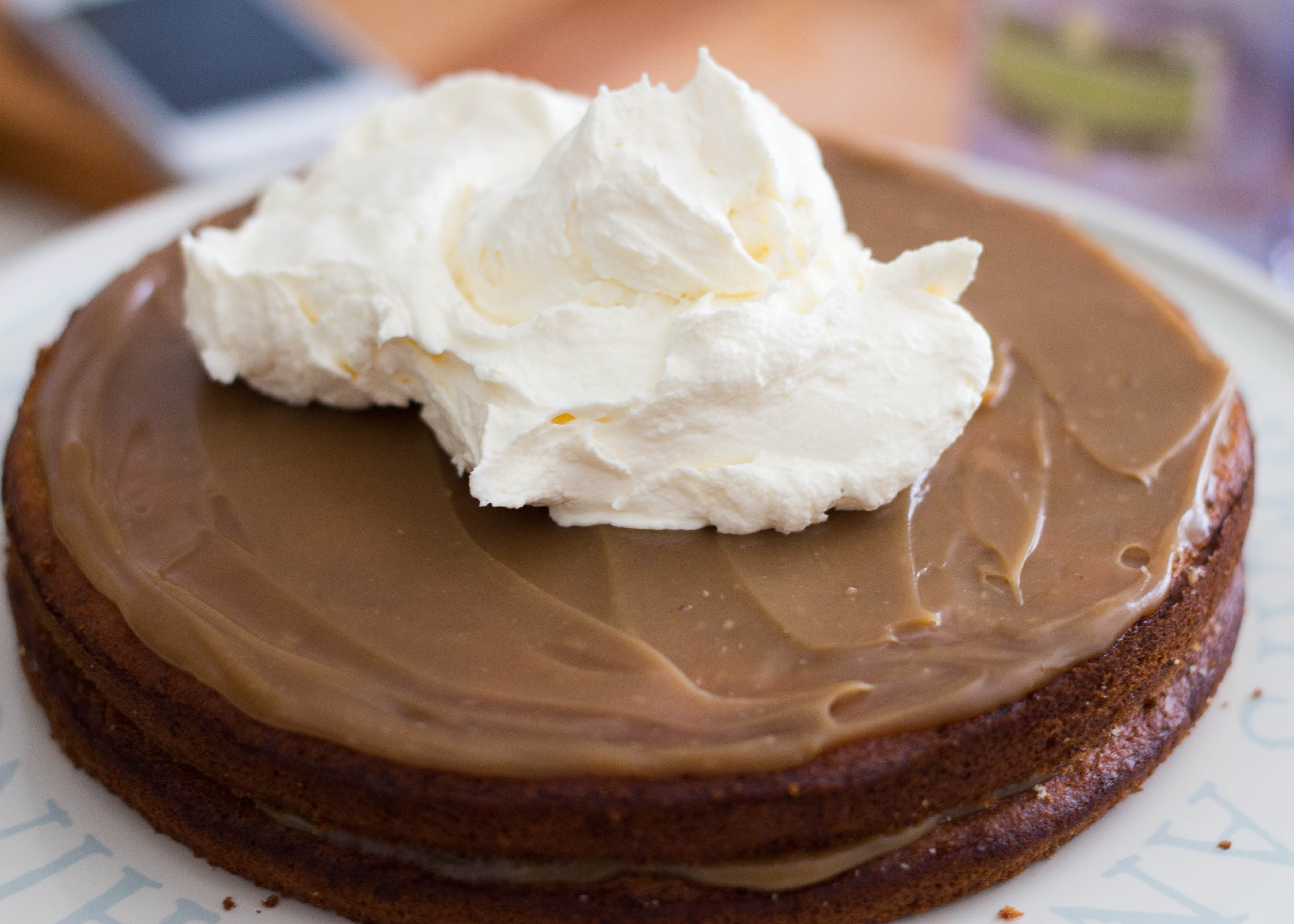 Place another layer on top of your cake caramel side up so that there is a layer of caramel sandwiched between the two cake layers, then spread a large spoon of the cream mixture over the top caramel layer.