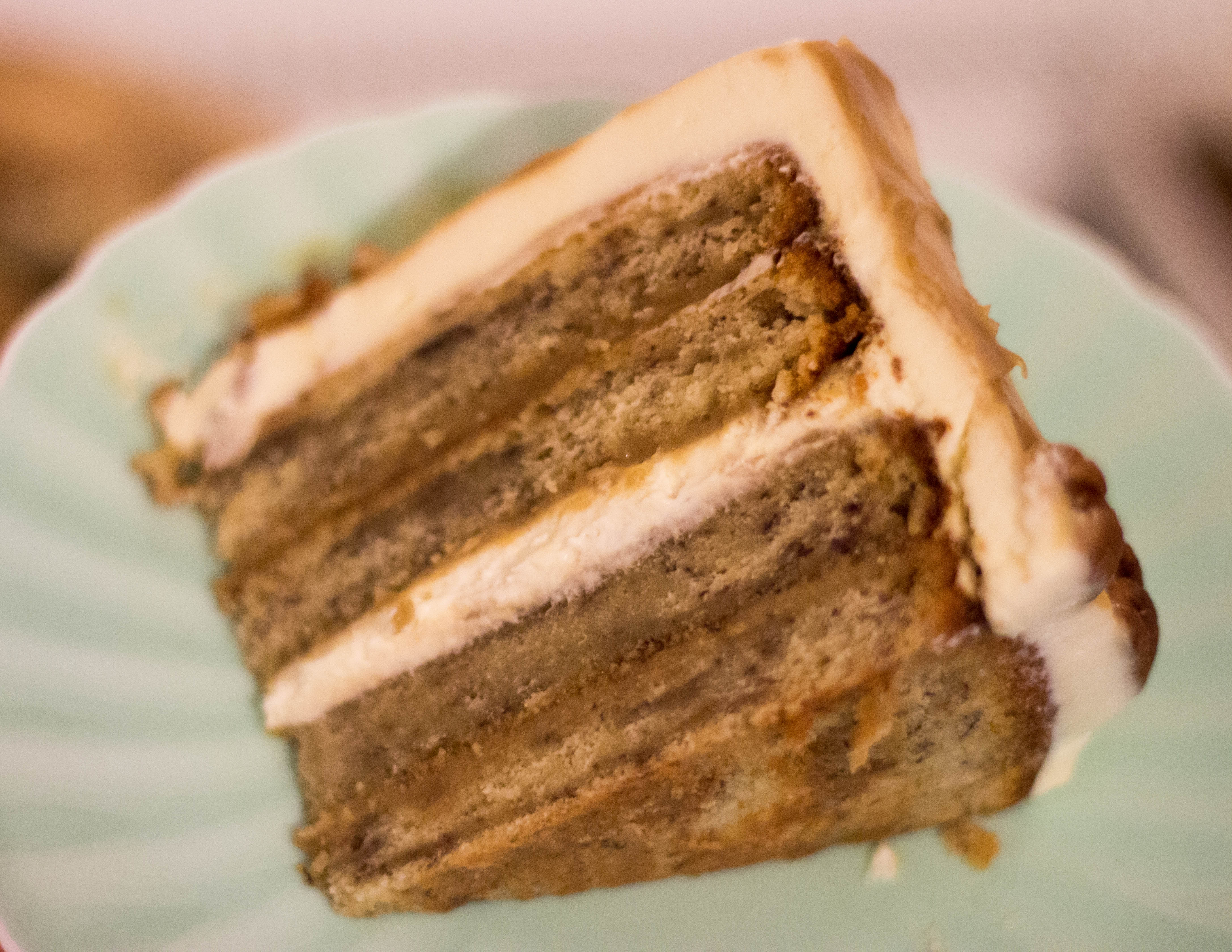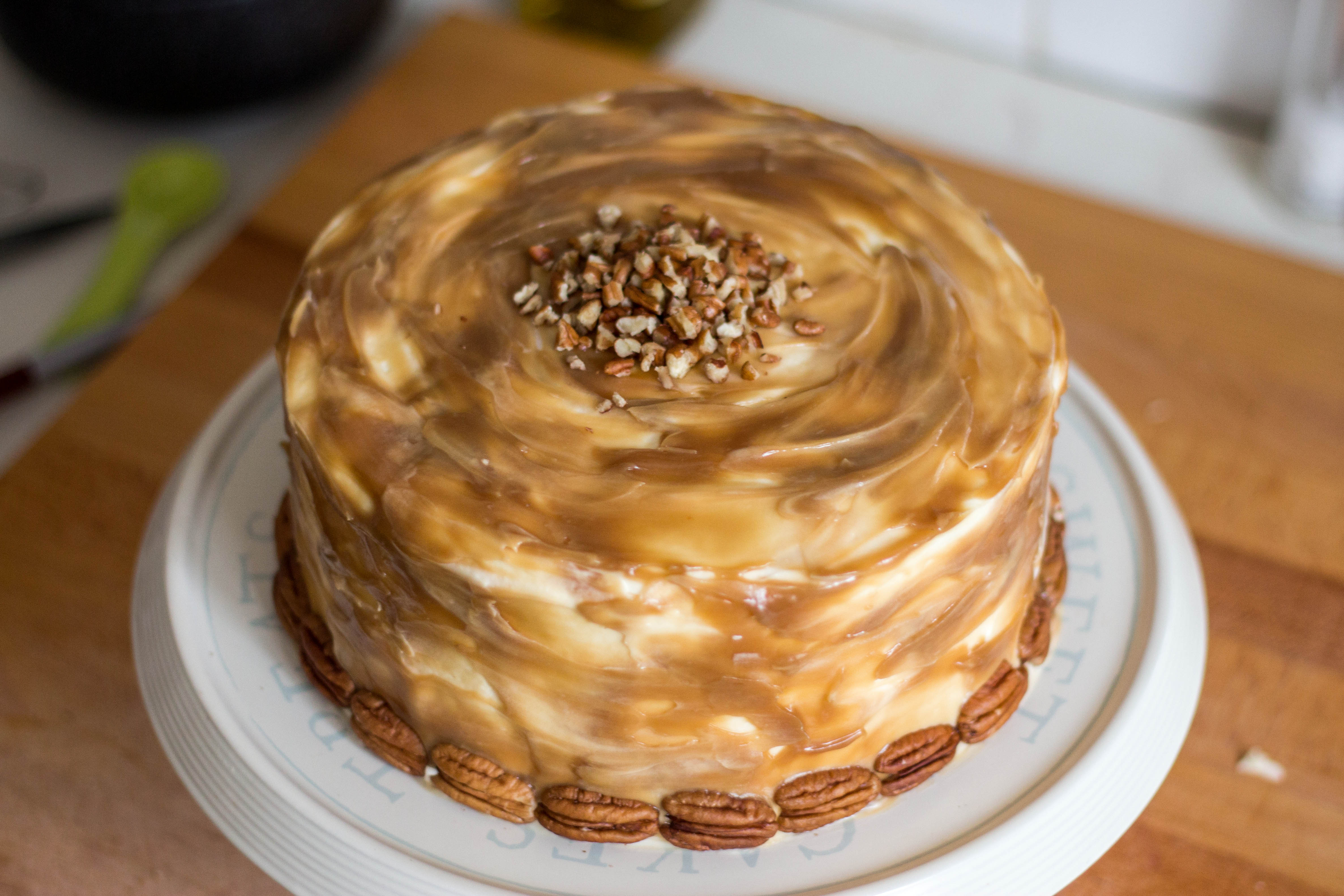 A moist banana cake with layers of salted caramel and cream, smothered in a whipped cream and cream cheese frosting, salted caramel sauce and topped with crushed pecans.