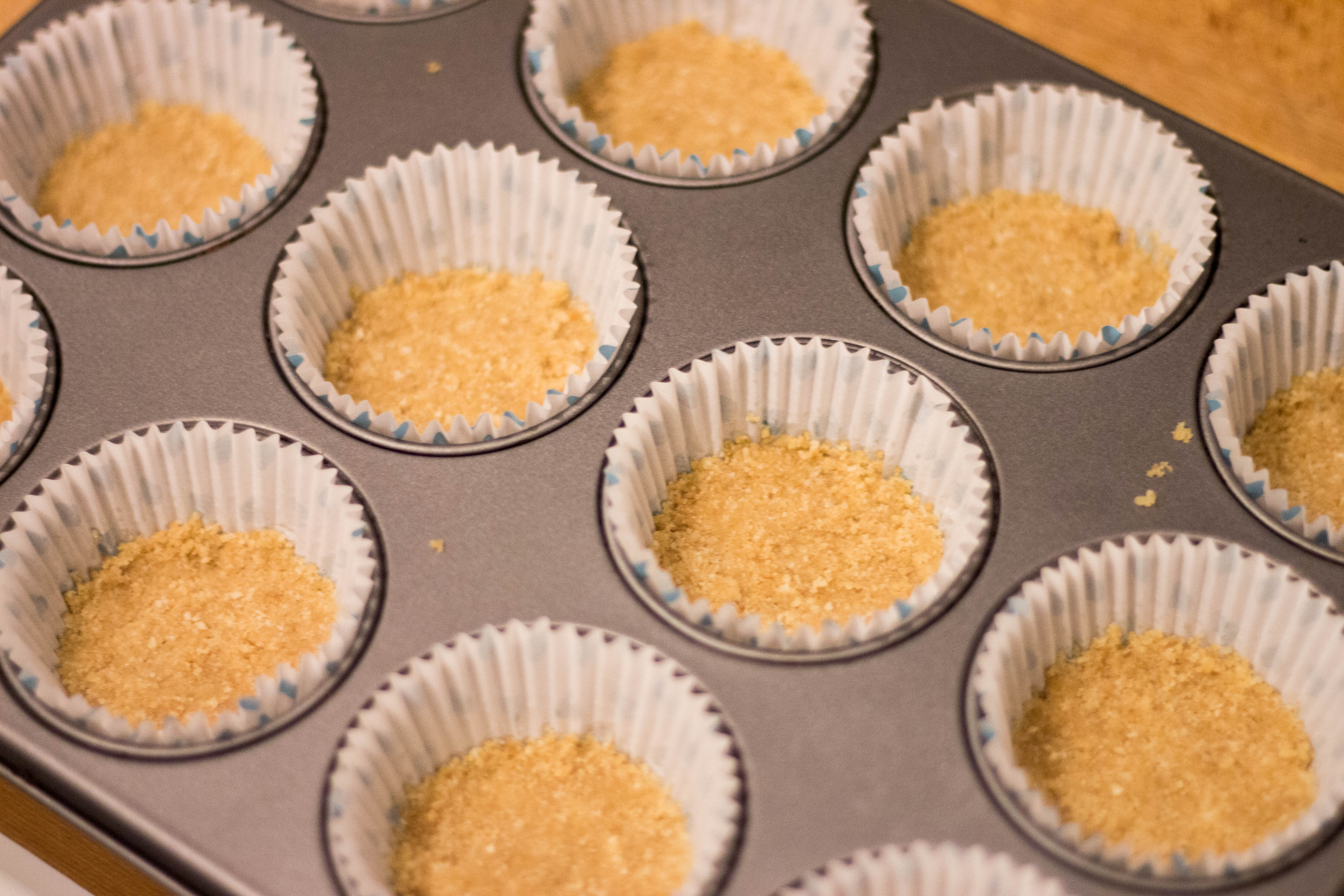Line a cupcake tin with cupcake cases, and fill each case with a tablespoon of the biscuit mixture, pressing firmly into the base of the tin.