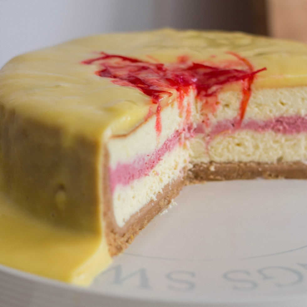 Lemon Curd Crusted Raspberry Burst Cheesecake