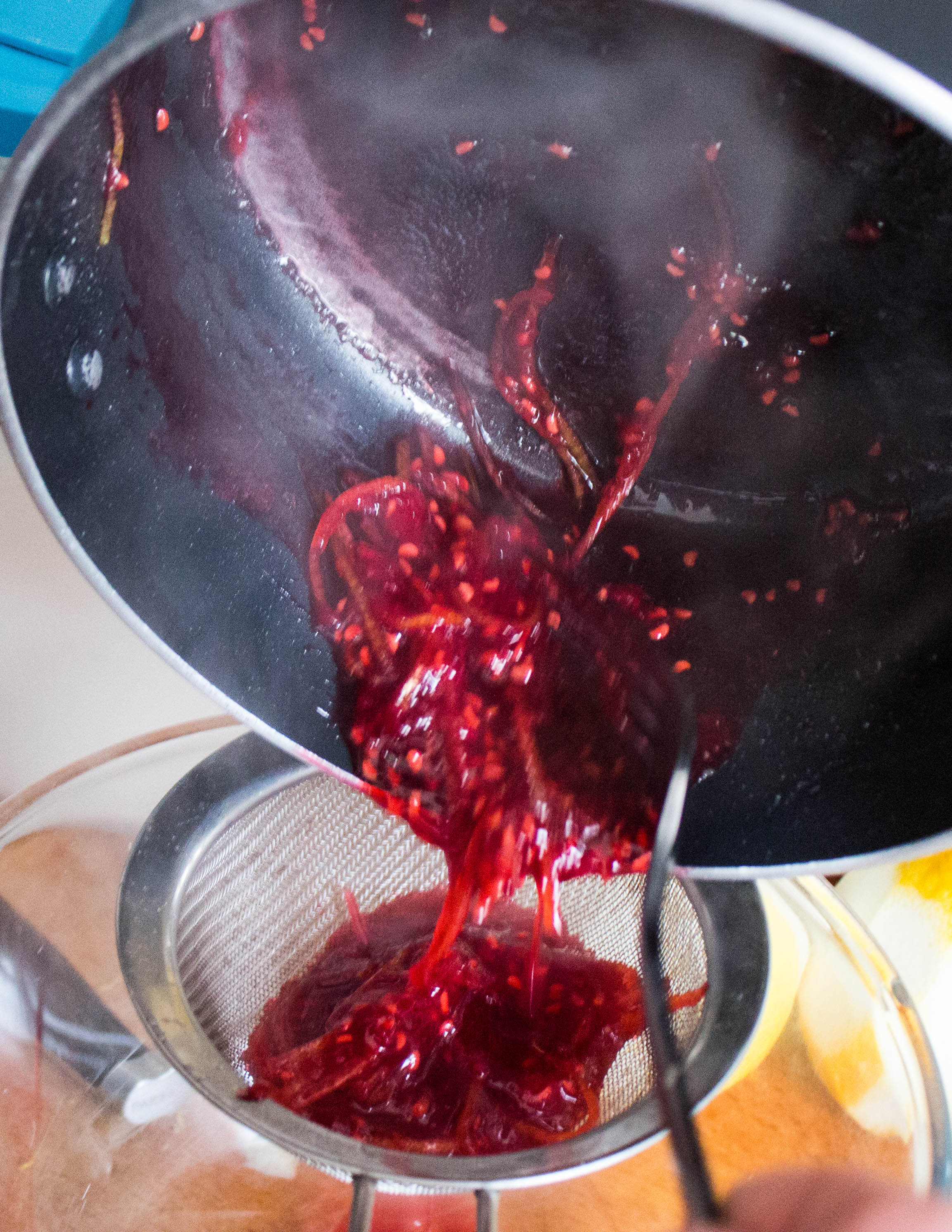 Once the berries have broken down and the liquid has thickened, gently strain the mixture through a sieve, taking care not to damage the lemon zest.