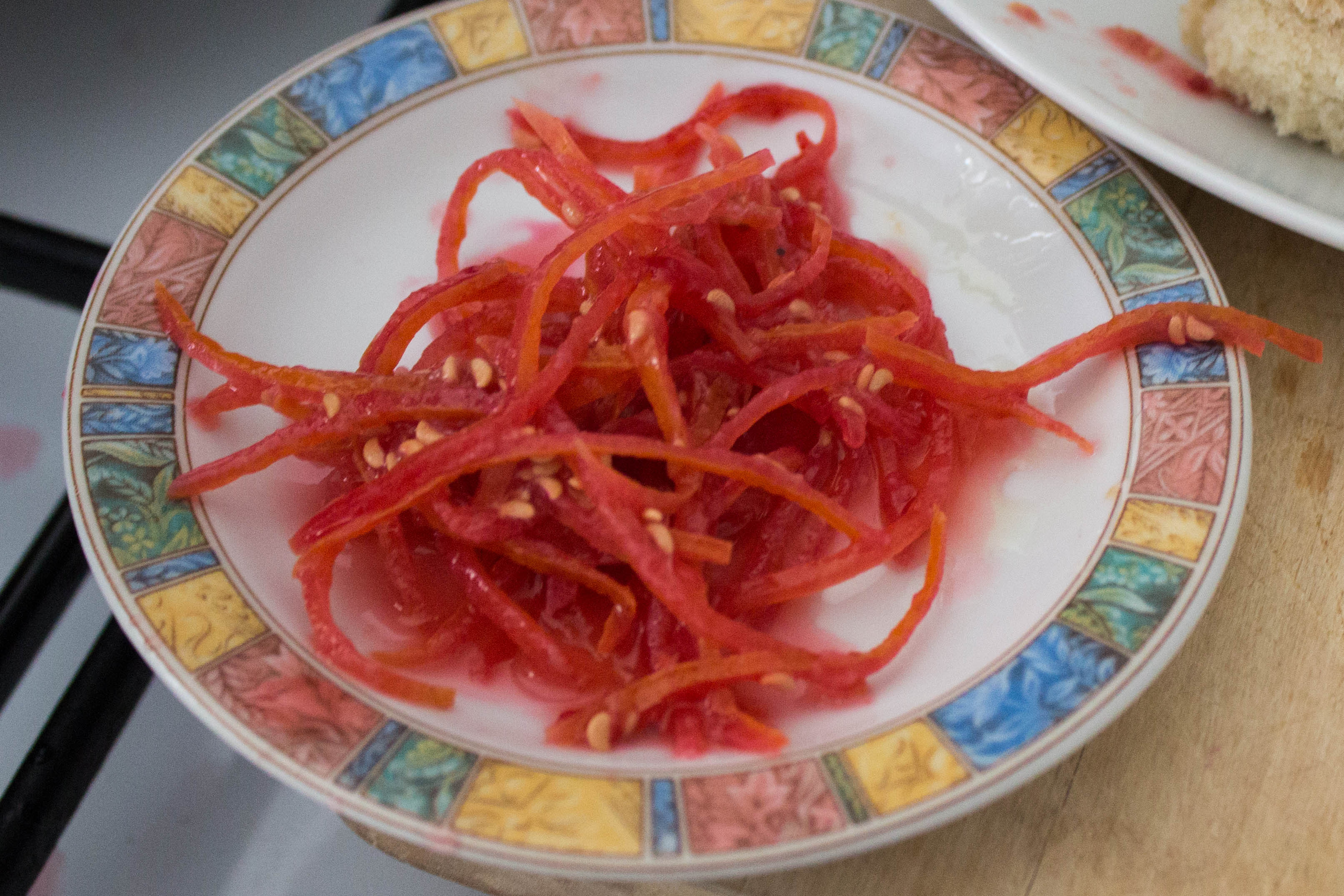 Set the raspberry coulis aside to cool, then pick the lemon zest out of the pulp and set aside for later use – this is your raspberry infused candied lemon zest.
