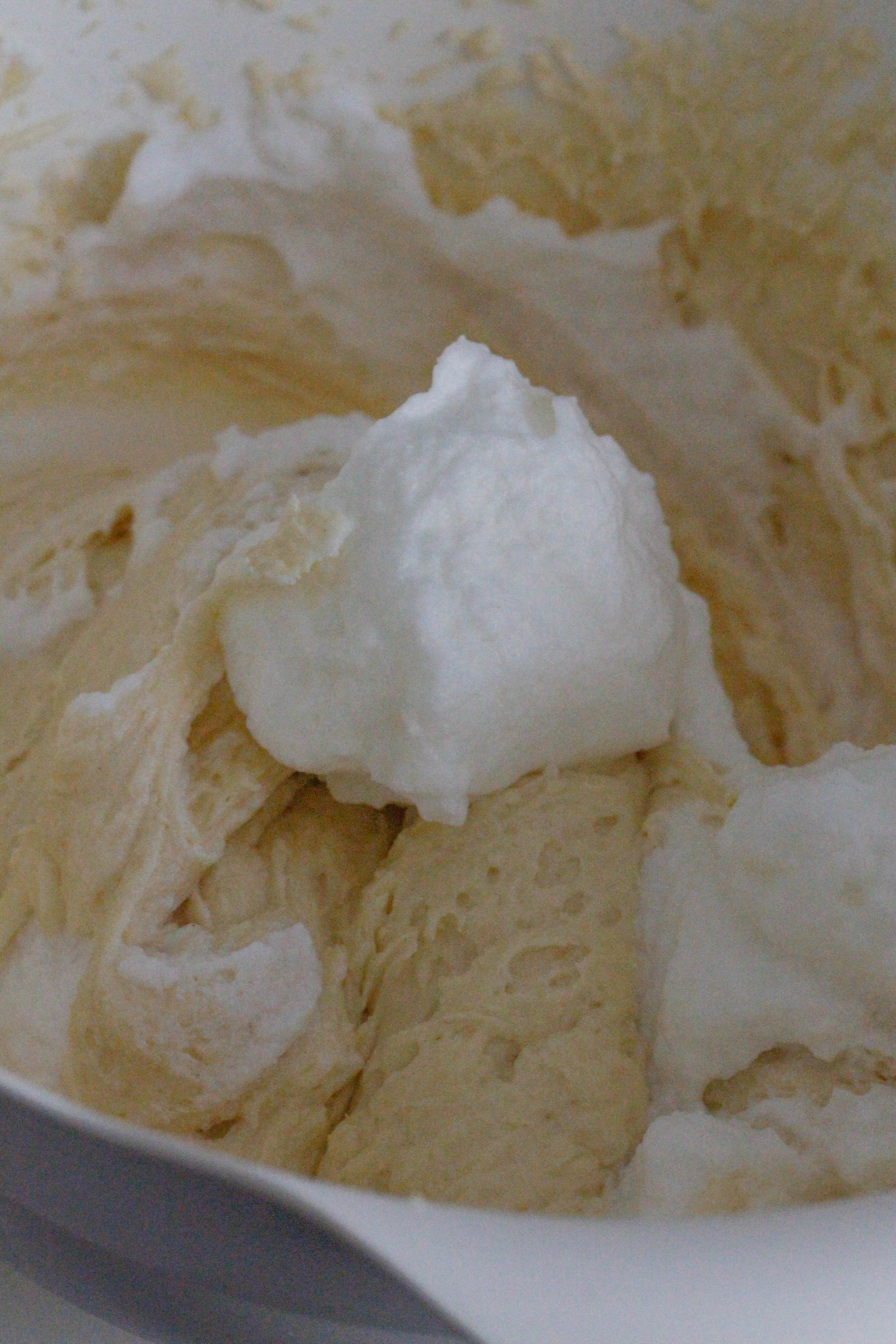 In a clean dry mixing bowl beat the egg whites to stiff peaks, adding in the remaining 20g of sugar, then fold into the cake batter.