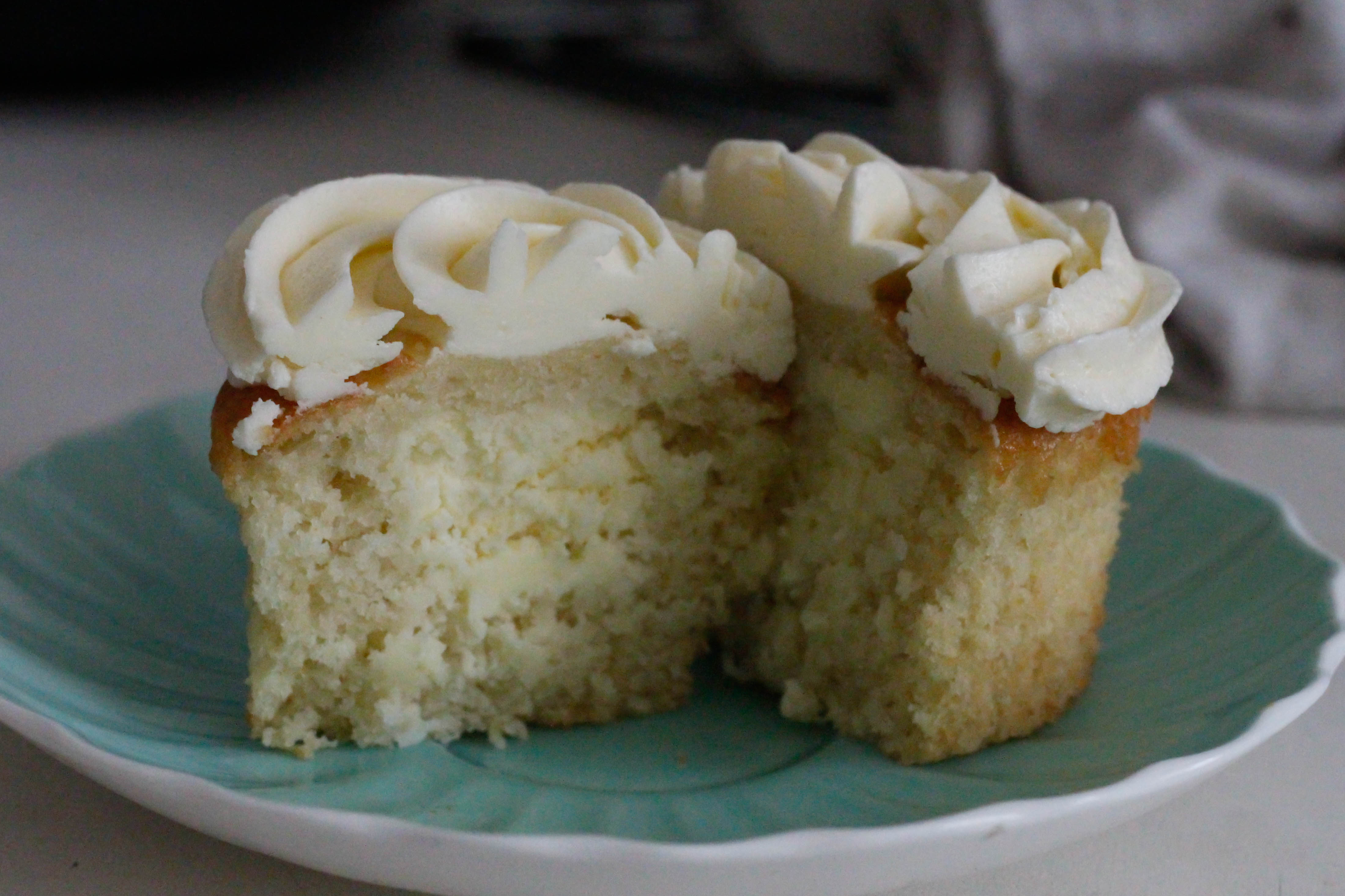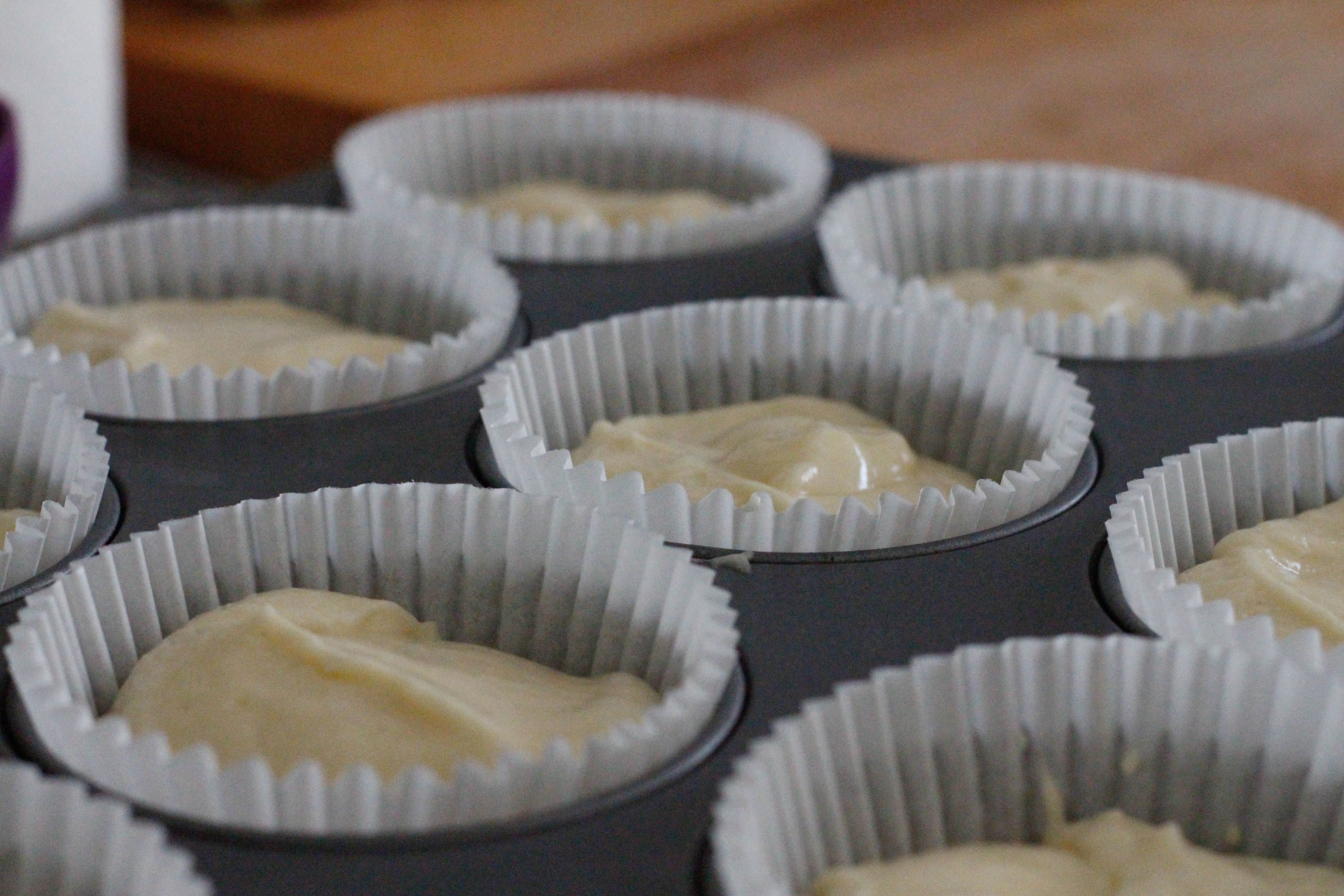 Fill your cupcake cases two thirds of the way up, and divide the ramaining batter between two 4″ cake tins (or bake one at a time if you do not have two 4″ tins).