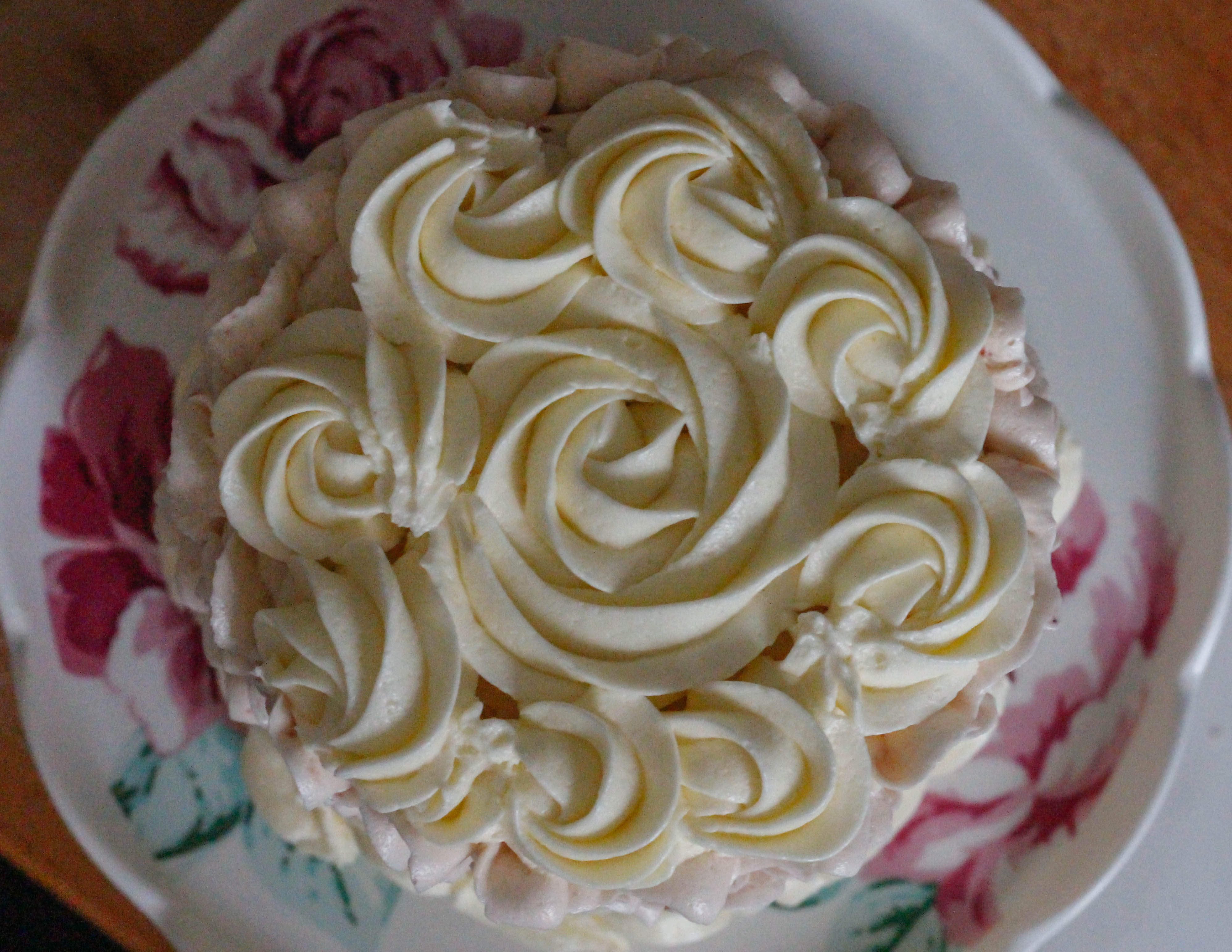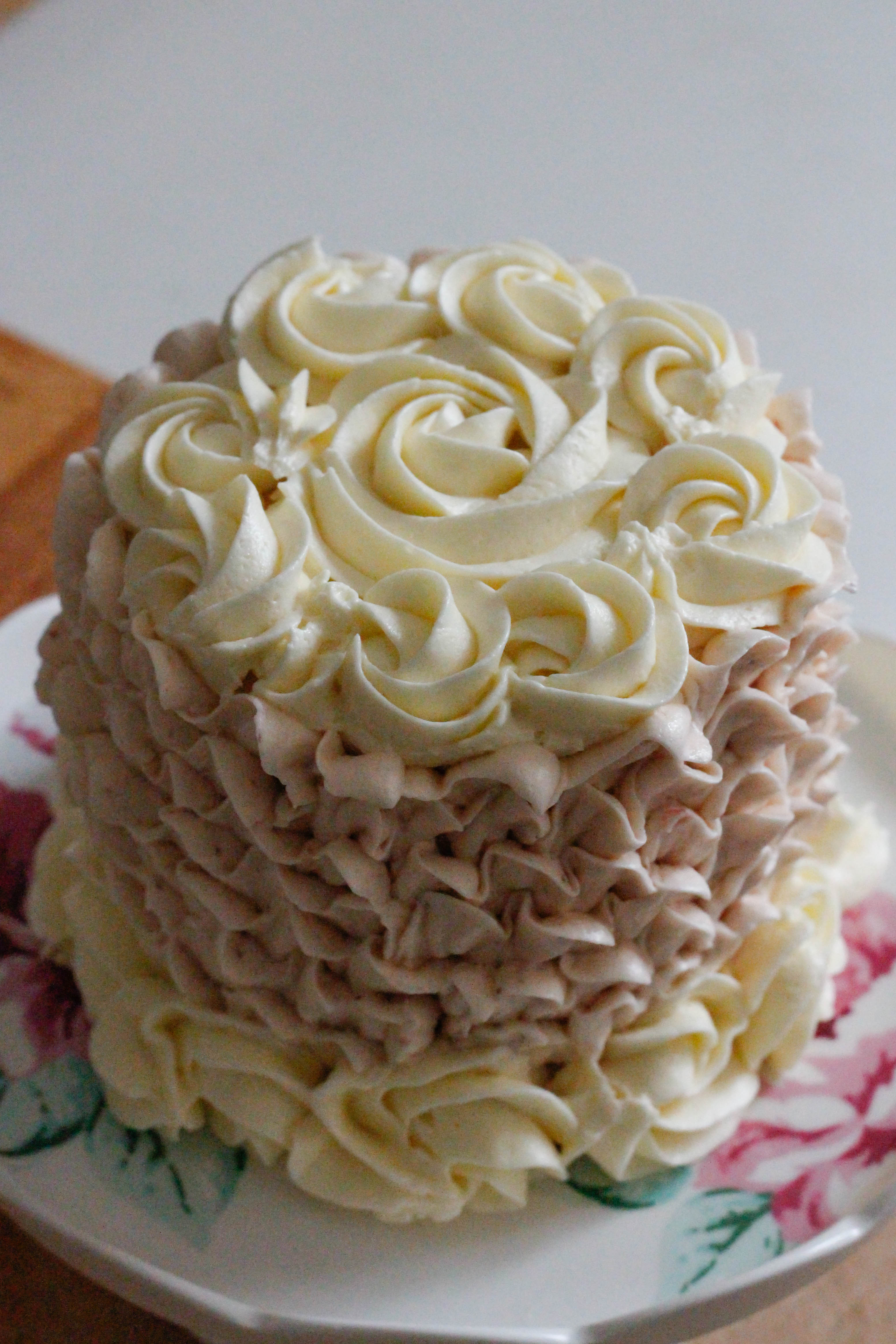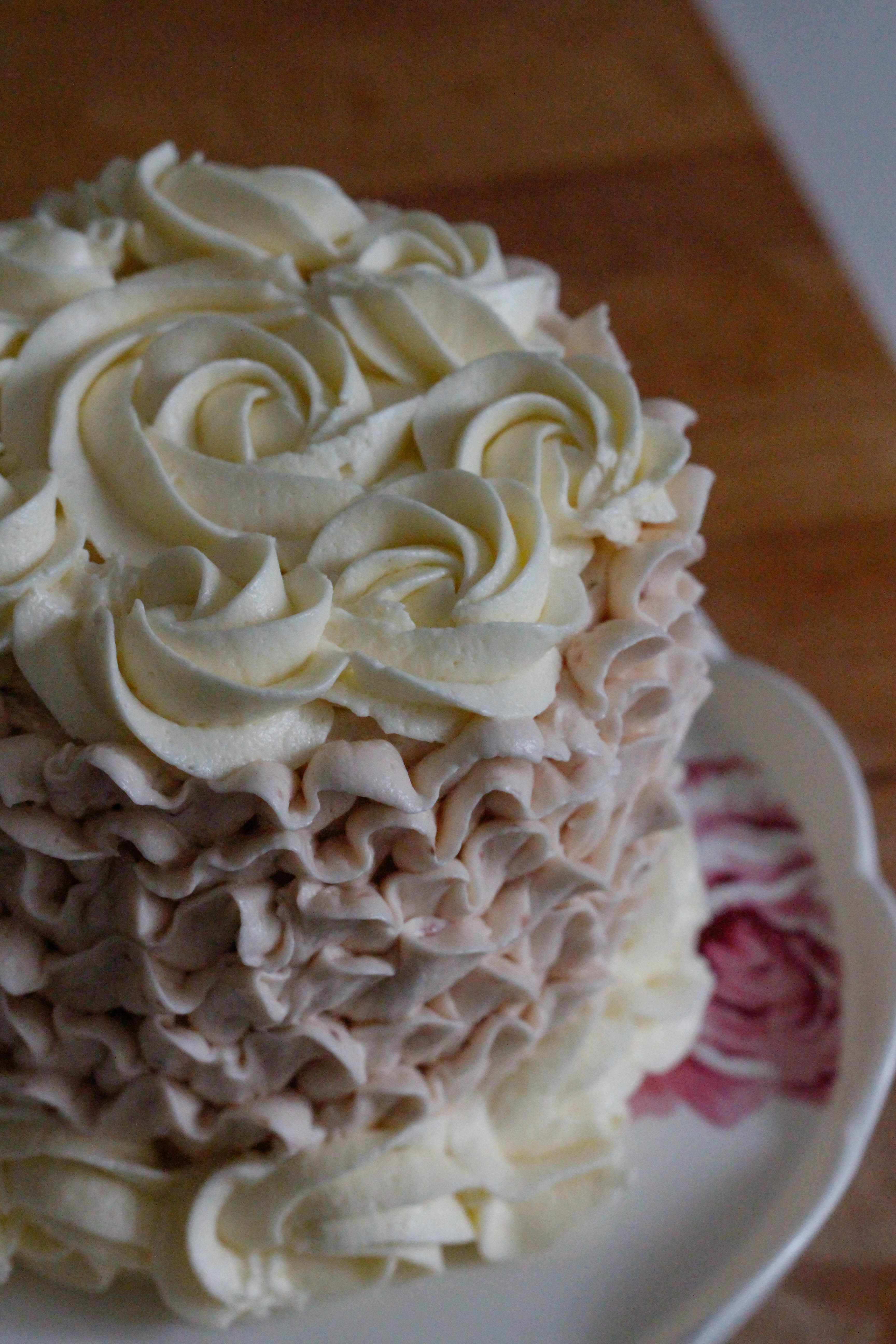 To decorate, I fitted a piping bag with a large open star tip, and filled with the champage buttercream for the top. I then fitted a separate piping bag with a petal tip, and filled with the strawberry buttercream for the ruffles, starting at the top and working my way down. The ruffles stopped about an inch from the base, and I filled the gaps with the champagne buttercream using the large open star tip again.
