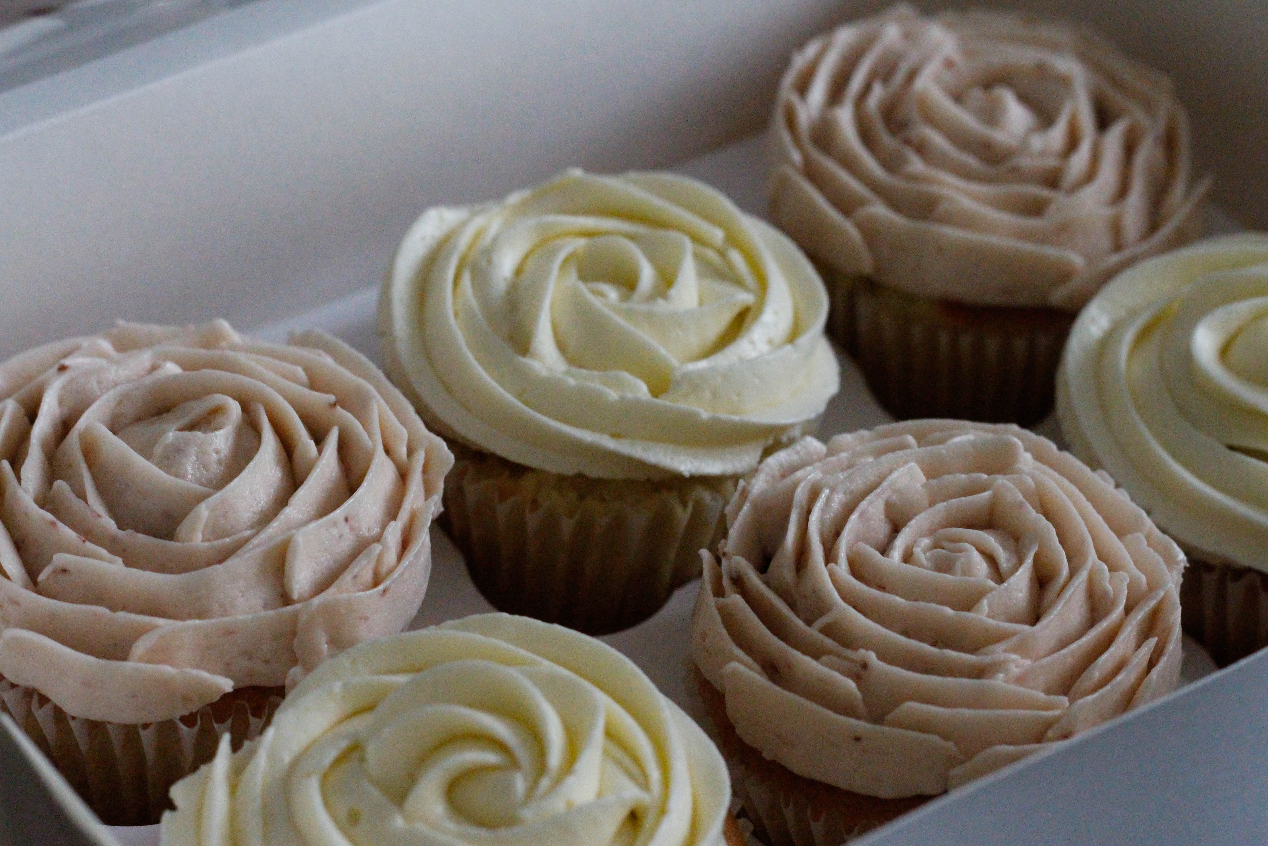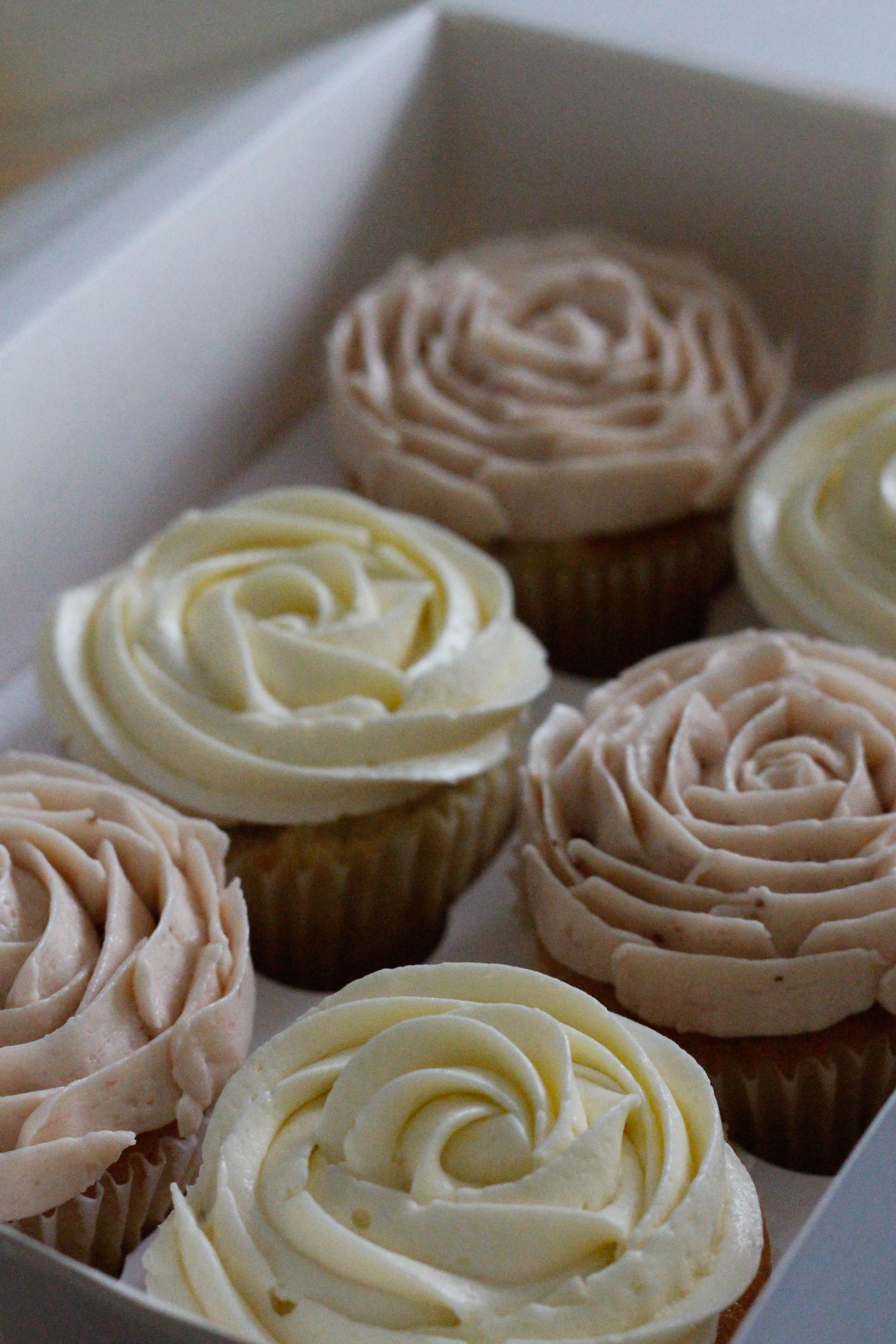 Pipe the buttercream onto your cakes using the open star tip for the champagne buttercream, and petal tip for the strawberry, or as desired.