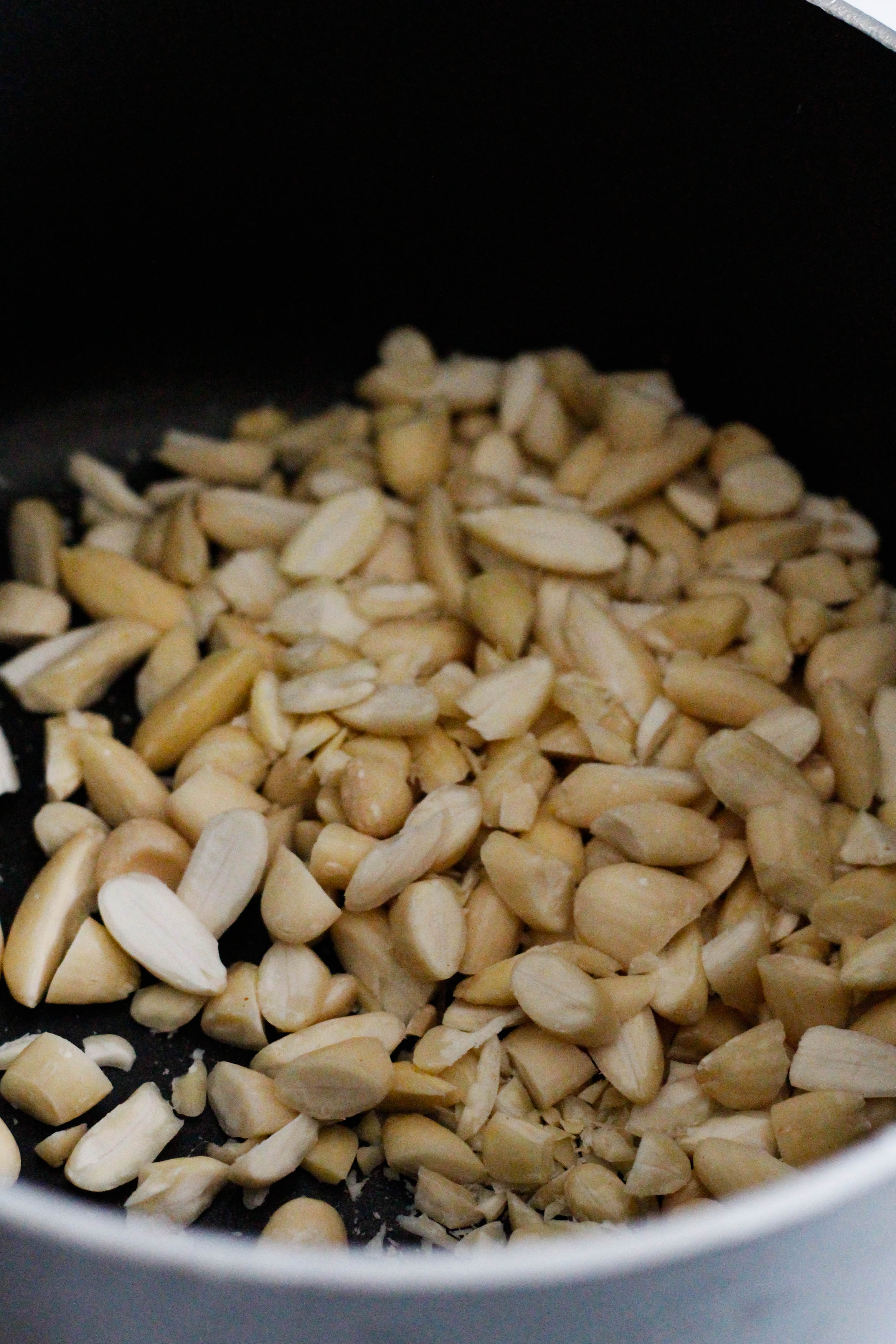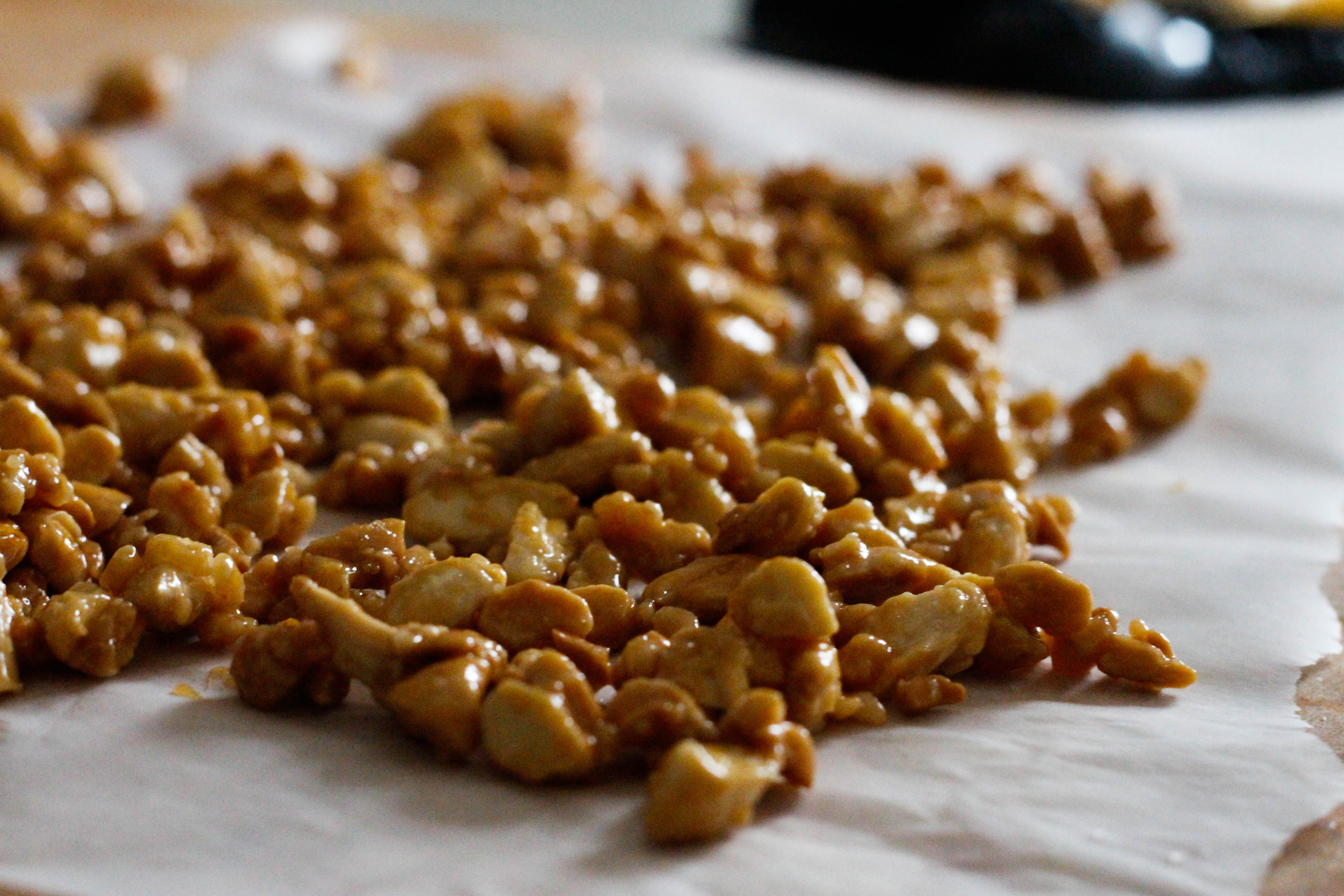 Melt the butter and sugar in a saucepan until pale amber in colour, then quickly stir through the almonds, coating them in the syrup.