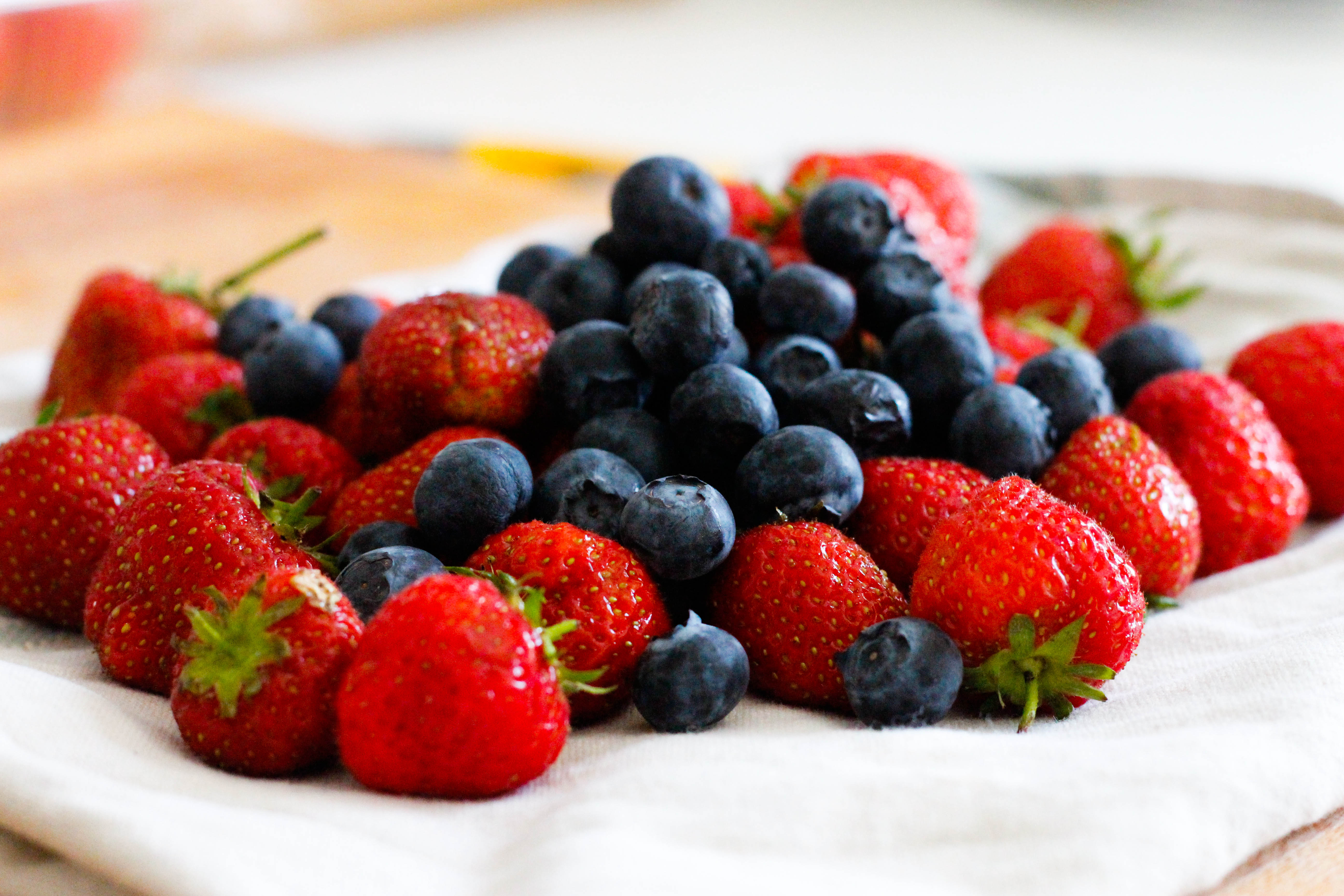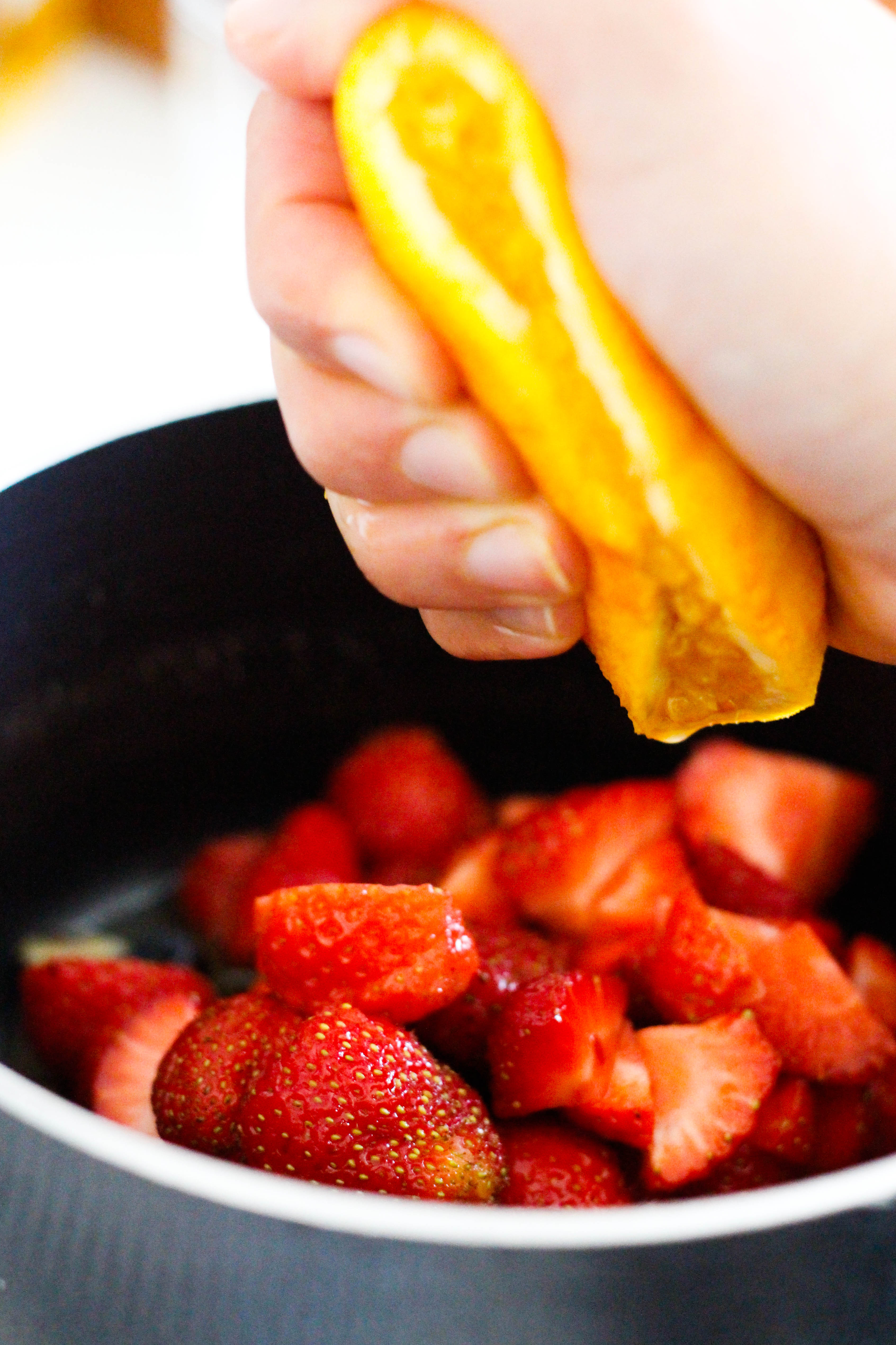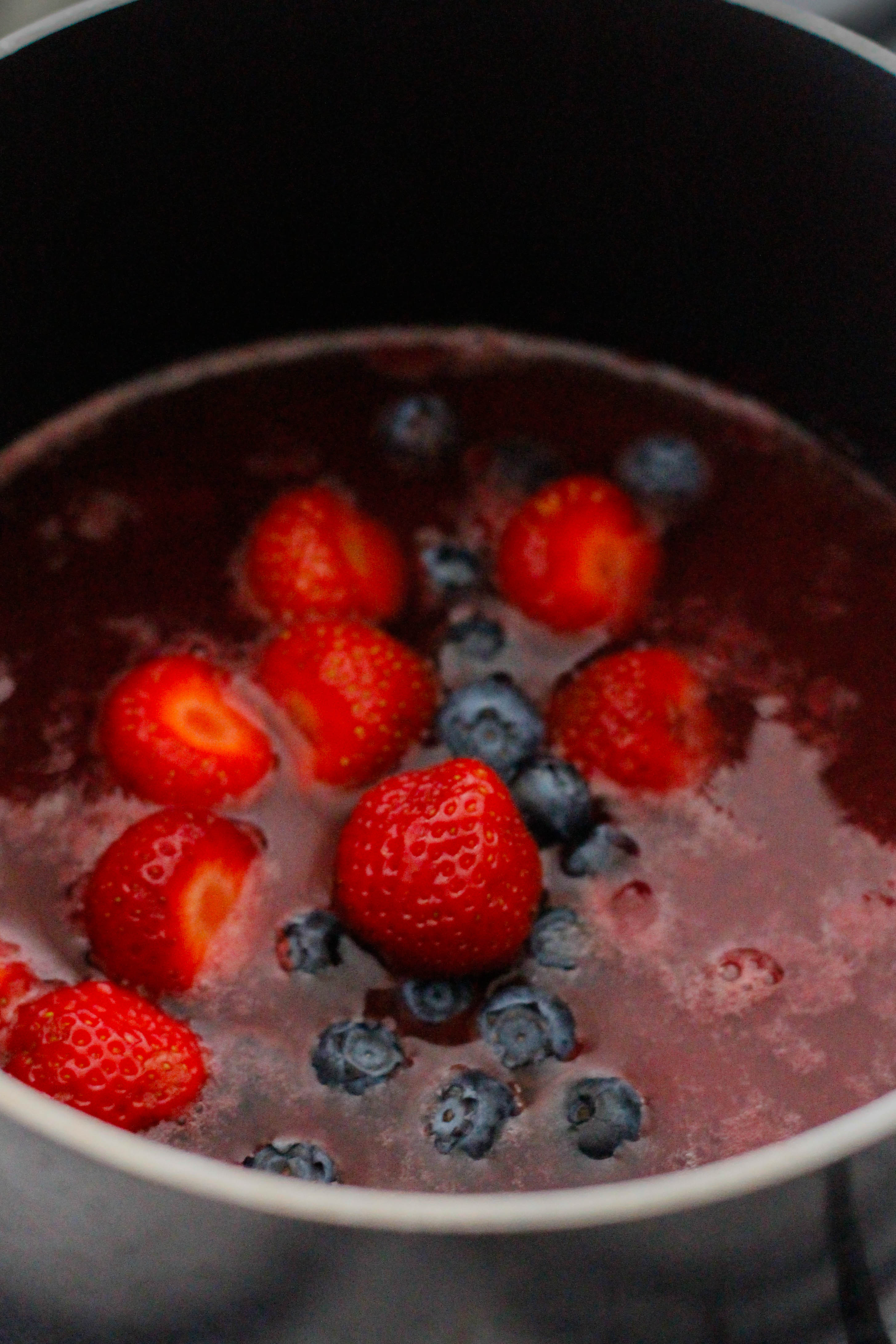 Set aside around 30 blueberries and 18 small strawberries, then slice the remaining berries and place in a saucepan with the sugar, orange juice and water.
