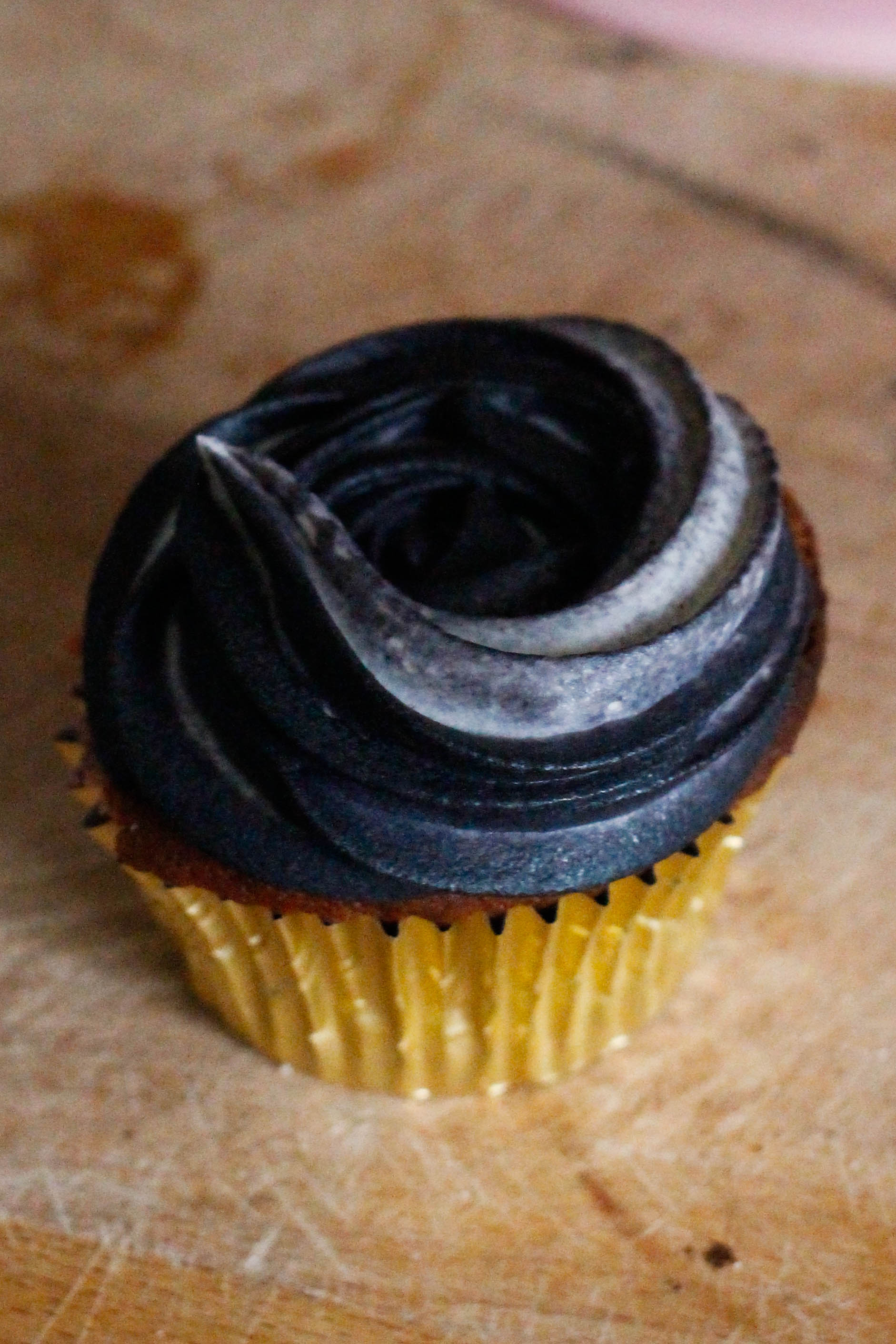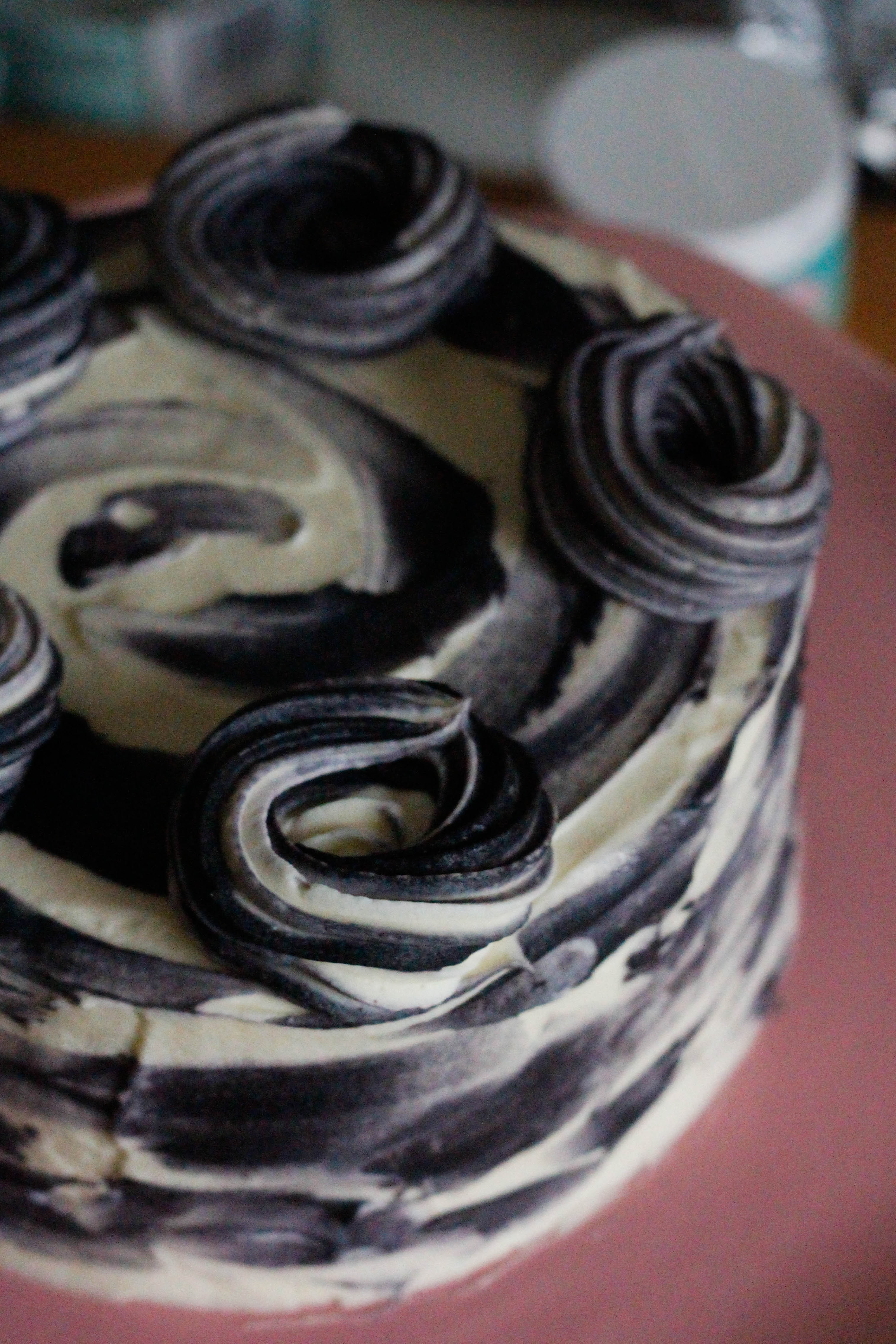Apply another layer of frosting to the cake, then take a few spoonfuls of the icing and colour with black food colouring. Use the back of a spoon to swipe dollops of the black icing onto the cake, blending it lightly as you go.