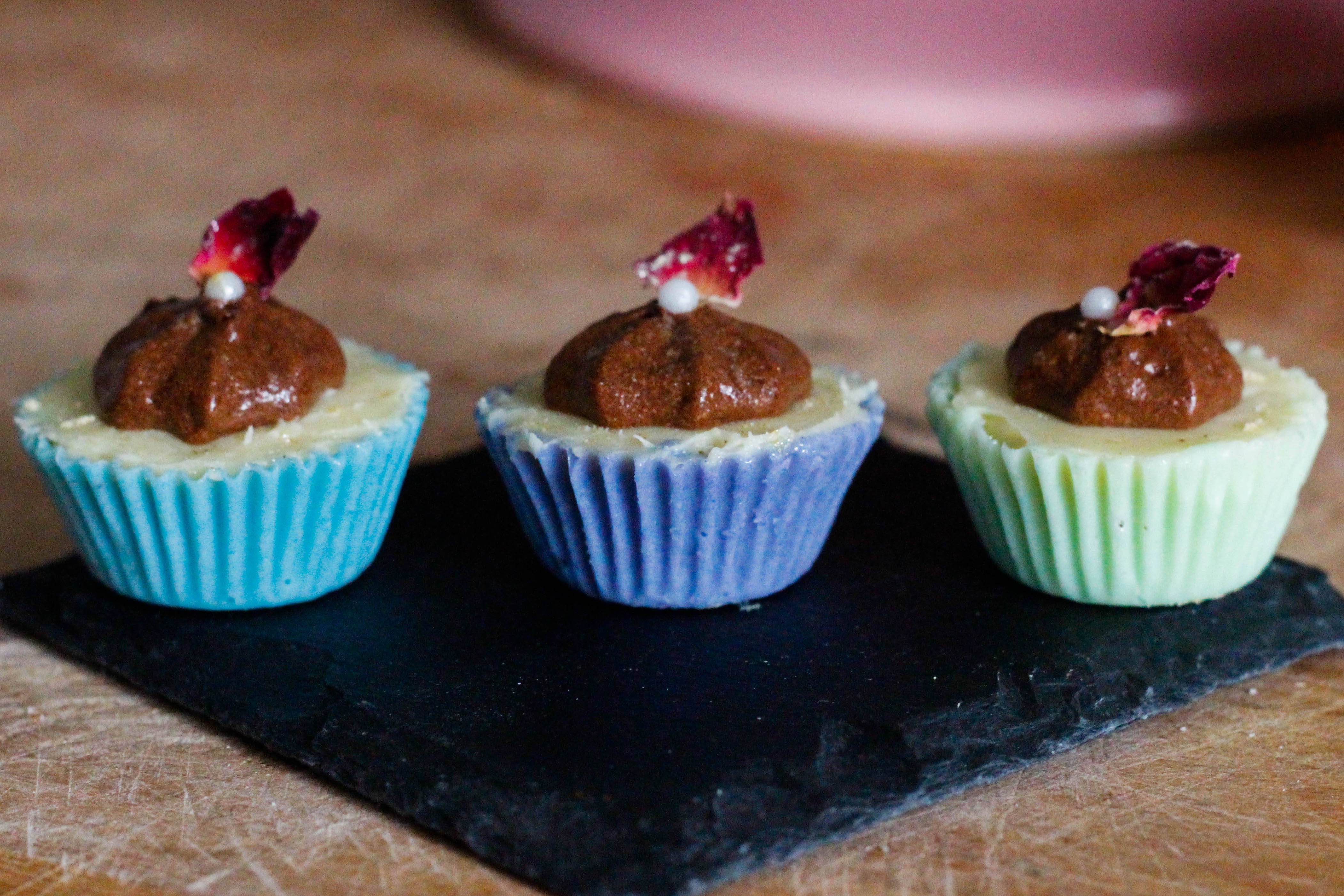 Line a mini cupcake tray with mini cupcake cases, then melt 100g of white chocolate either gently in the microwave or over a double boiler.