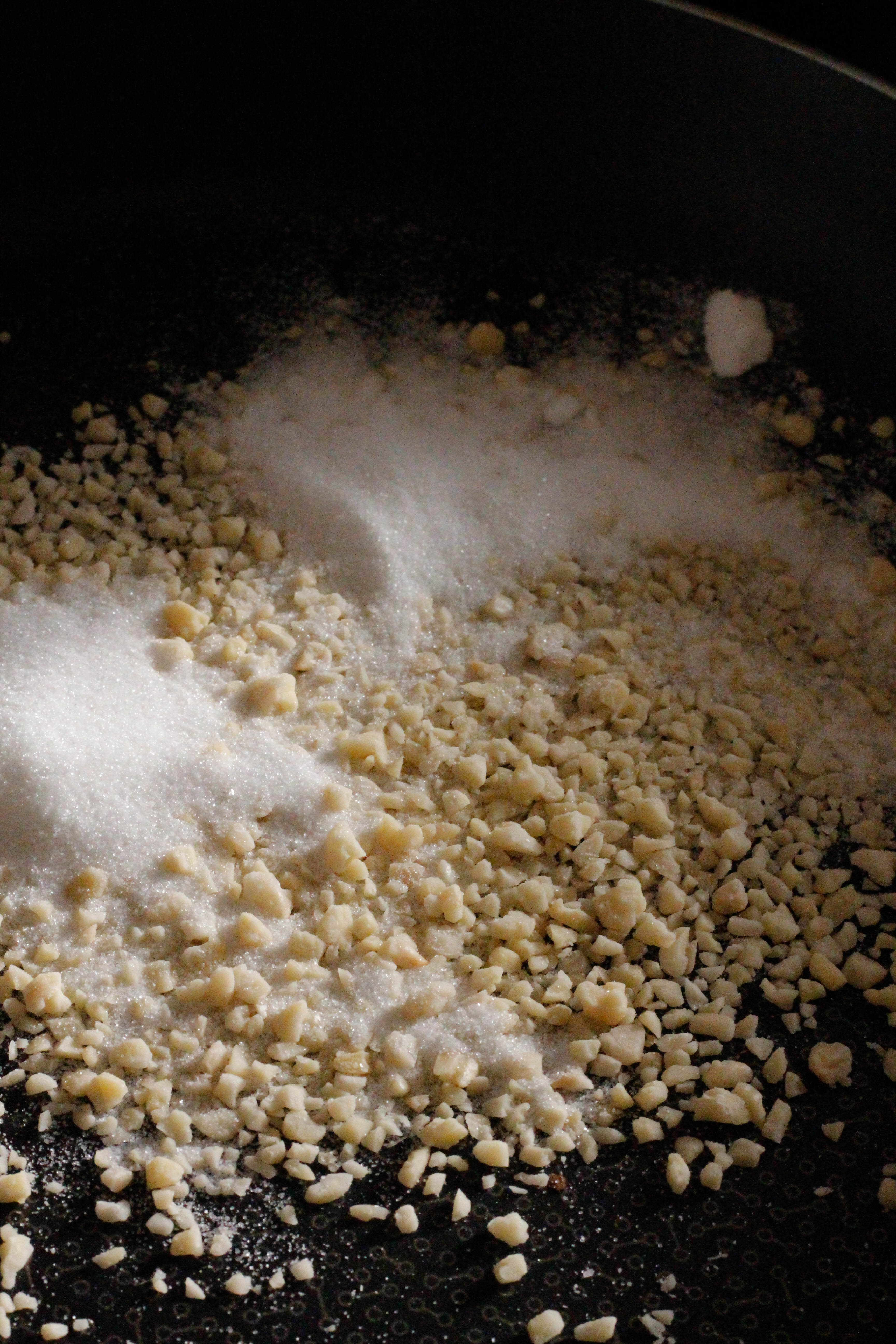 Heat the almonds and caster sugar in a non-stick pan, stirring occasionally. Once the sugar has melted, pour the almonds onto a baking sheet and leave to cool completely.