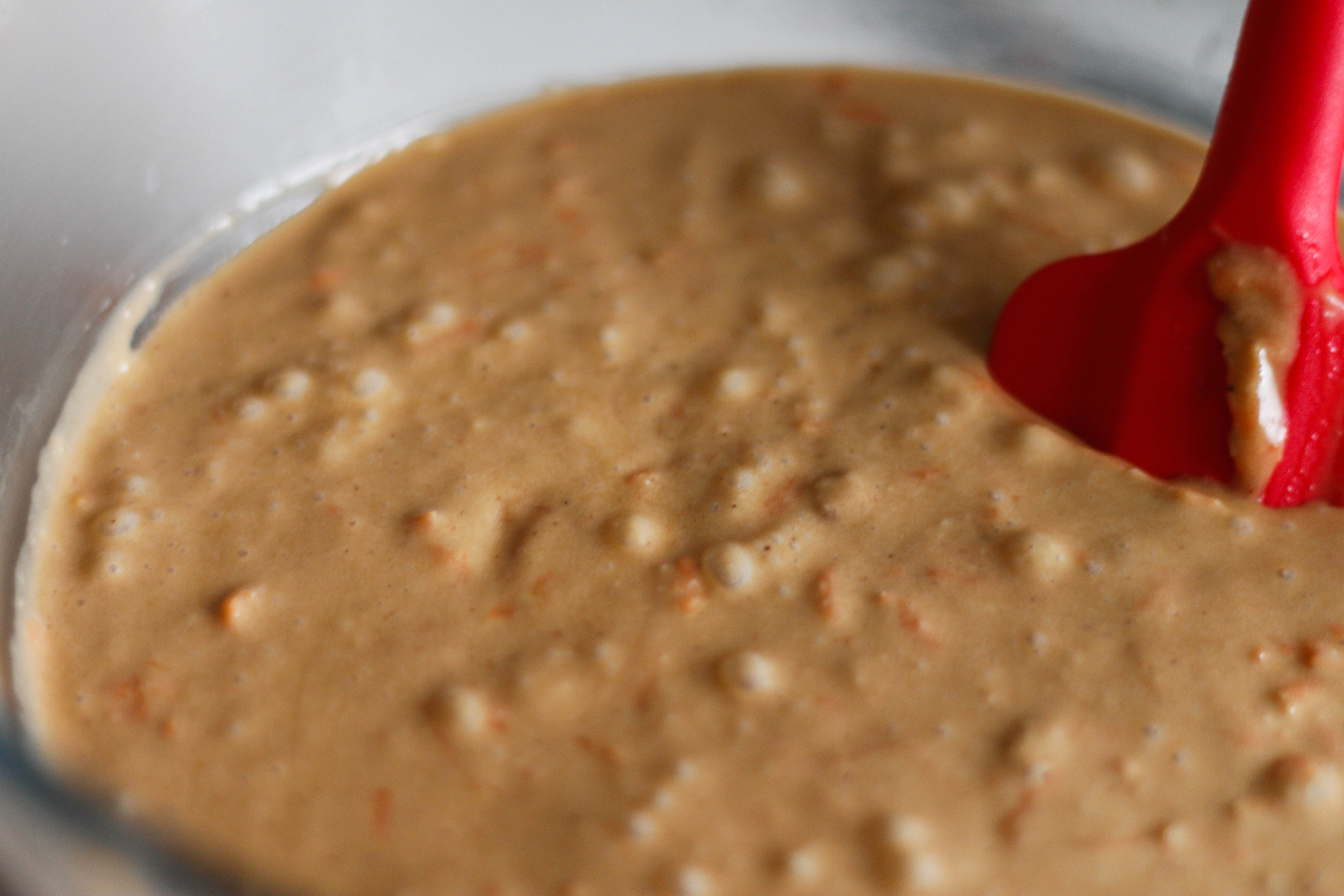 Beat the flour mixture into the sugar mixture, then stir in the orange soaked walnuts and grated carrot.
