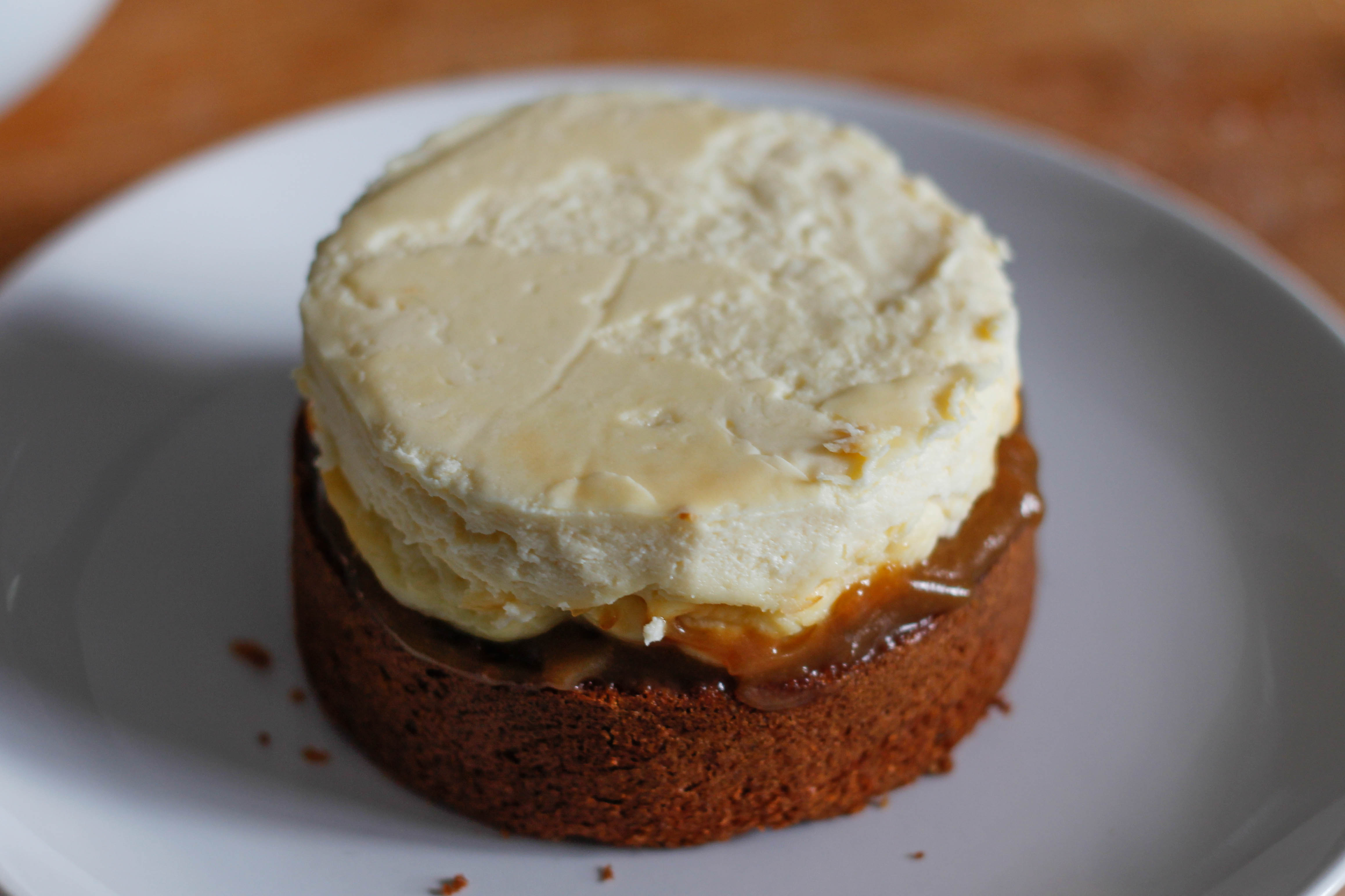 Smooth a layer of caramel over the cheesecake, then place the other half of the carrot cake on top. Refrigerate for twenty minutes before crumb coating.