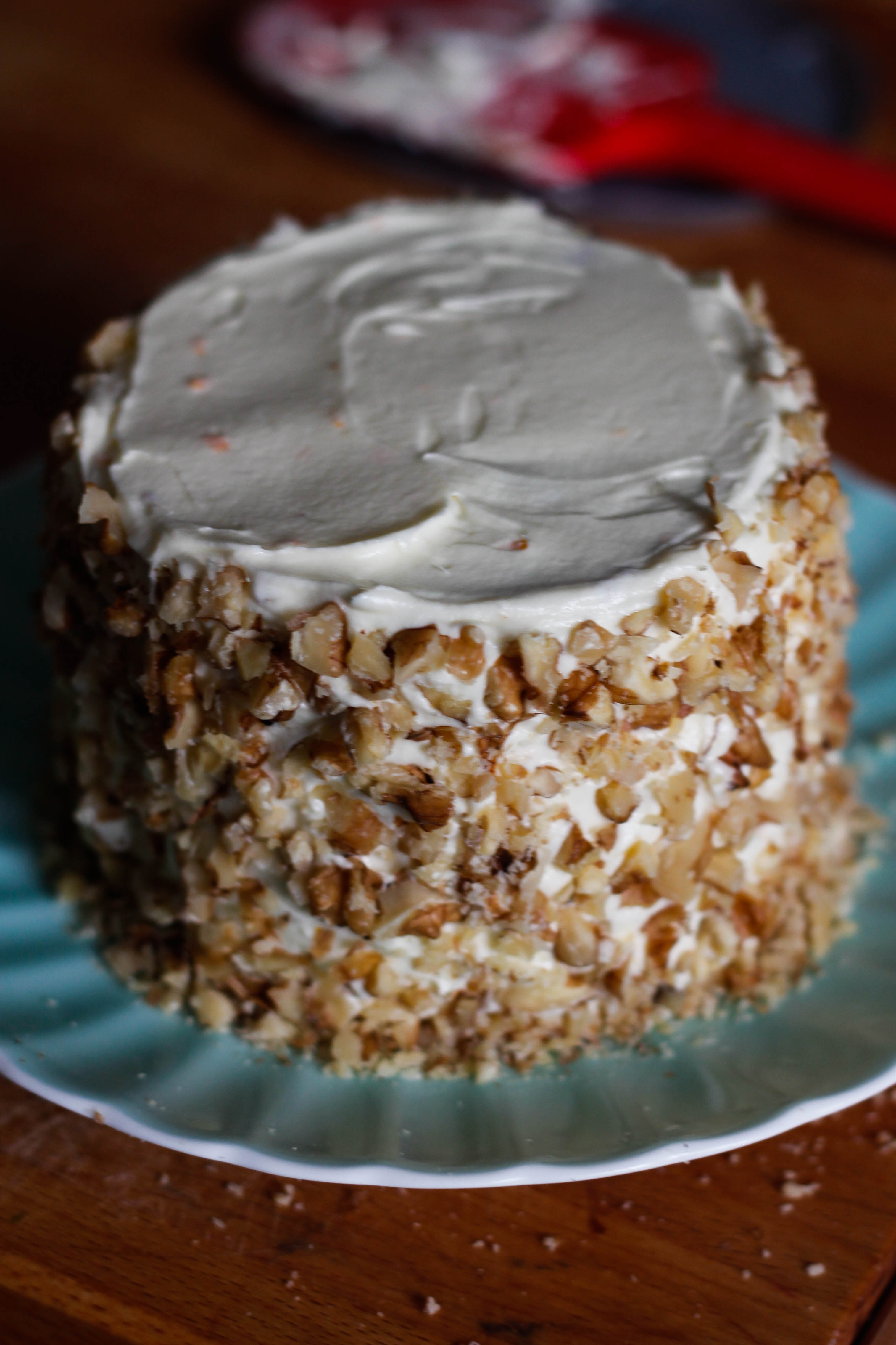 Take the cake from the refrigerator, then smooth a thin layer of frosting over the entire cake and refrigerate again for twenty minutes. Cover the cake in another layer of frosting, smoothing to your desired finish, then cover the sides with chopped walnuts.