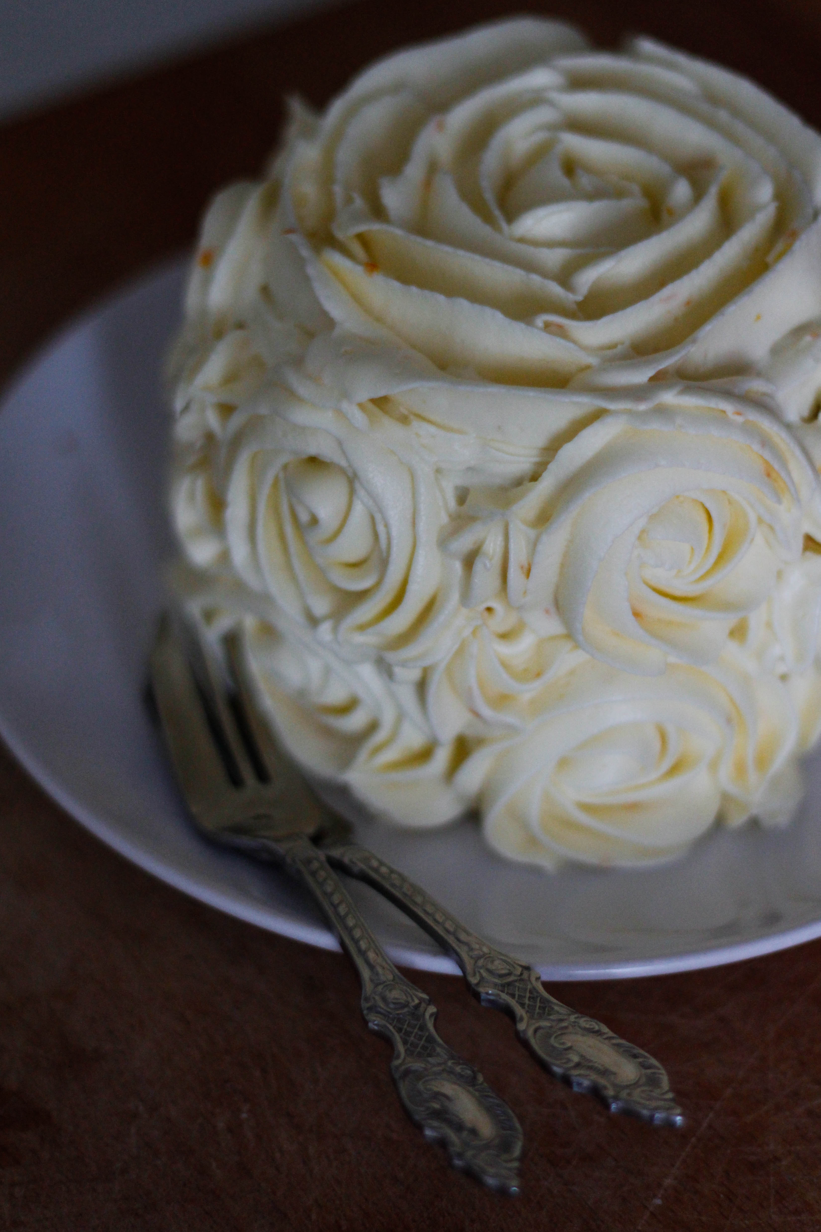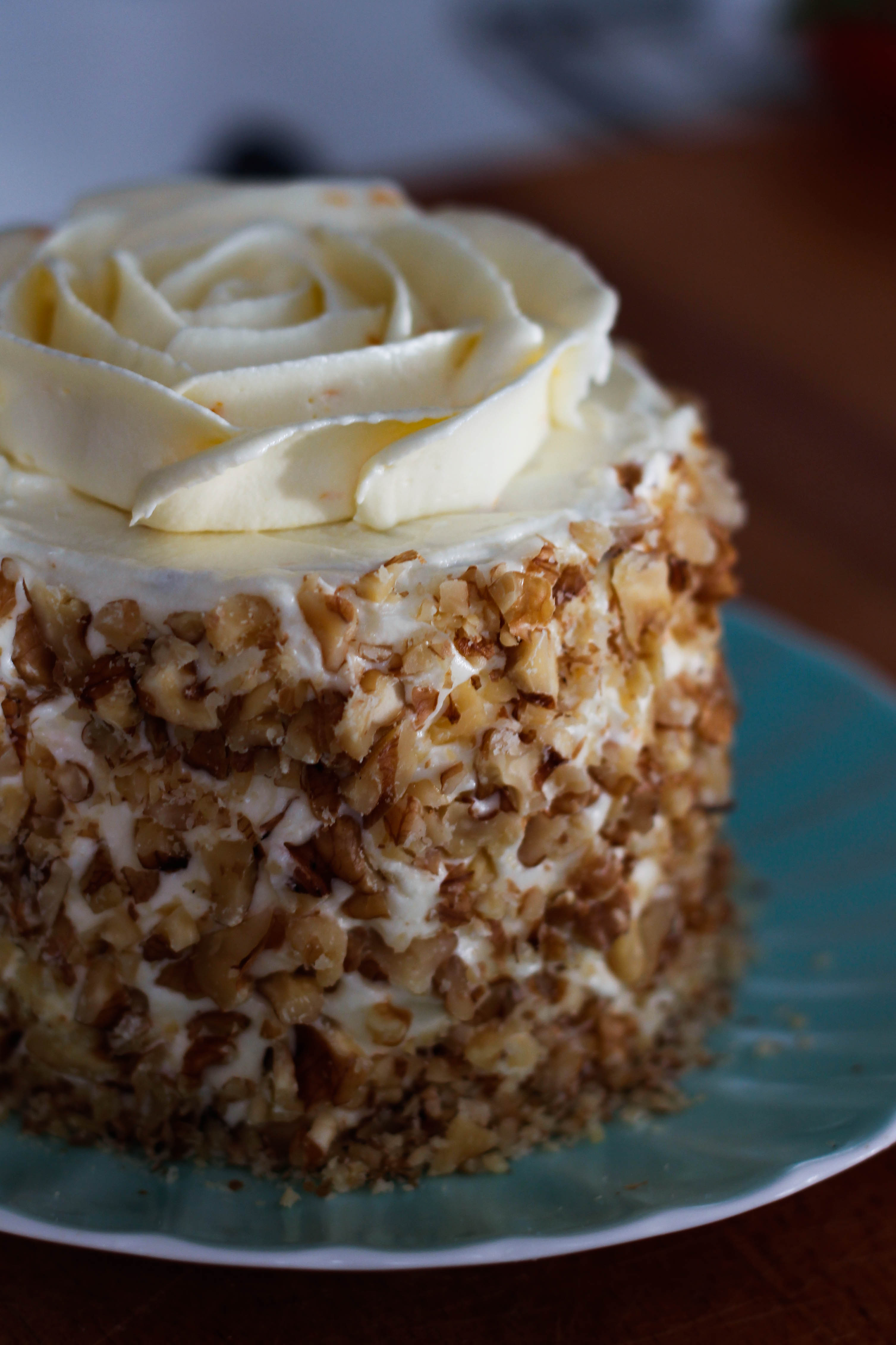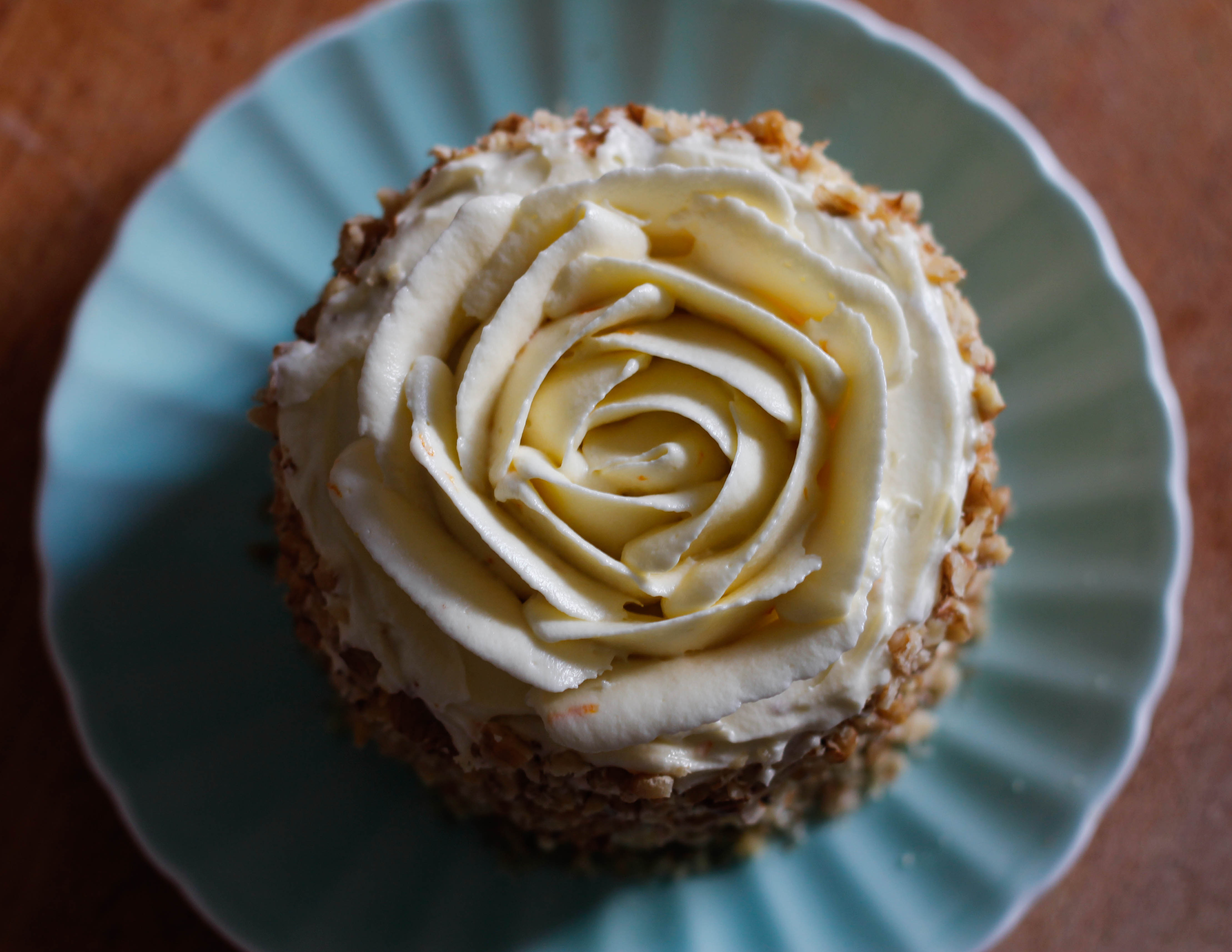 Decorate the cake as you like, I used a large petal tip for the frosting design on the top. For the cake without the walnuts I used an open star tip, piping directly onto the first layer of frosting (the crumb coat).