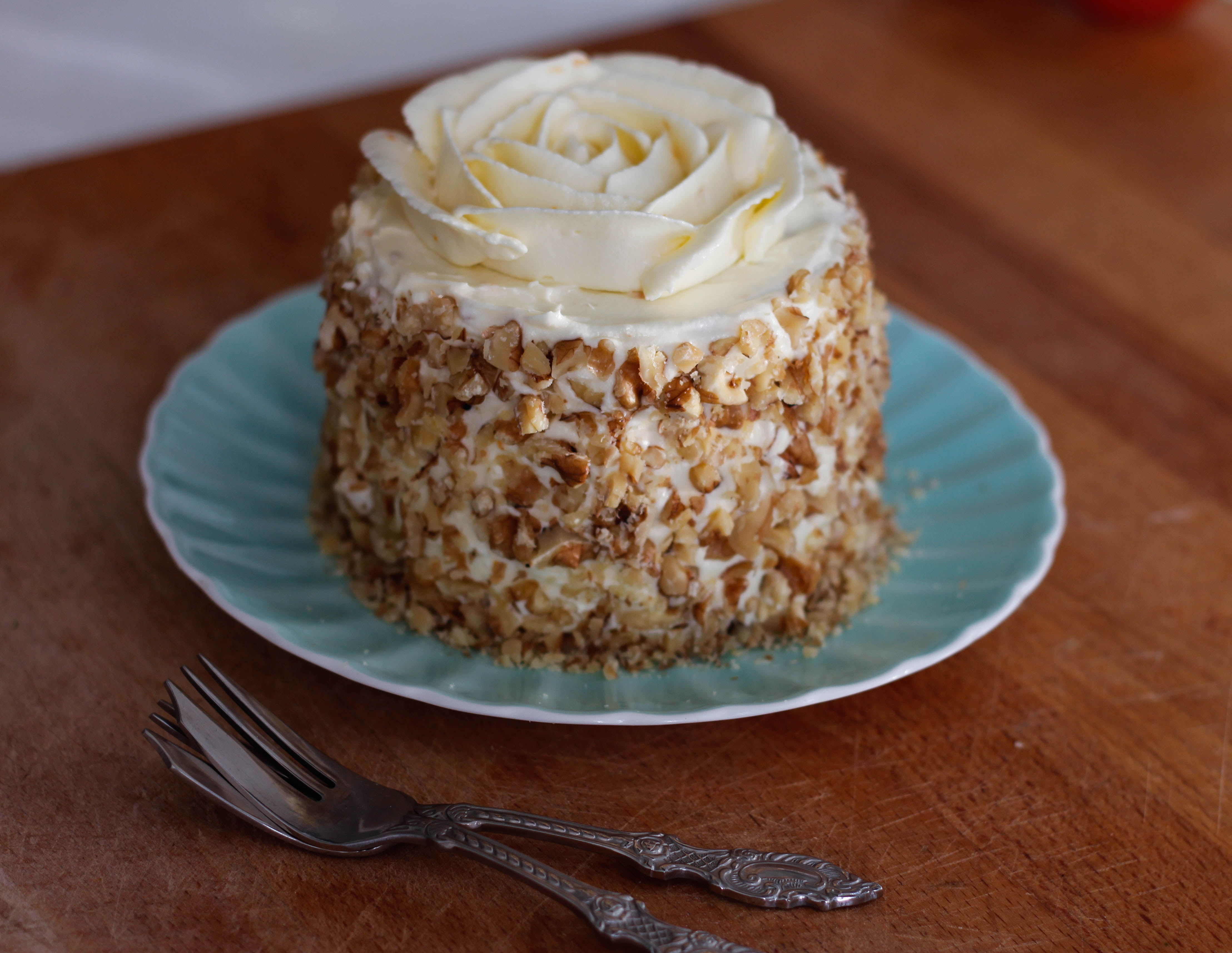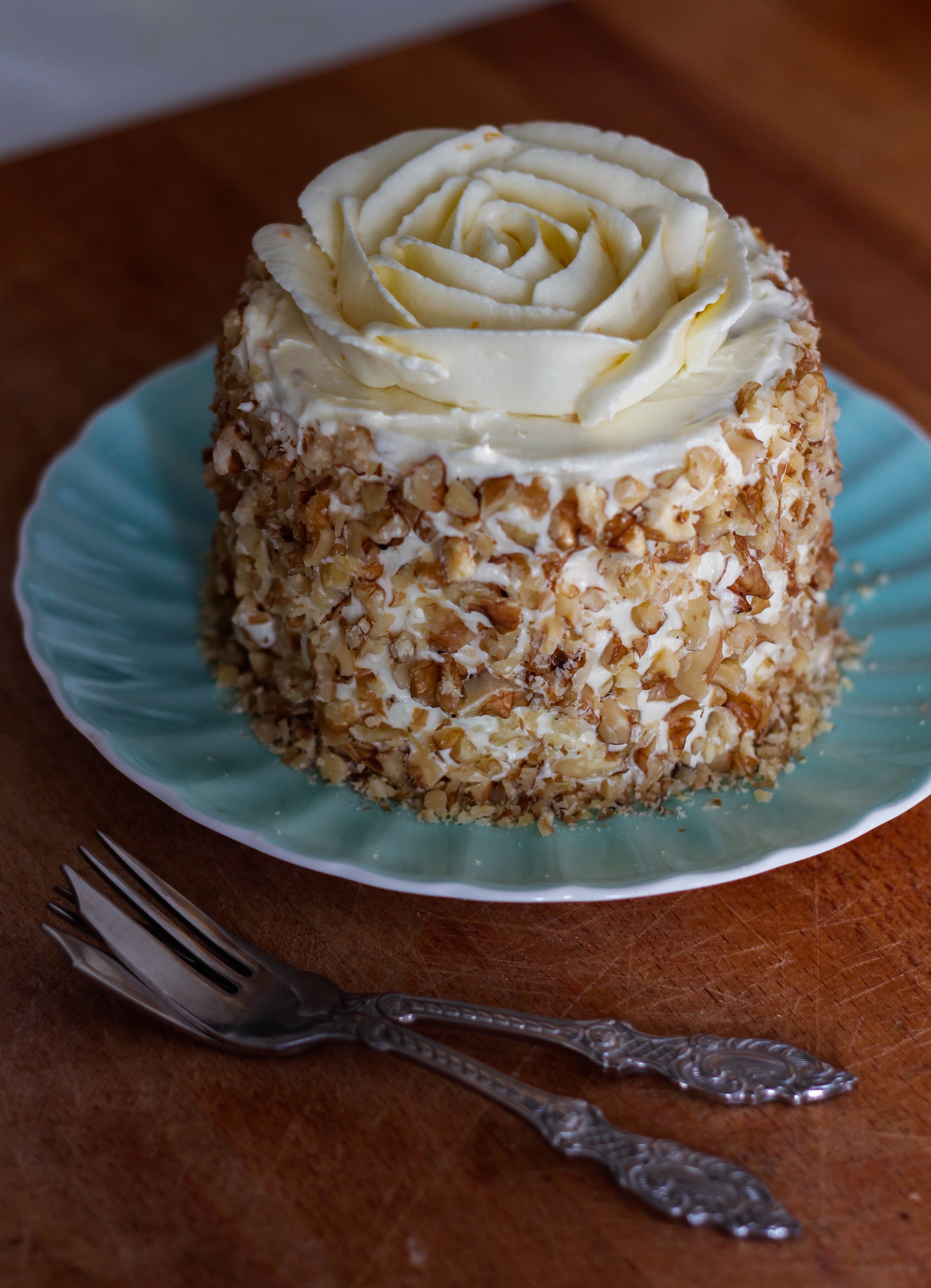 I actually made two cakes, one decorated with walnuts and one without, as you can see in the images. The recipe below is for one 4″ cake, which is more than enough for two people (really, it could probably do four!).