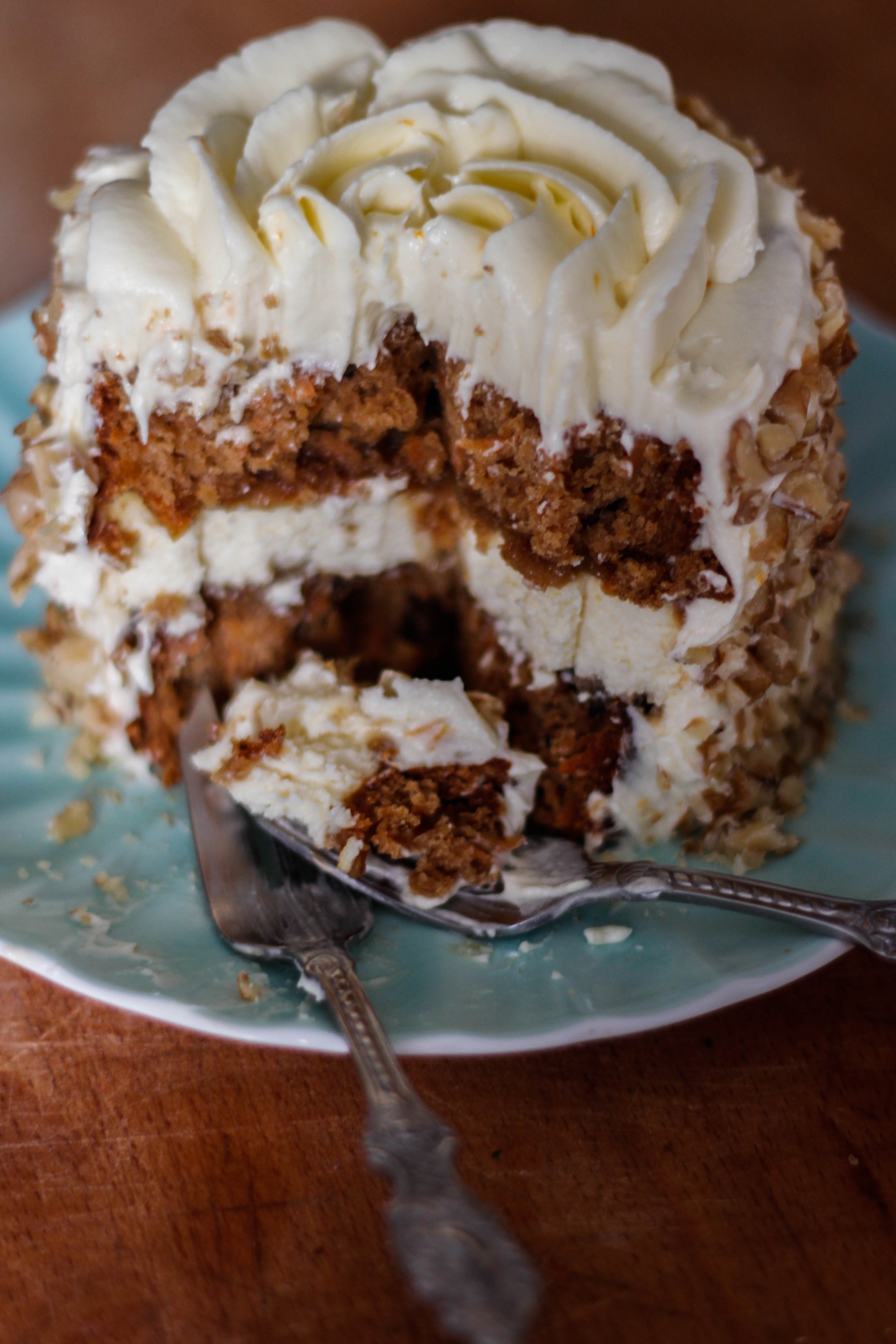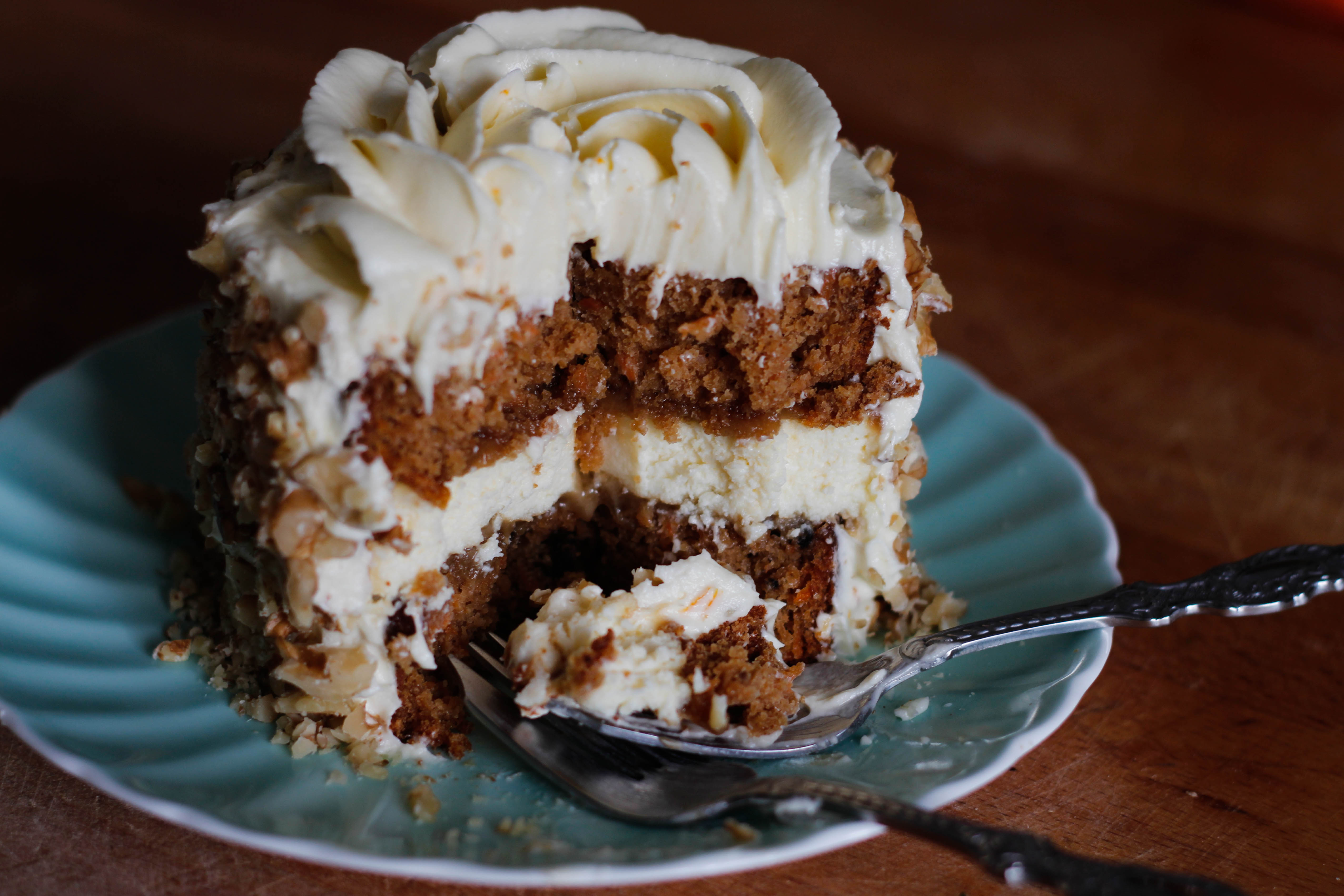 A New York style cheesecake, sandwiched between layers of light, fluffy carrot cake… That could definitely work. Better throw some caramel in there too, for good measure. He devours anything caramel. Alright, I mean I devour anything caramel. And anything chocolate. Who am I kidding, I devour anything cake, really.