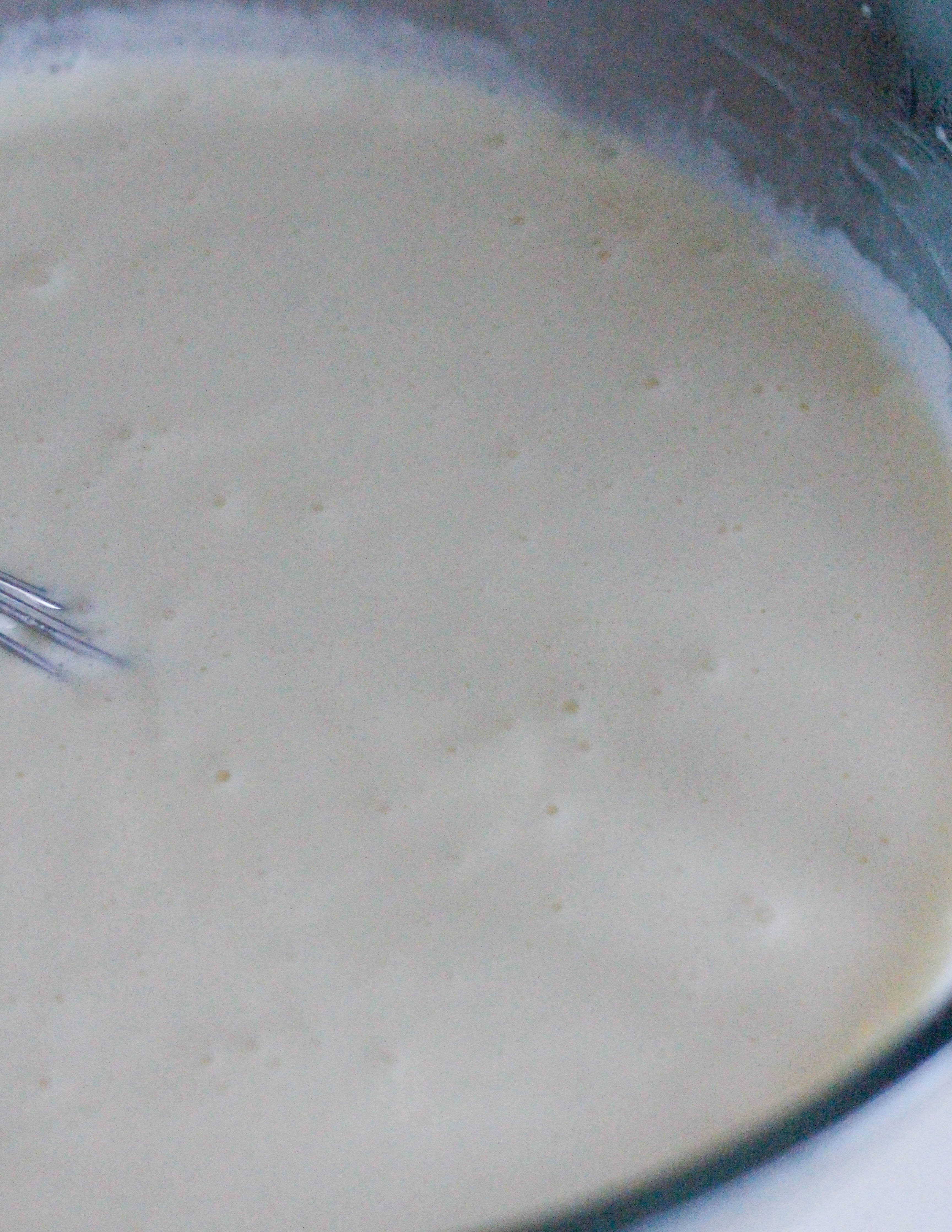 Remove the milk mixture from the heat and strain into a jug. Leave to rest for a minute, then pour the milk mixture onto the egg yolks and whisk together.