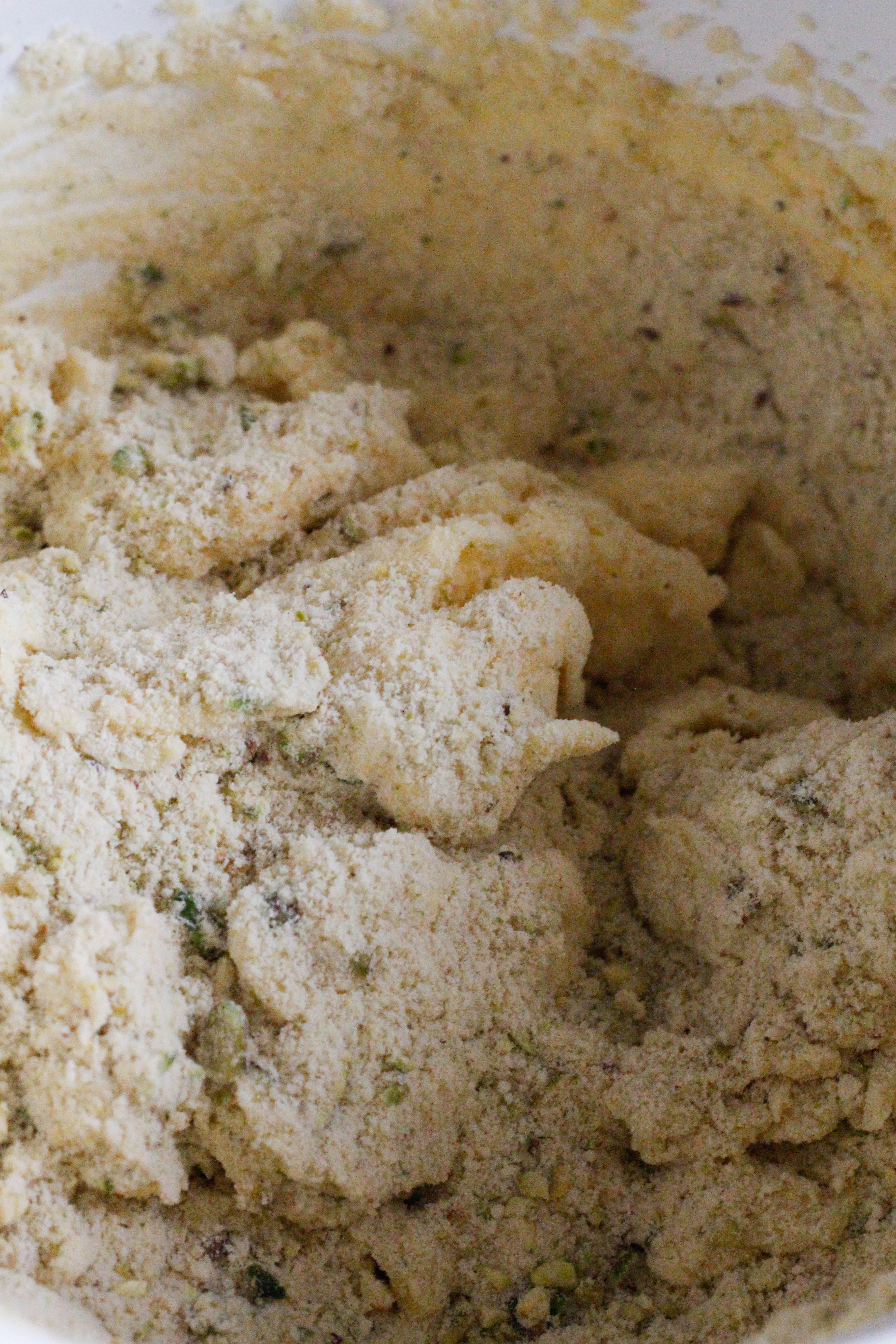 Grind the cardamom seeds to a fine powder using a mortar and pestle, then combine the ground cardamom, semolina flour, almond meal, chopped pistachios and baking powder in a bowl and set aside.