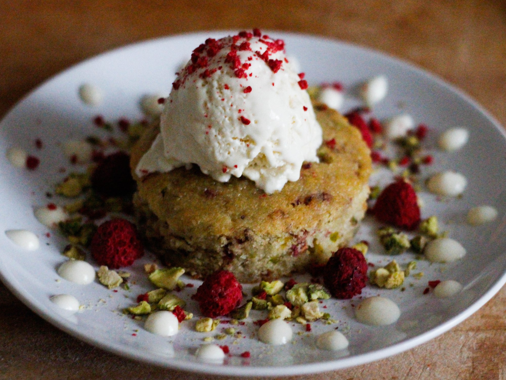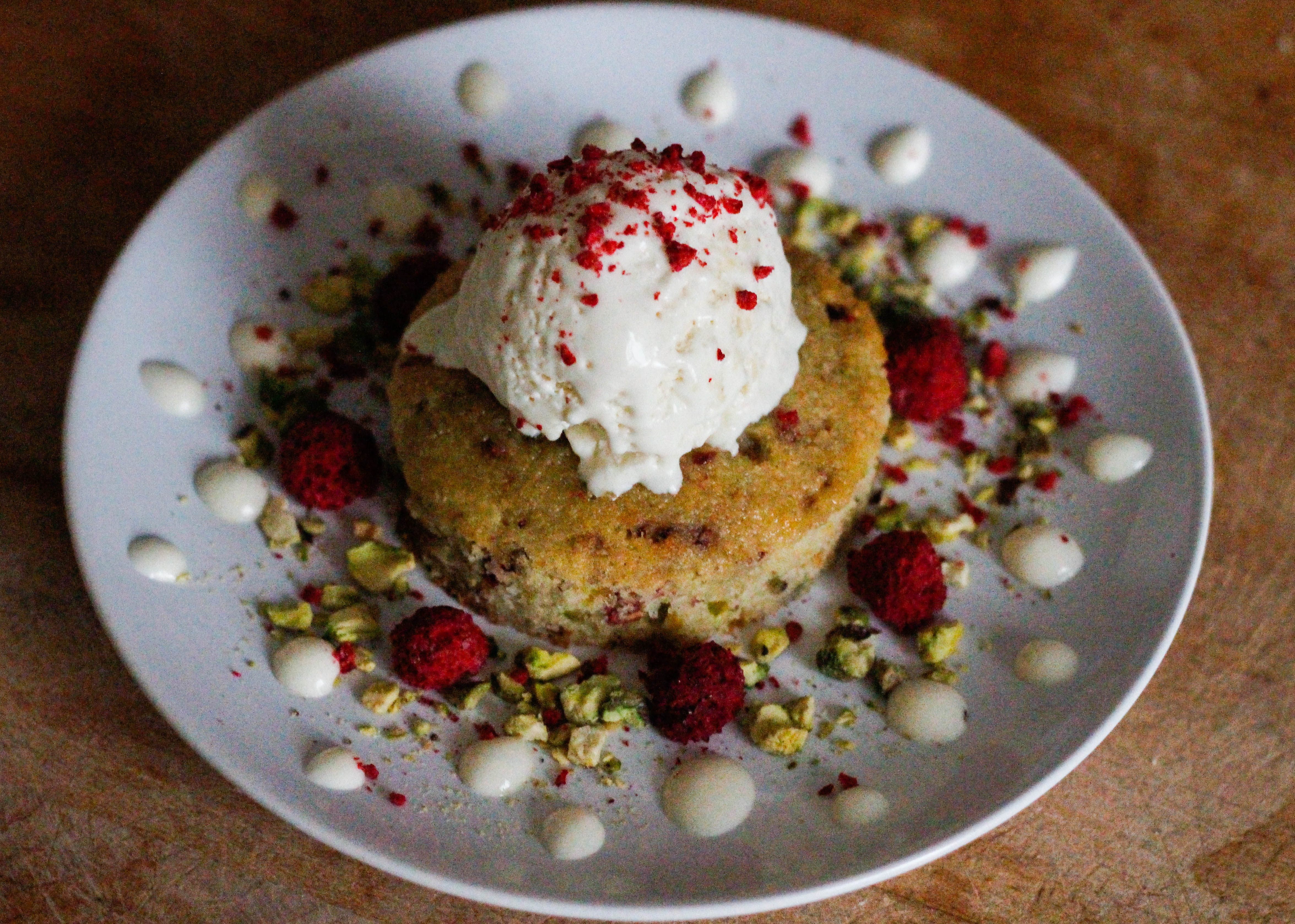 A delicate semolina cake flavoured with cardamom, pistachio and freeze-dried raspberry pieces, soaked in a rose water syrup and served with a white chocolate & rose mousse, chopped pistachios, crushed freeze-dried raspberries and creamy coconut ice cream.