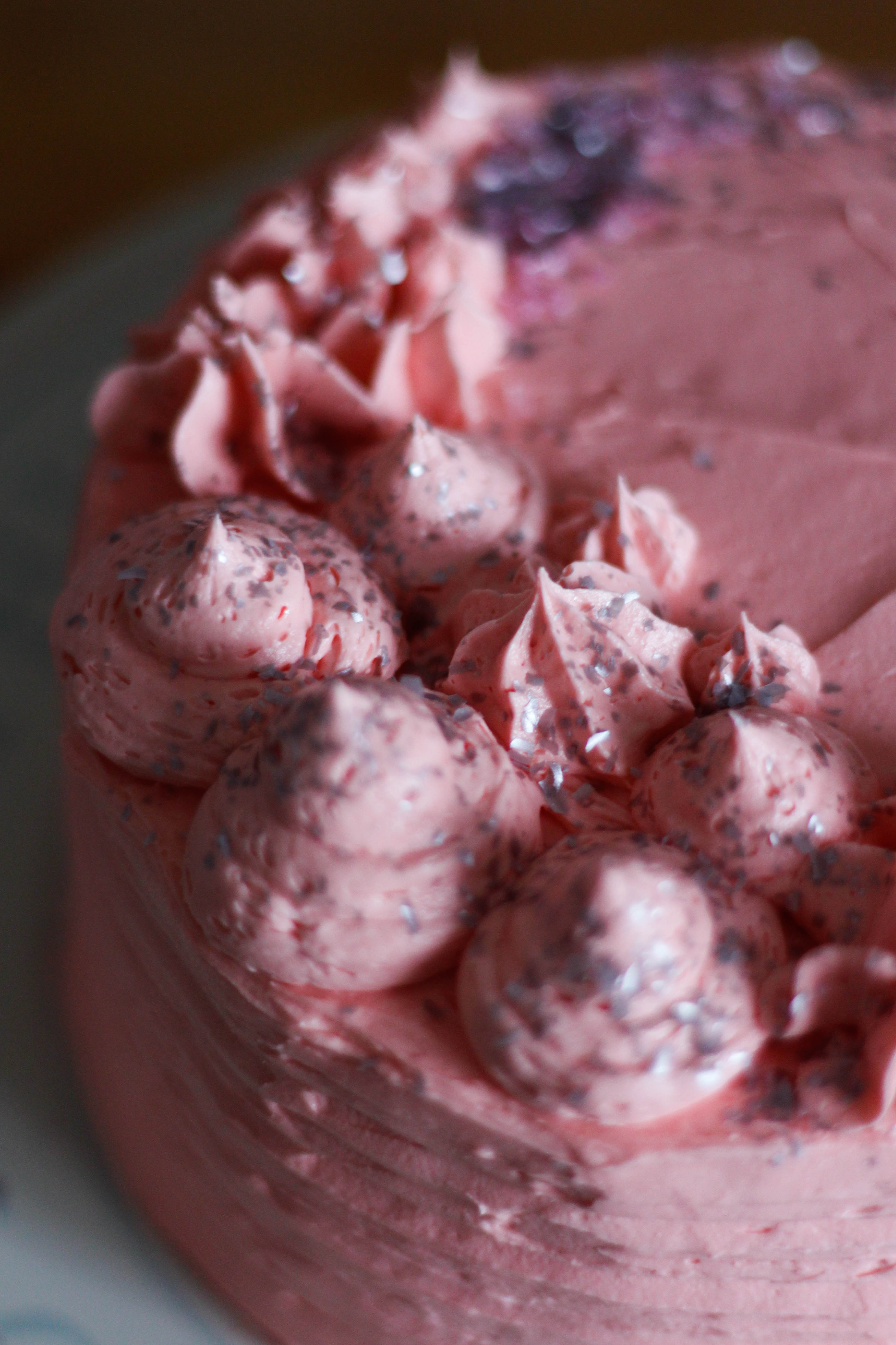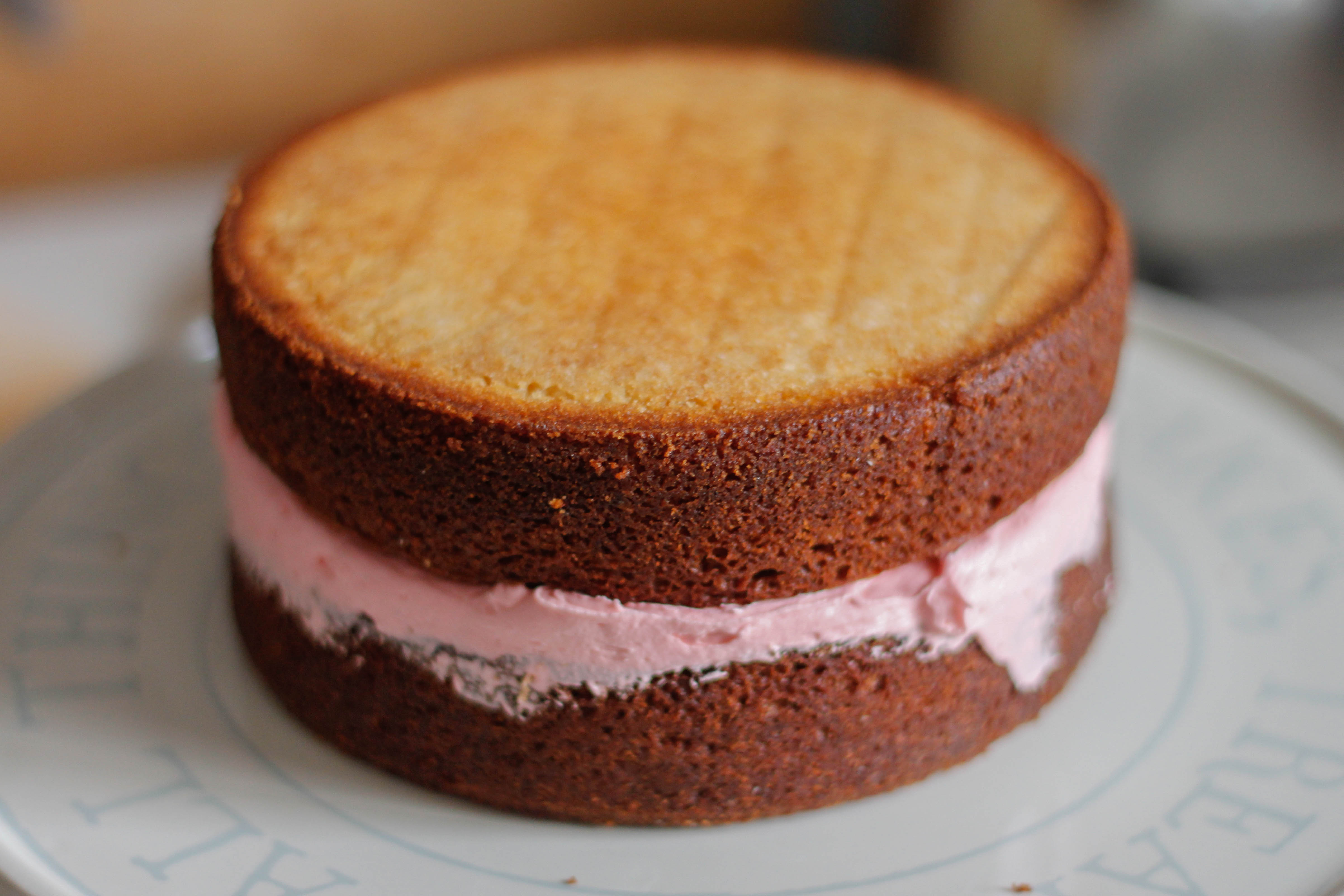 Place one completely cool cake layer onto your cake stand or cake board and cover with a thick layer of buttercream, levelling it out as evenly as you can, then place the second cake layer on top.