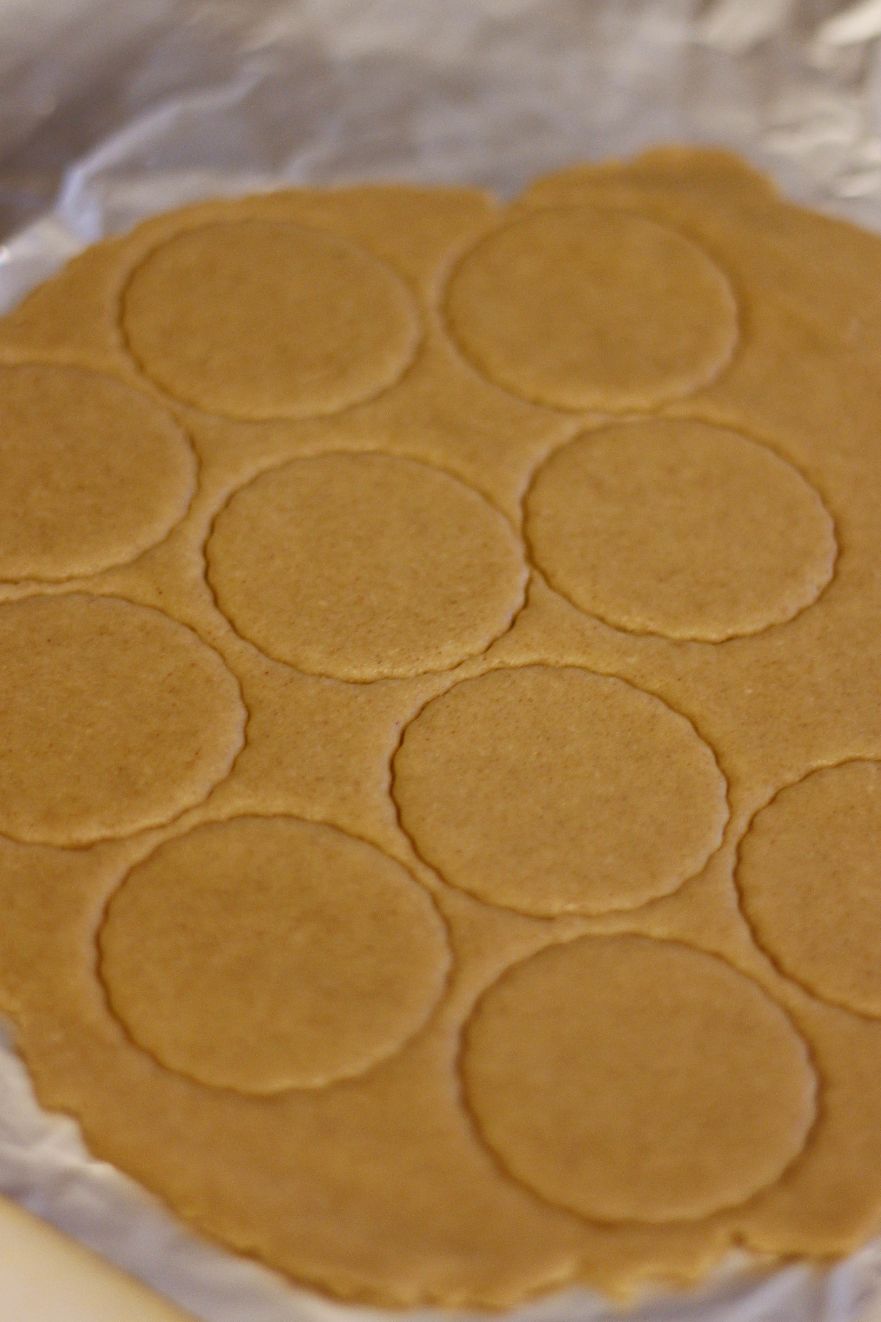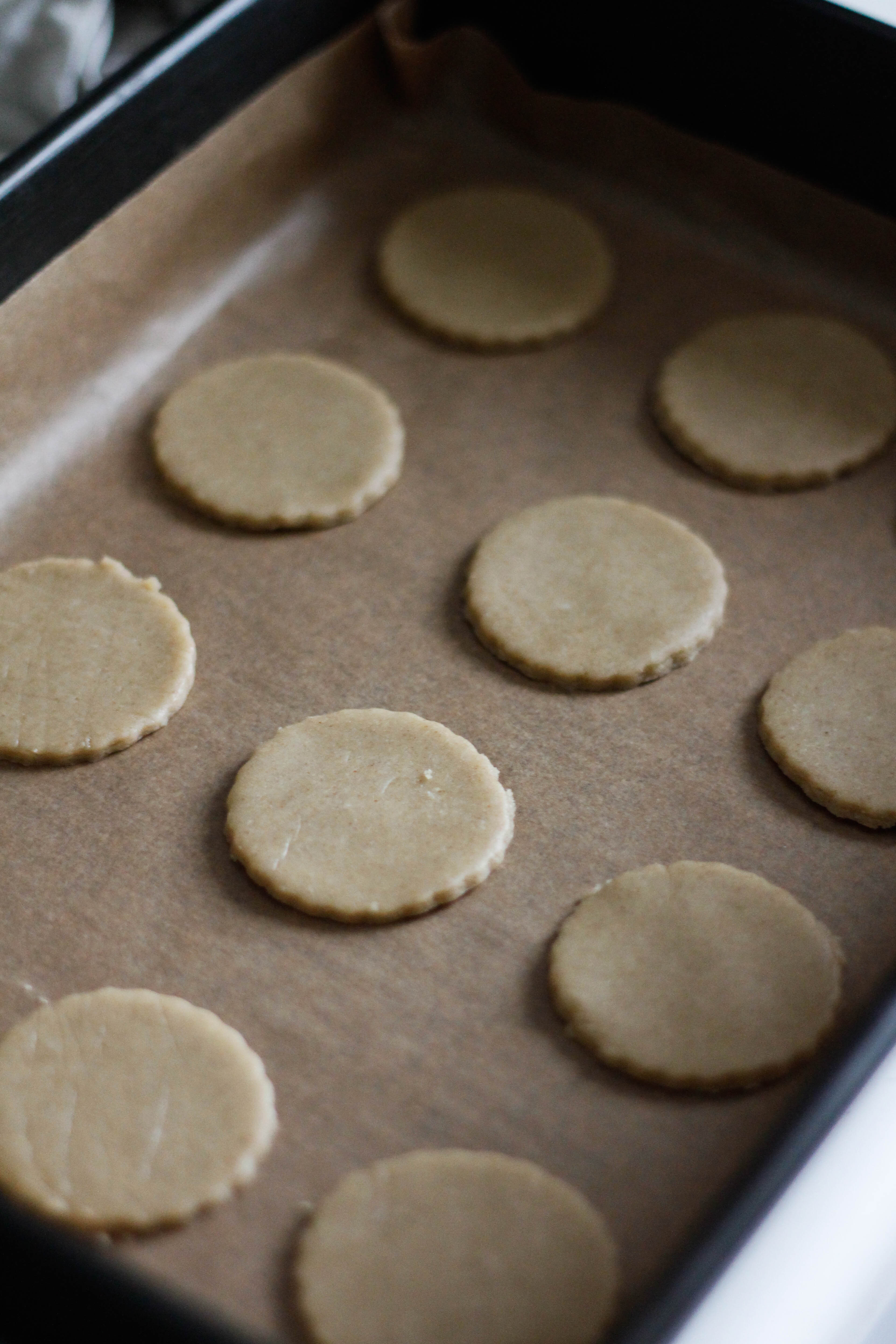 Cut the dough into rounds using a cookie cutter or oiled water glass, and then place them onto the prepared baking tray. Only cut out enough dough rounds to fill your tray, and then wrap the remaining dough back up in cling film until you are ready to make the next batch.