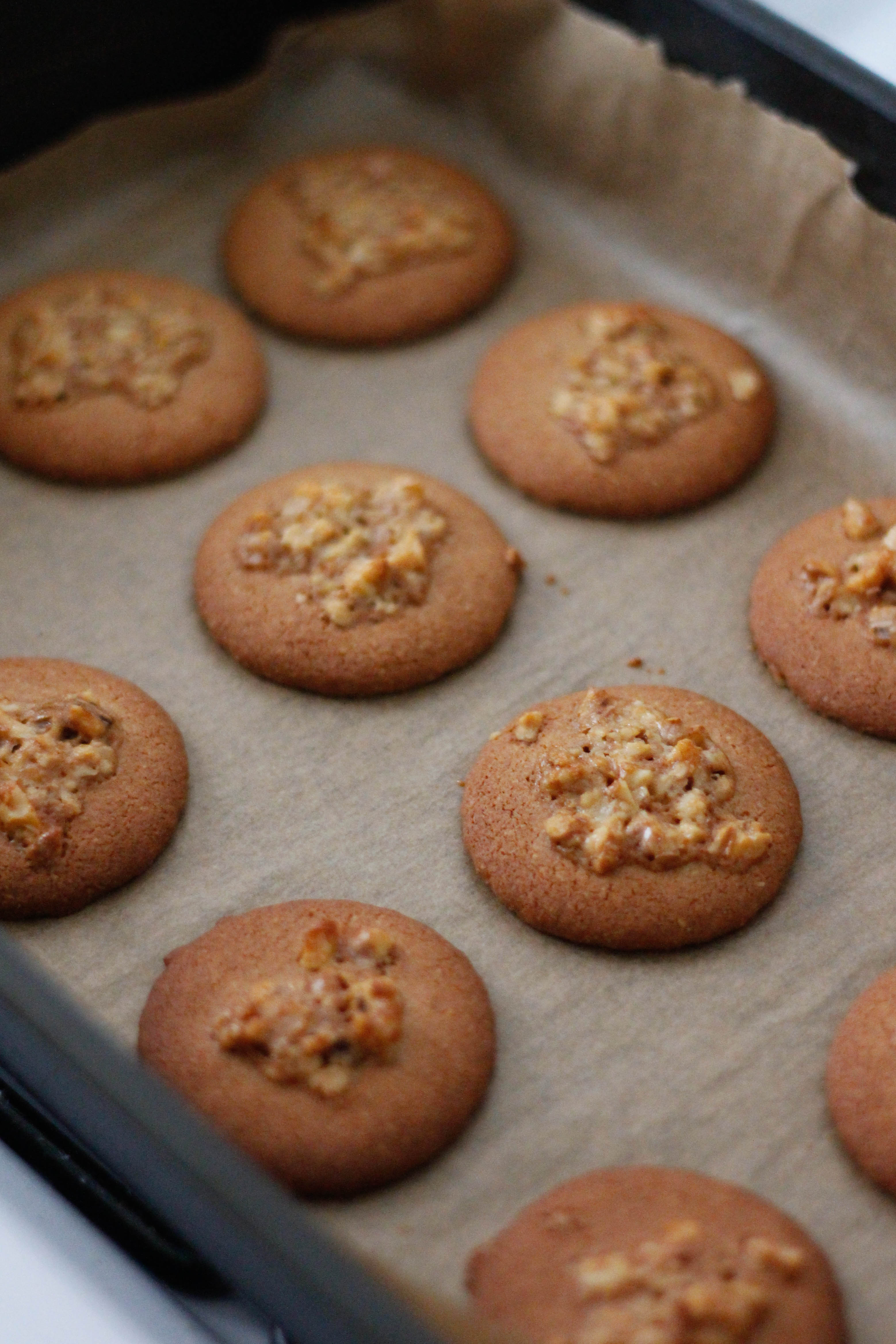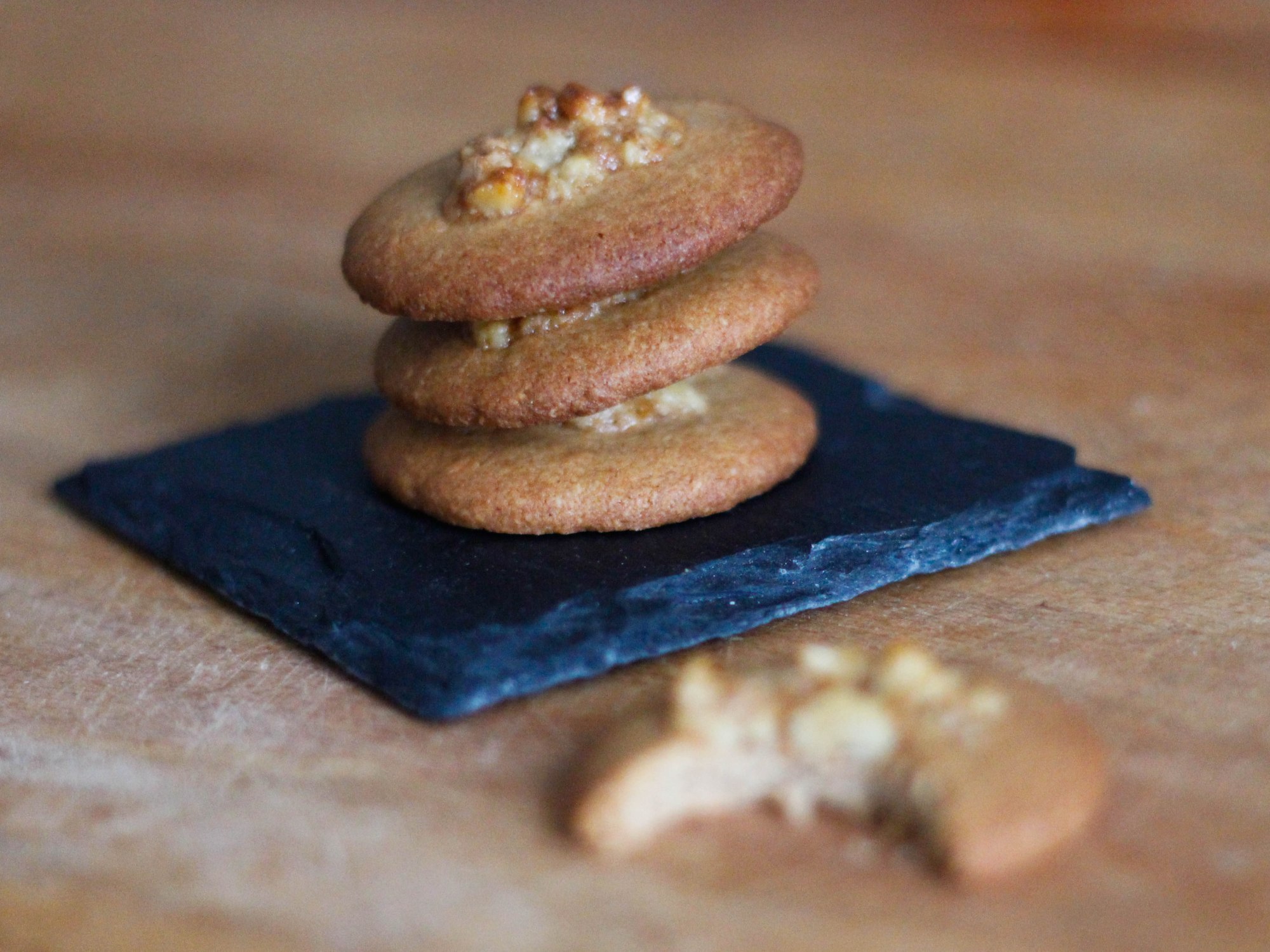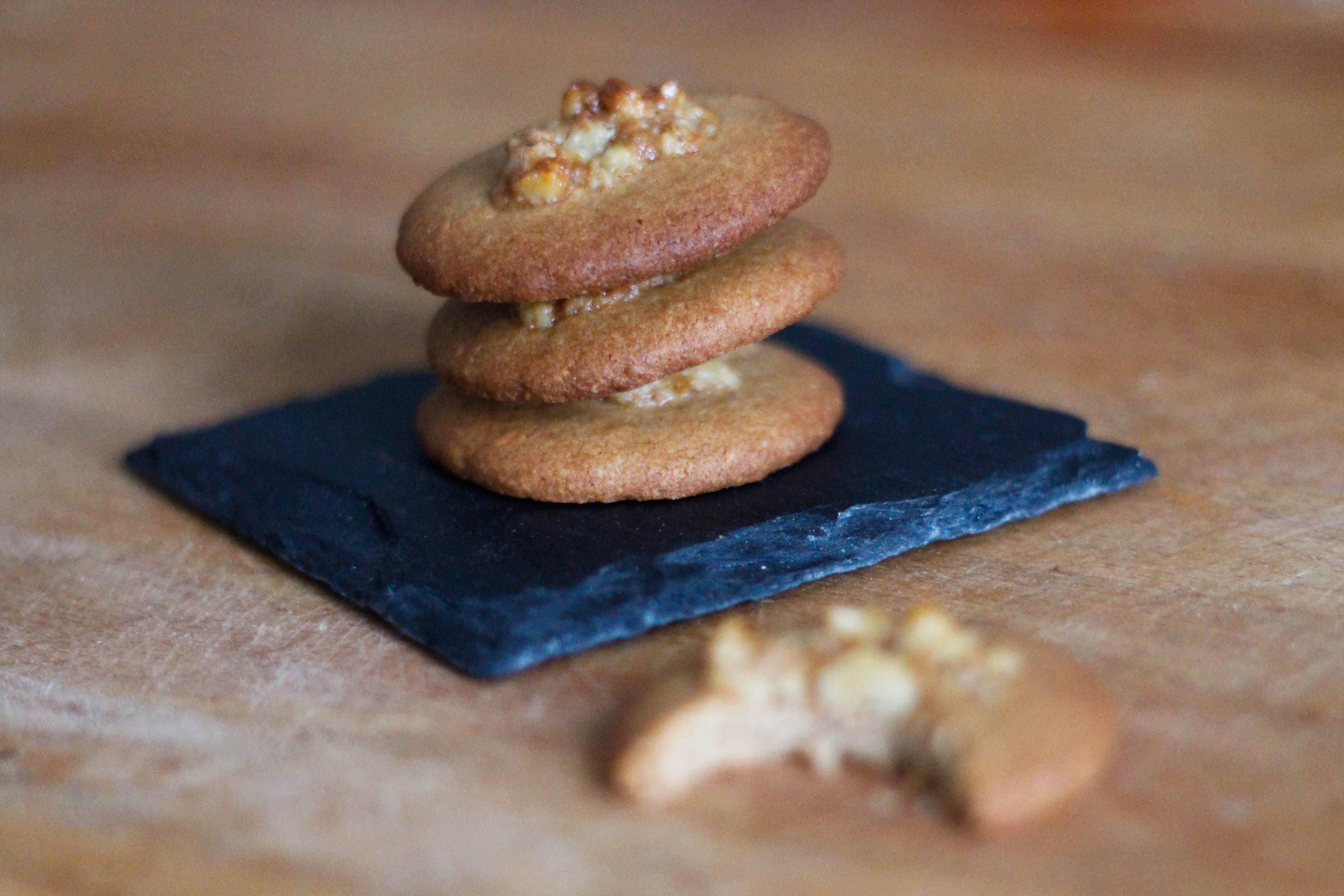 Melt the butter and honey in a saucepan over medium heat, then pour the combined melted mixture over the nuts and stir to combine. Allow to cool slightly before placing a teaspoon on top of each biscuit.