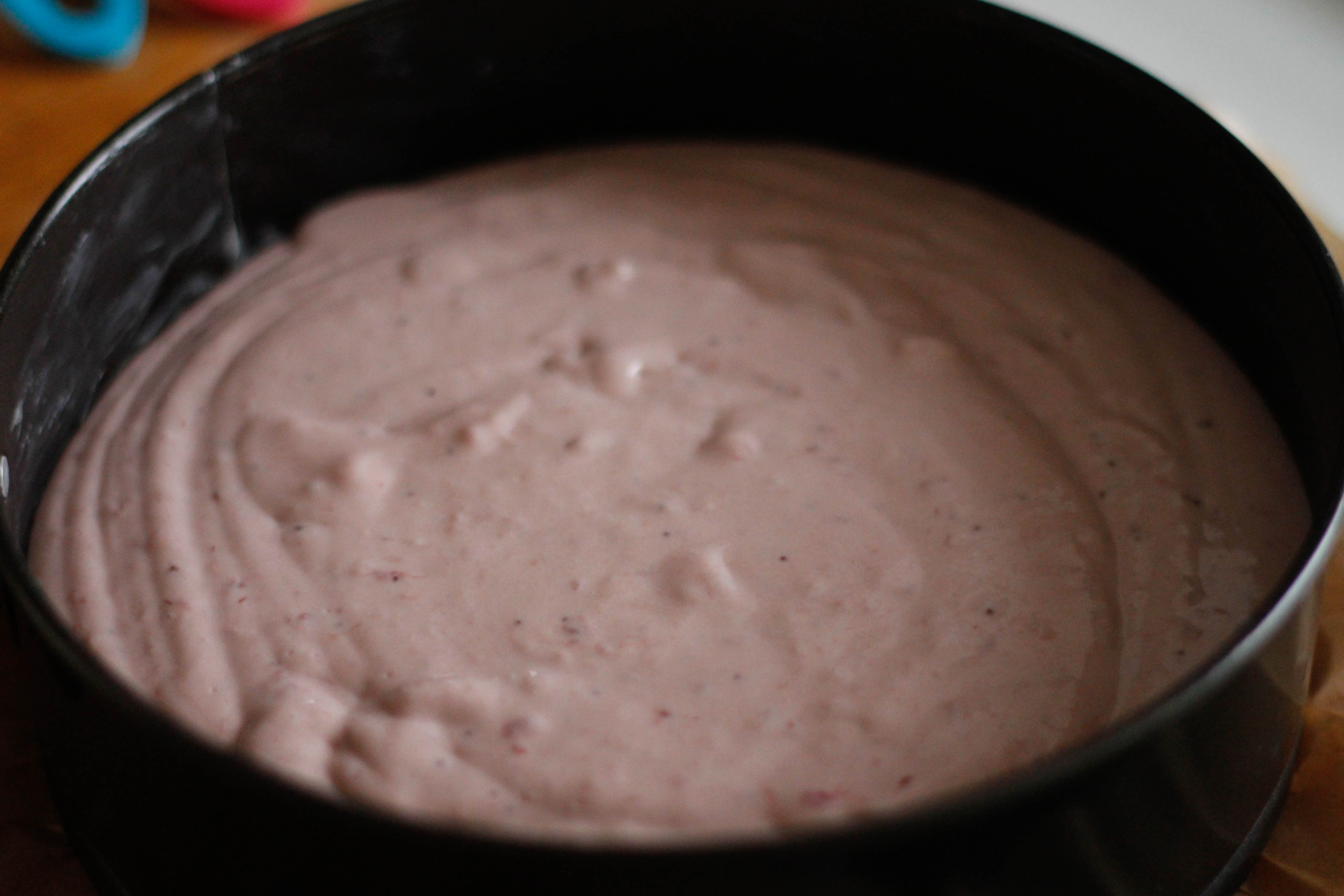 Whisk the cream cheese until smooth, then add in the remaining 100g sugar. Beat in the eggs, then sift the flour and whisk well until mixture is smooth and creamy. Gradually add the cream, the sour cream, and finally the cooled berry mixture.