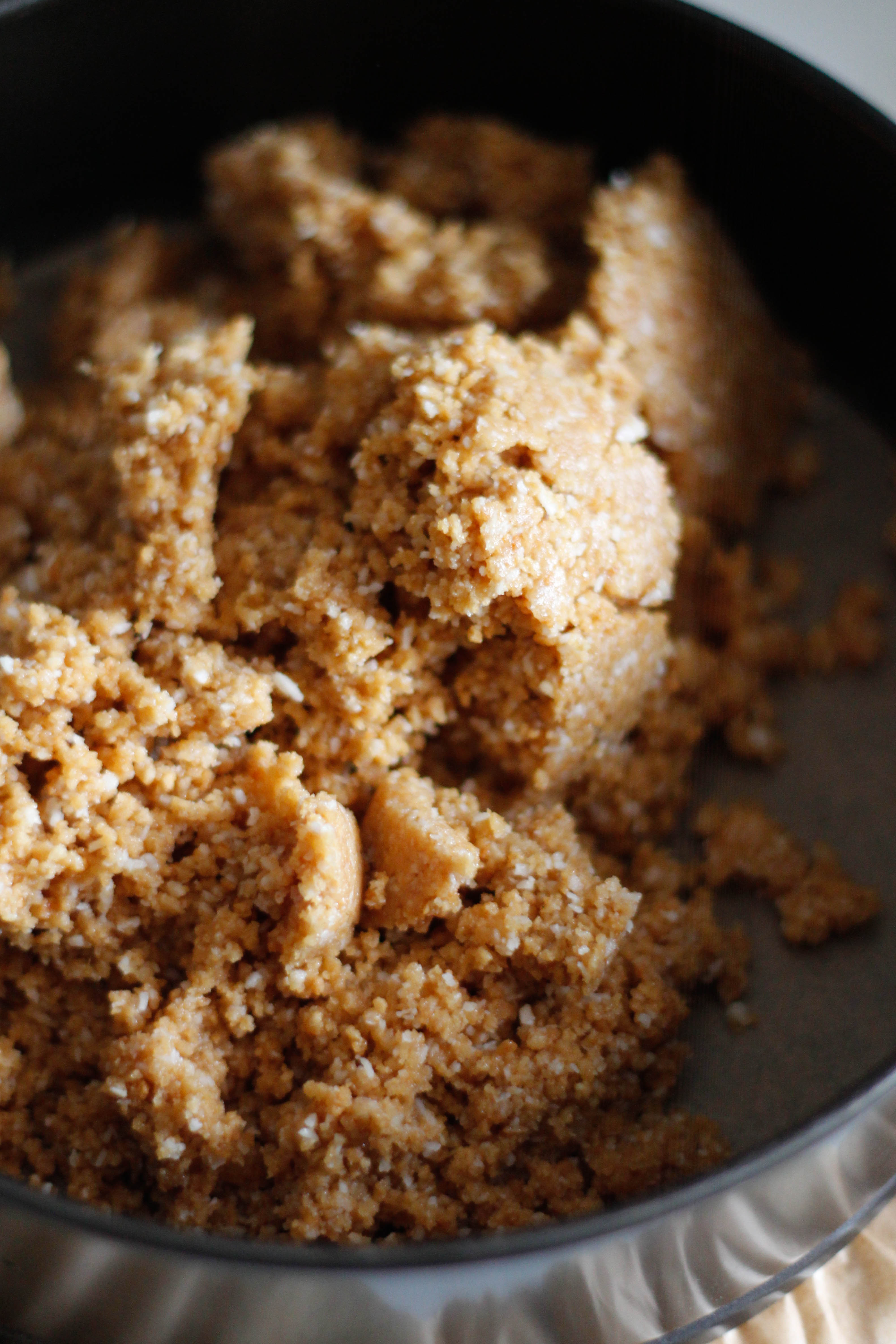Place the biscuits, coconut and flour into a food processor and pulse until you are left with a fine crumb. Add the butter and honey and pulse again until the mixture comes together.