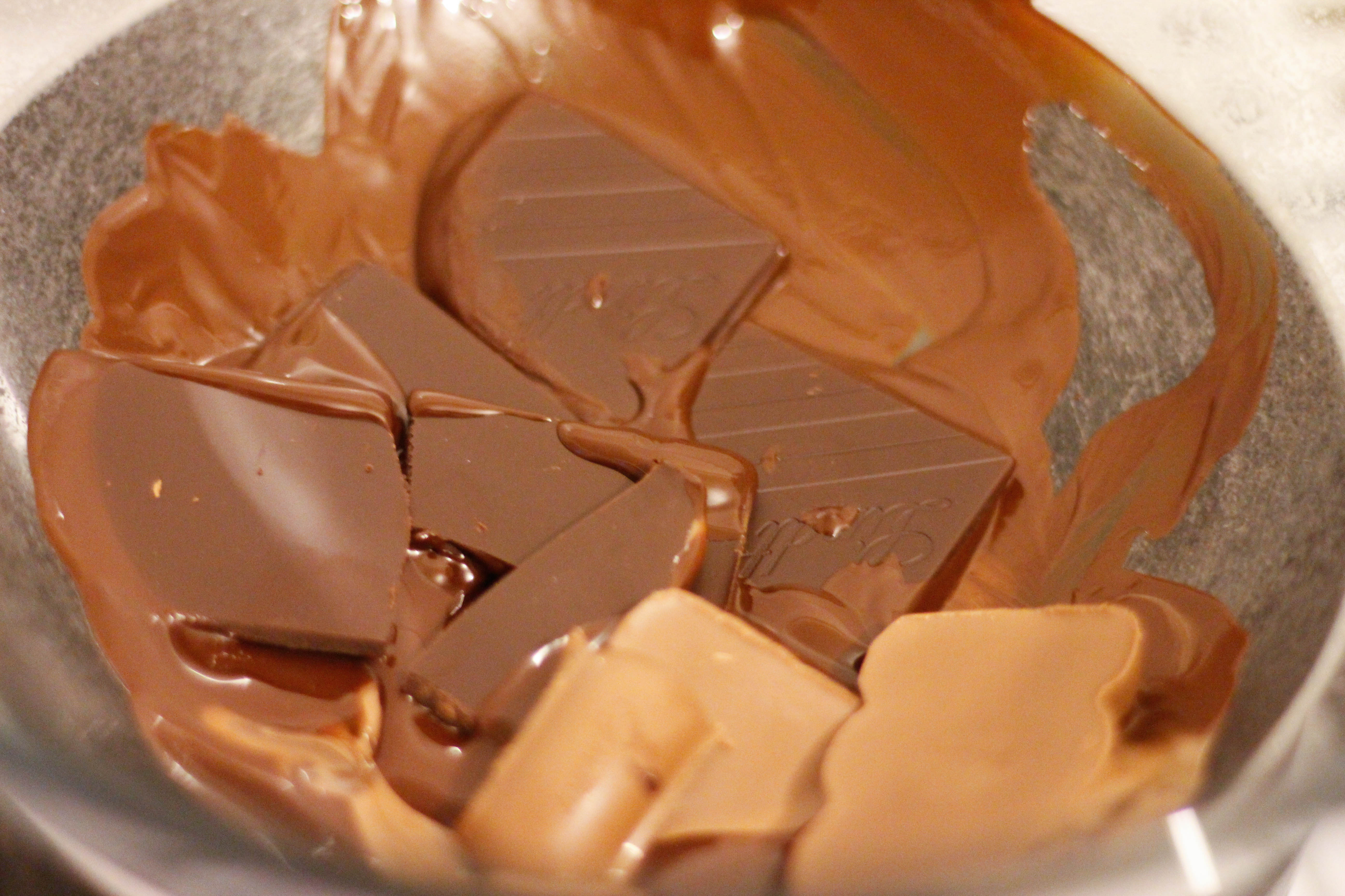 Melt the dark and milk chocolate over a double boiler. Once melted, remove from the heat and set aside to cool slightly.