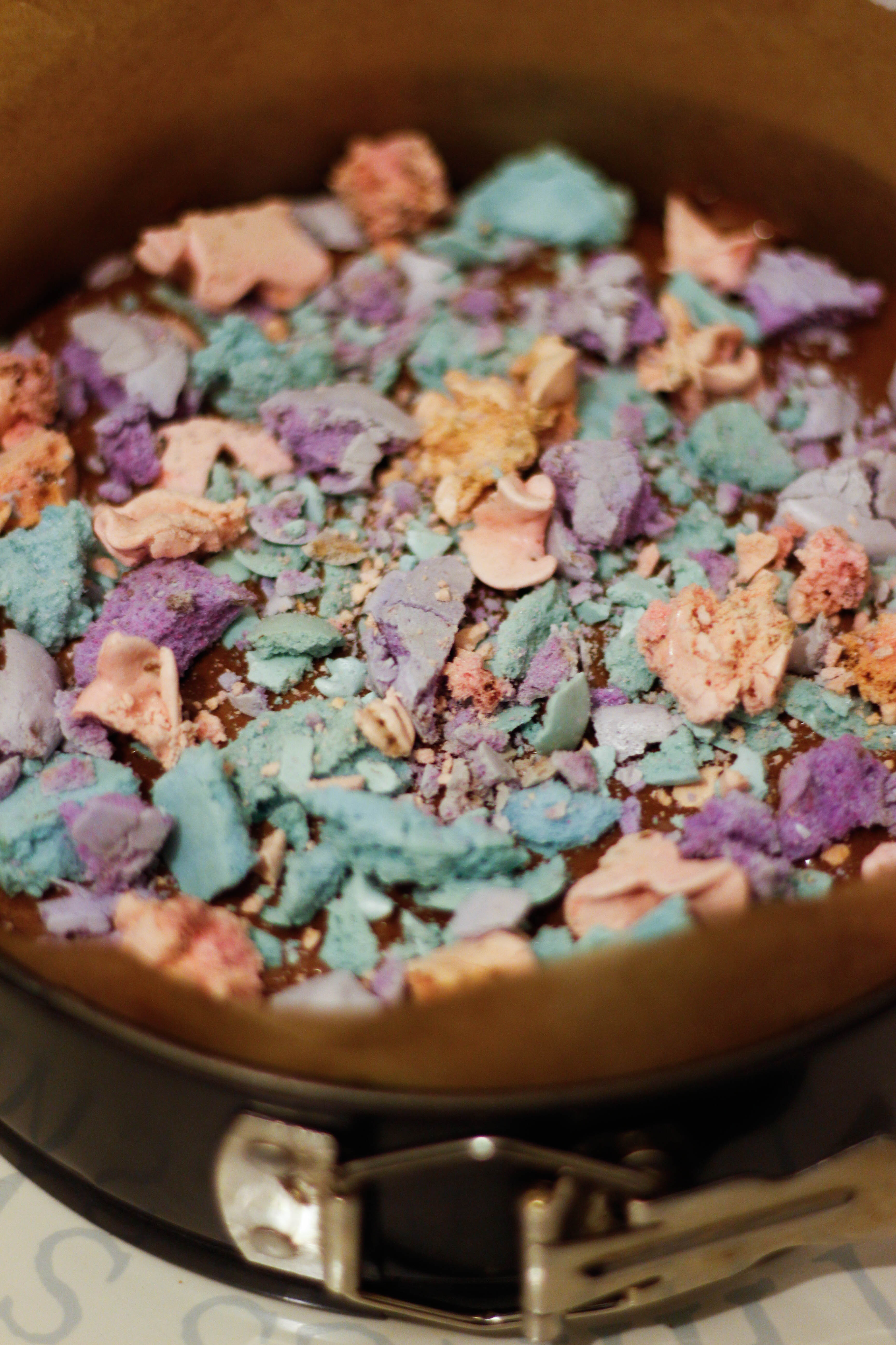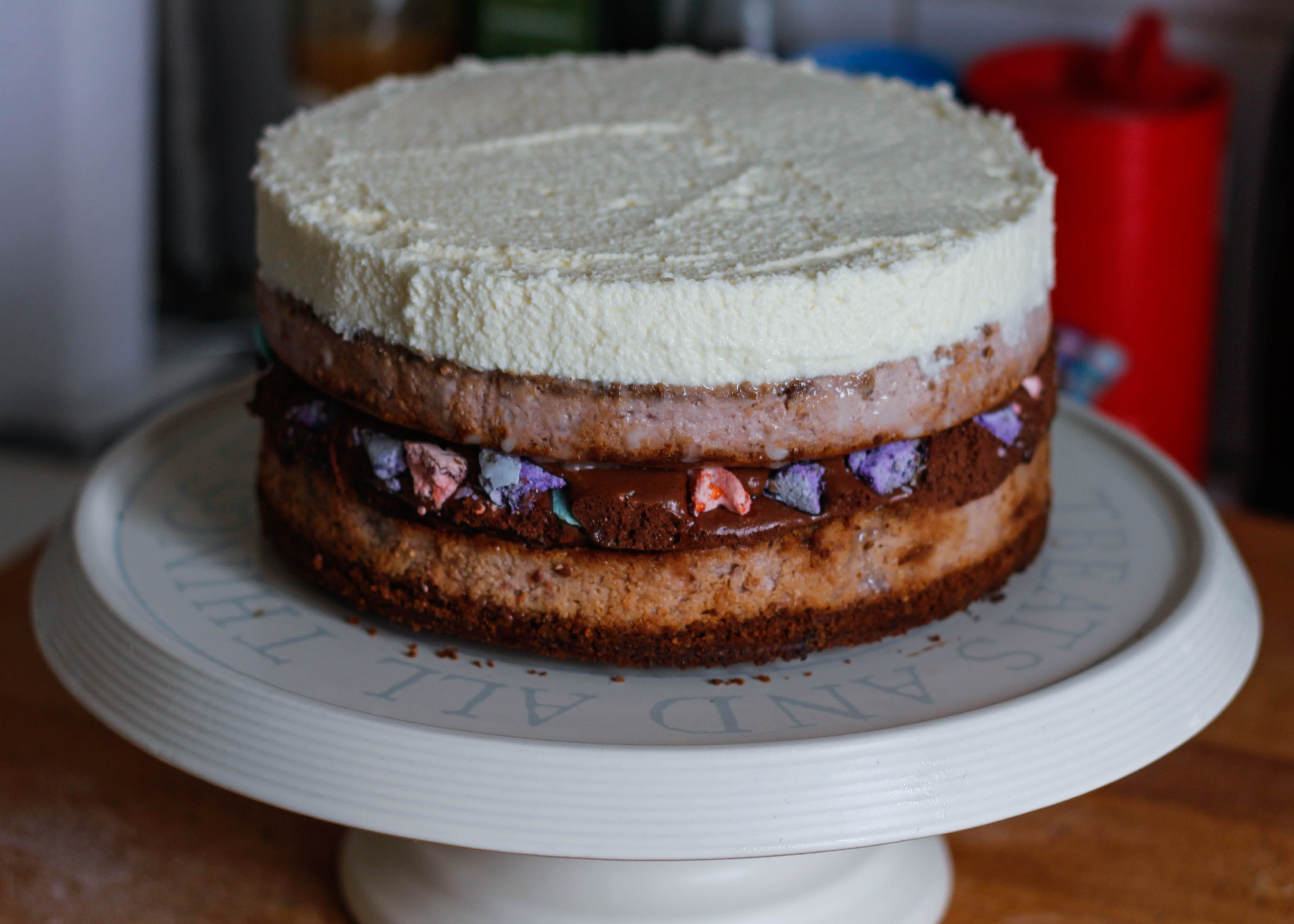 Divide the mixture in half, pouring one half onto the cooled biscuit base and baking in your preheated oven for 50 minutes, or until cake is set (there should still be a slight wobble in the centre).
