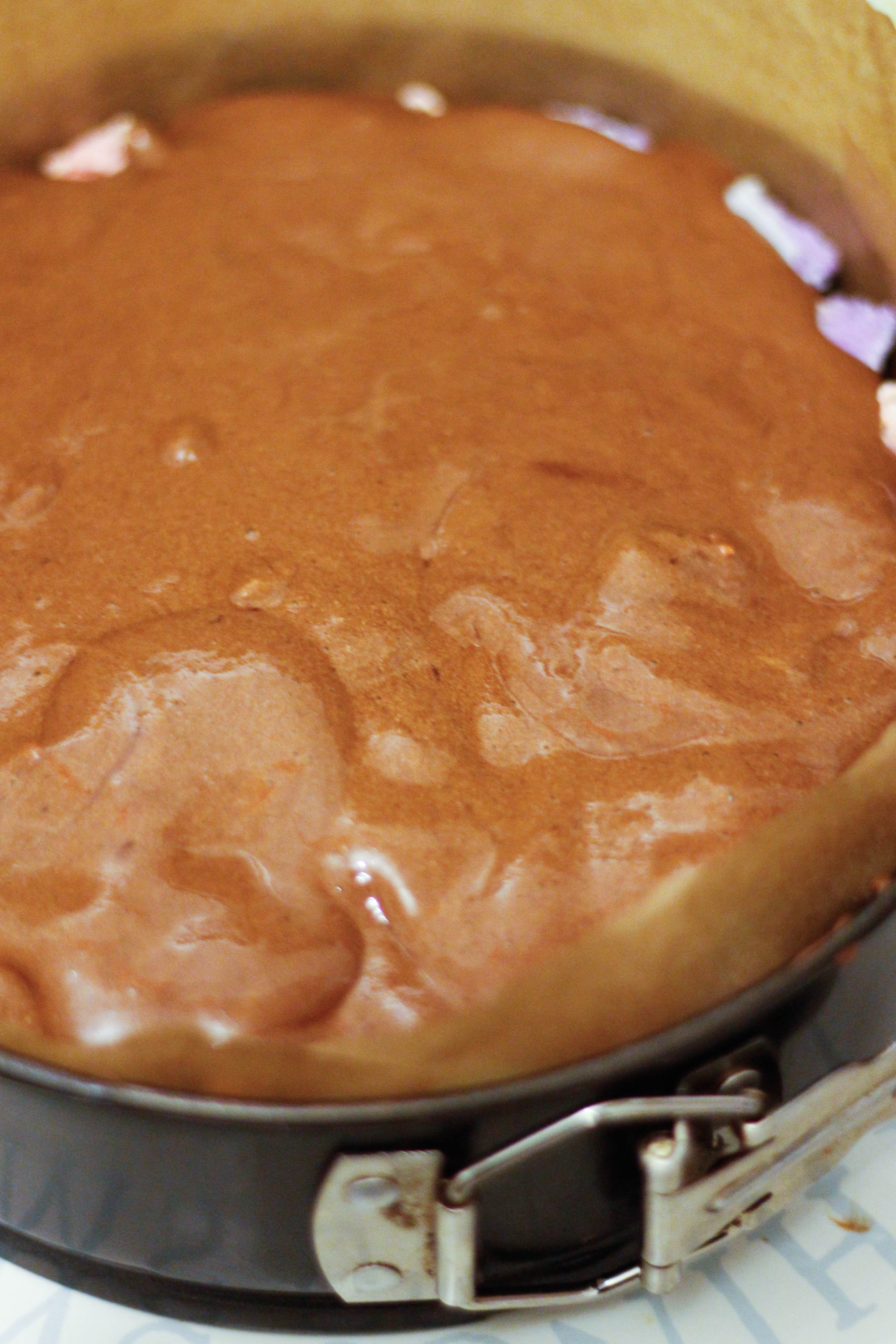 Pour a layer of chocolate mousse over the cheesecake about 1/2cm – 1cm thick.