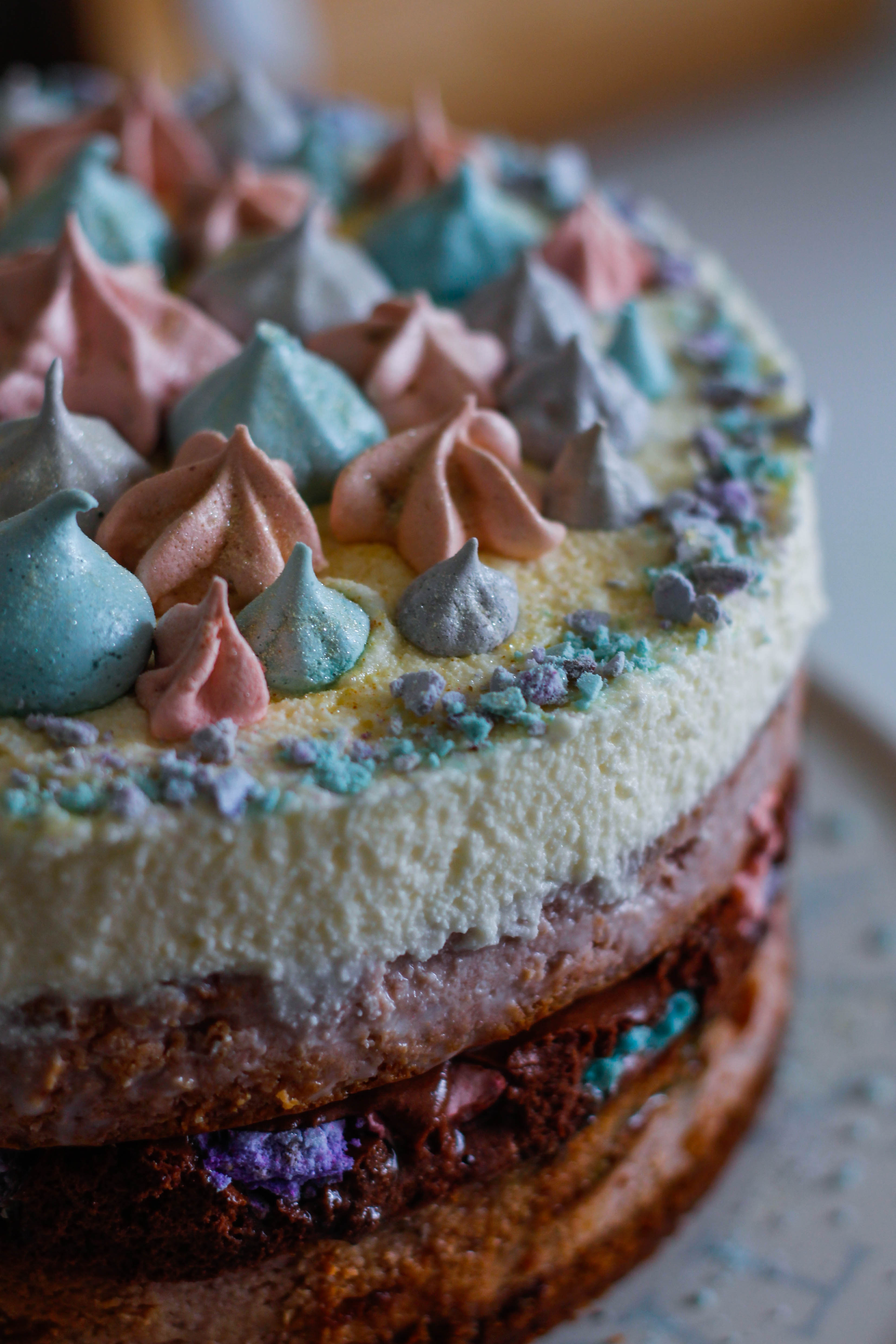 Bear in mind that the meringues will begin to soften as soon as they are added to the cake, and the mousse is best to be poured onto the cake immediately after preparing it, before it sets. If you leave the mousse to set and then build the cake you will loose some of the delicate air bubbles as you attempt to spread it.