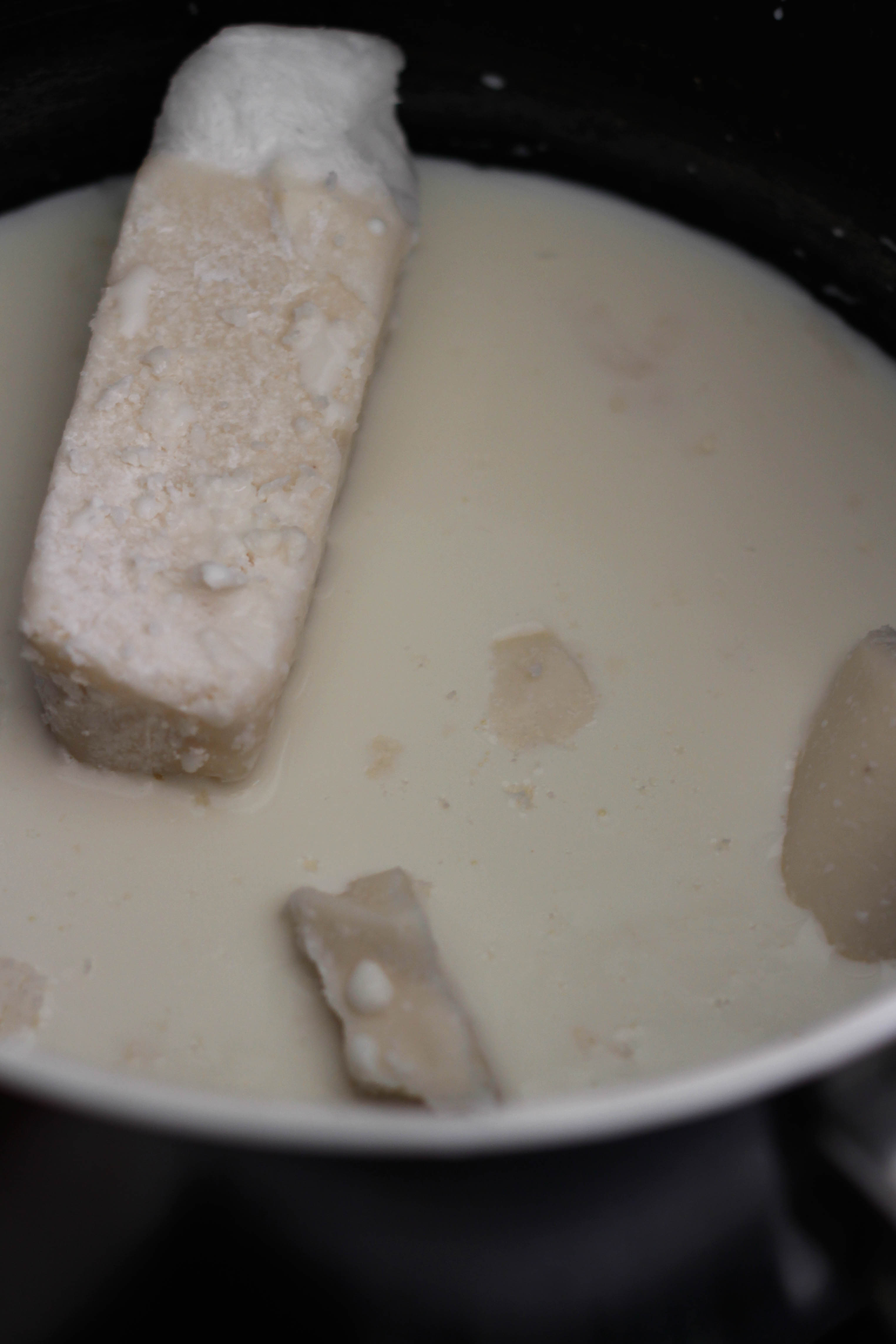 Place the creamed coconut, water, milk and cream in a saucepan and heat gently until the coconut has melted. Stir over the heat until the mixture starts to bubble lightly, then turn off the heat and leave to rest for 1 -2 minutes.