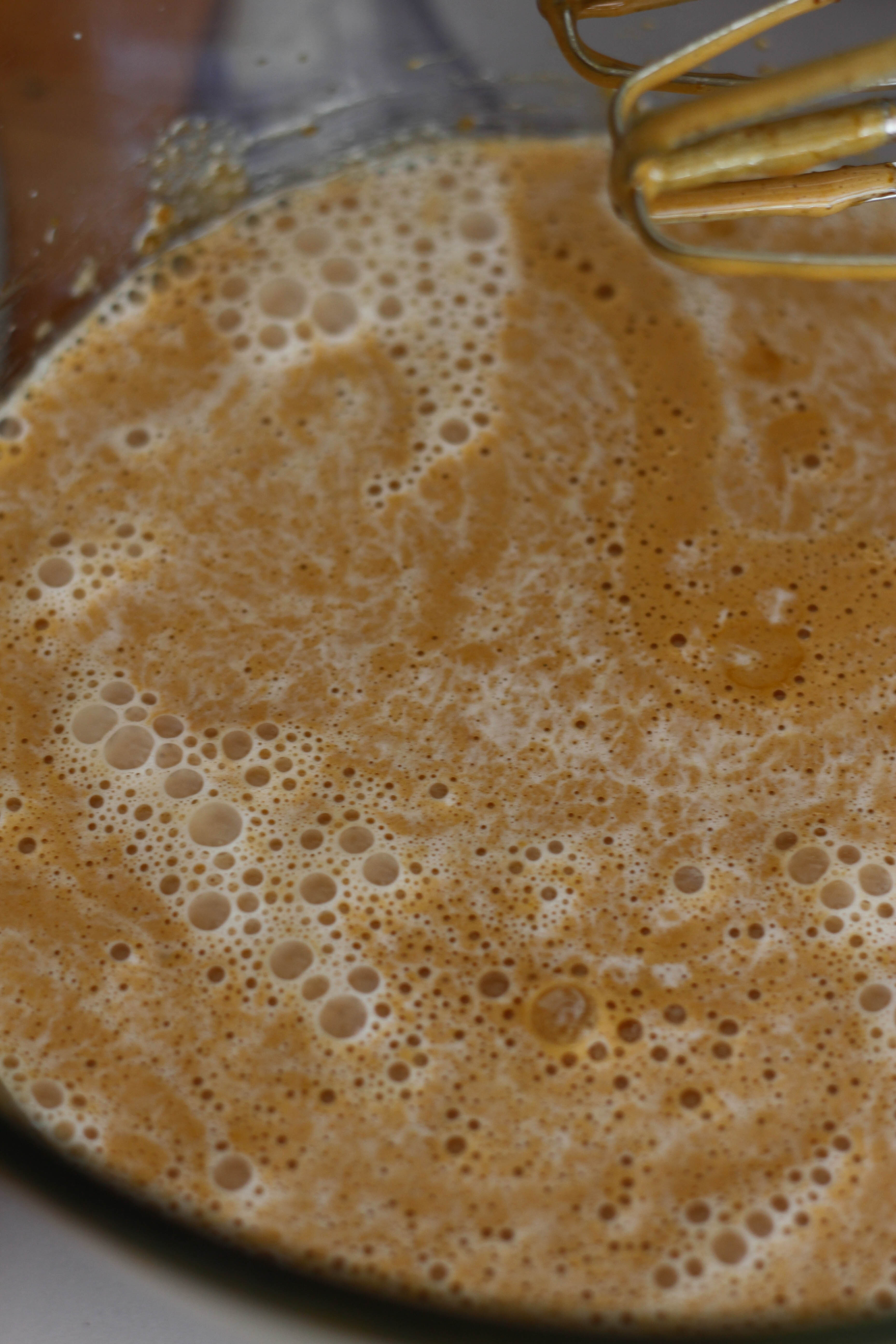 Beat the eggs and sugar until pale and creamy, then pour the warm milk mixture onto the eggs and whisk to combine.