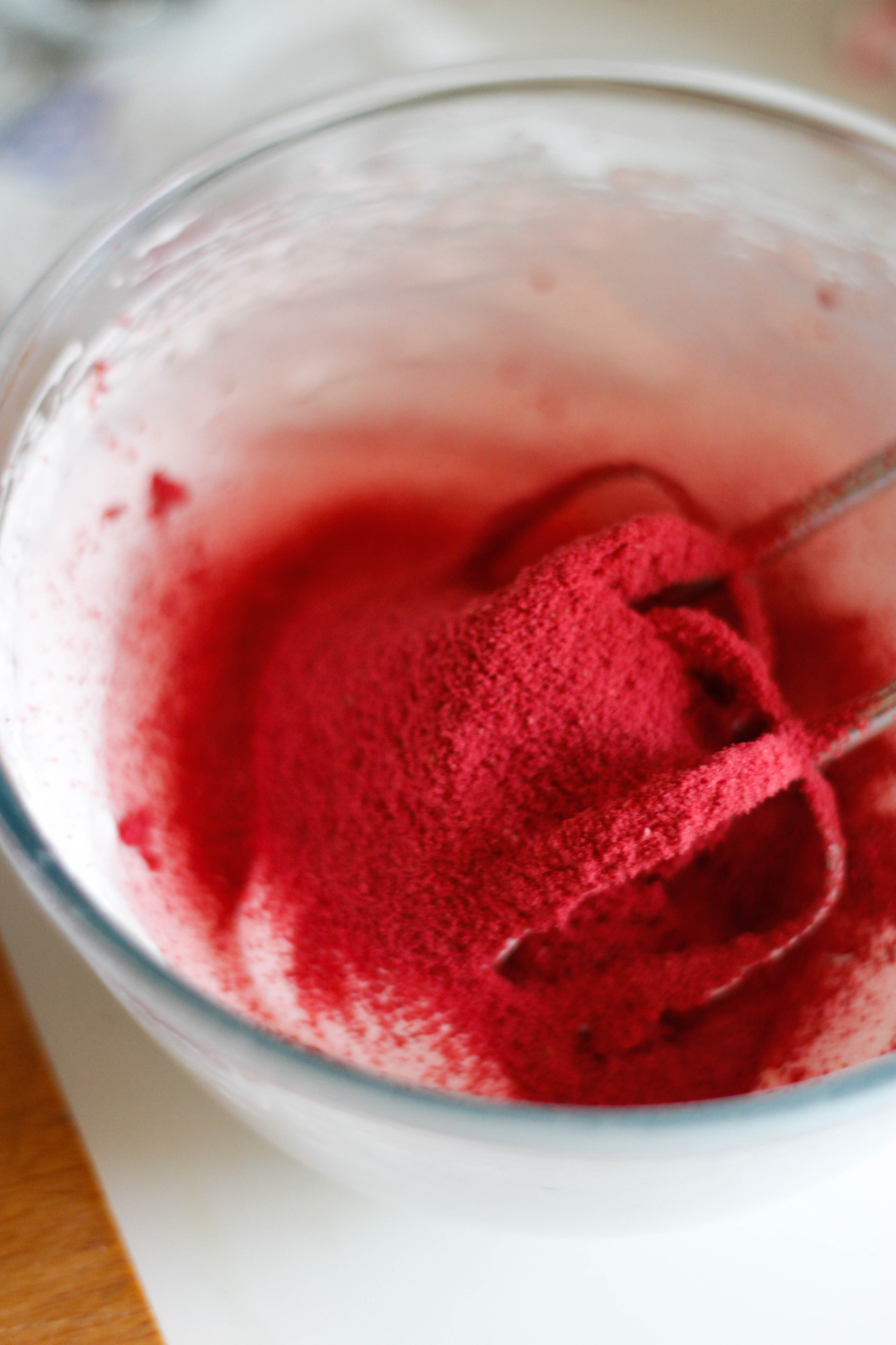 Beat the egg whites to soft peaks then add the sugar a little at a time, continuing to beat until the egg whites are stiff. Add the freeze-dried raspberry powder and whisk to combine.