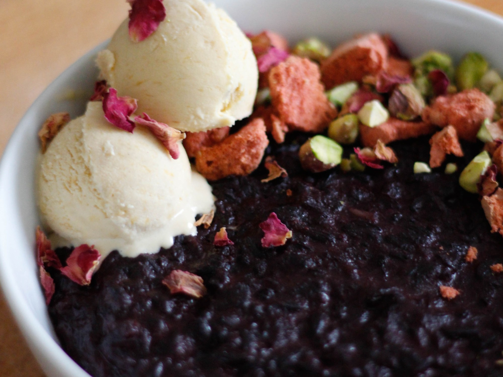 Top the rice pudding with 2 small scoops of mango coconut ice cream, a handful of chopped pistachios and crushed meringue pieces, then sprinkle with dried rose petals and serve.