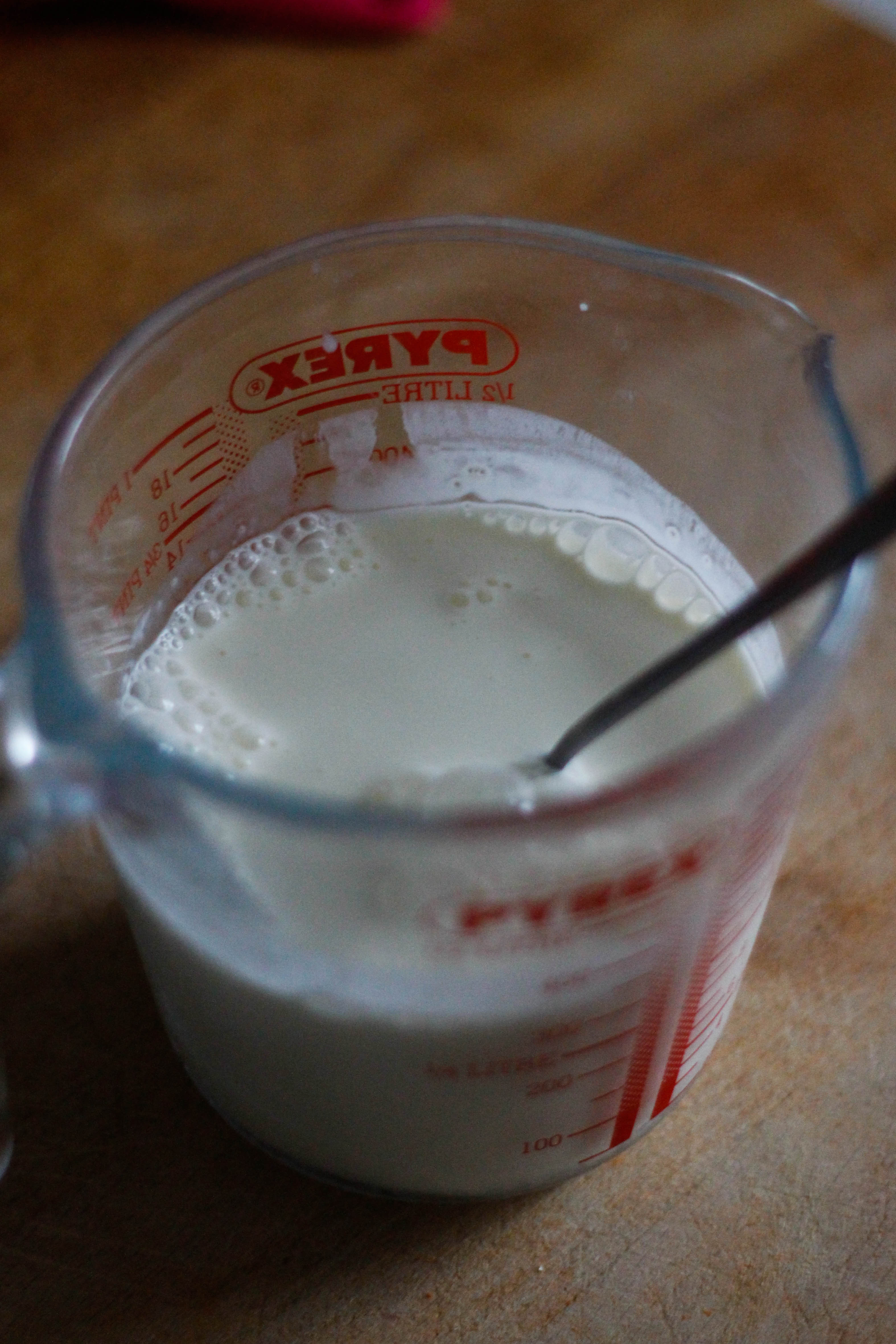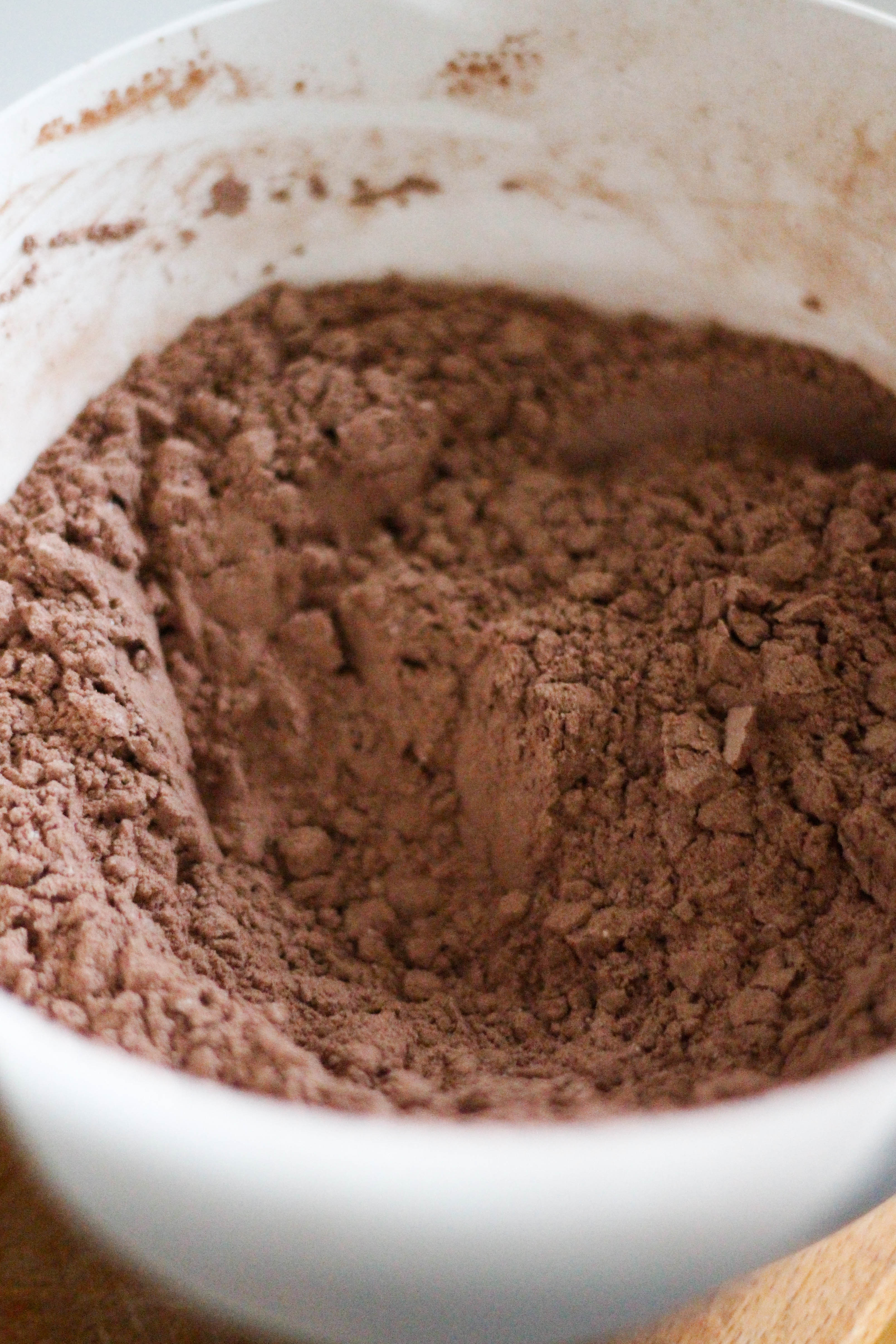 Combine the cream, 100ml water and the vinegar and set aside. In a separate bowl, sift the cocoa powder, plain flour, baking powder and baking soda. Add the salt to the dry ingredients, then stir the mixture until combined and set aside.