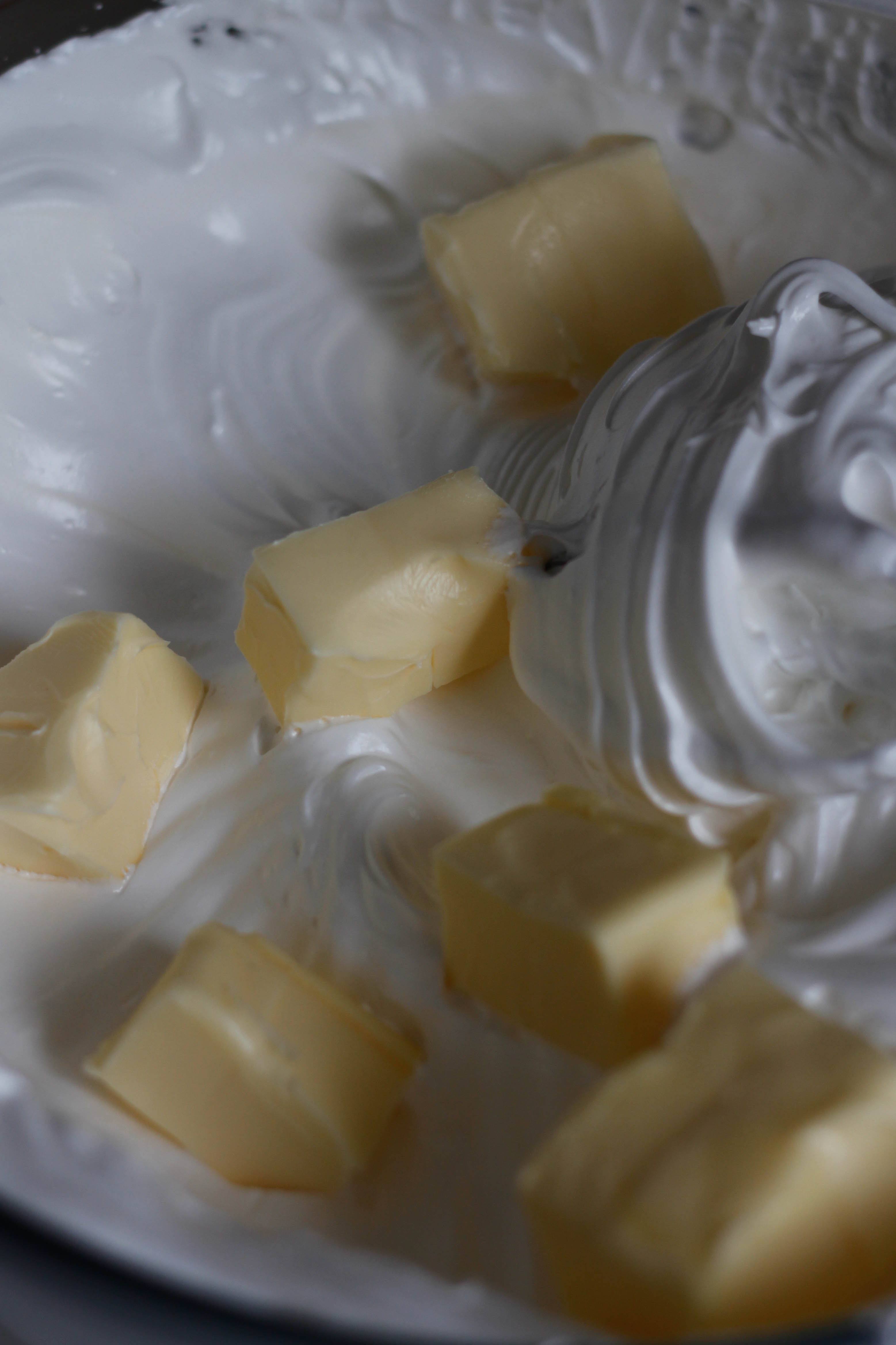 Remove the egg whites from the heat and start beating with an electric beater or whisk. Continue to beat the egg whites until they are stiff and the bowl is cold to the touch (or back to room temperature). Take a third of the cubed butter and add to the egg whites.