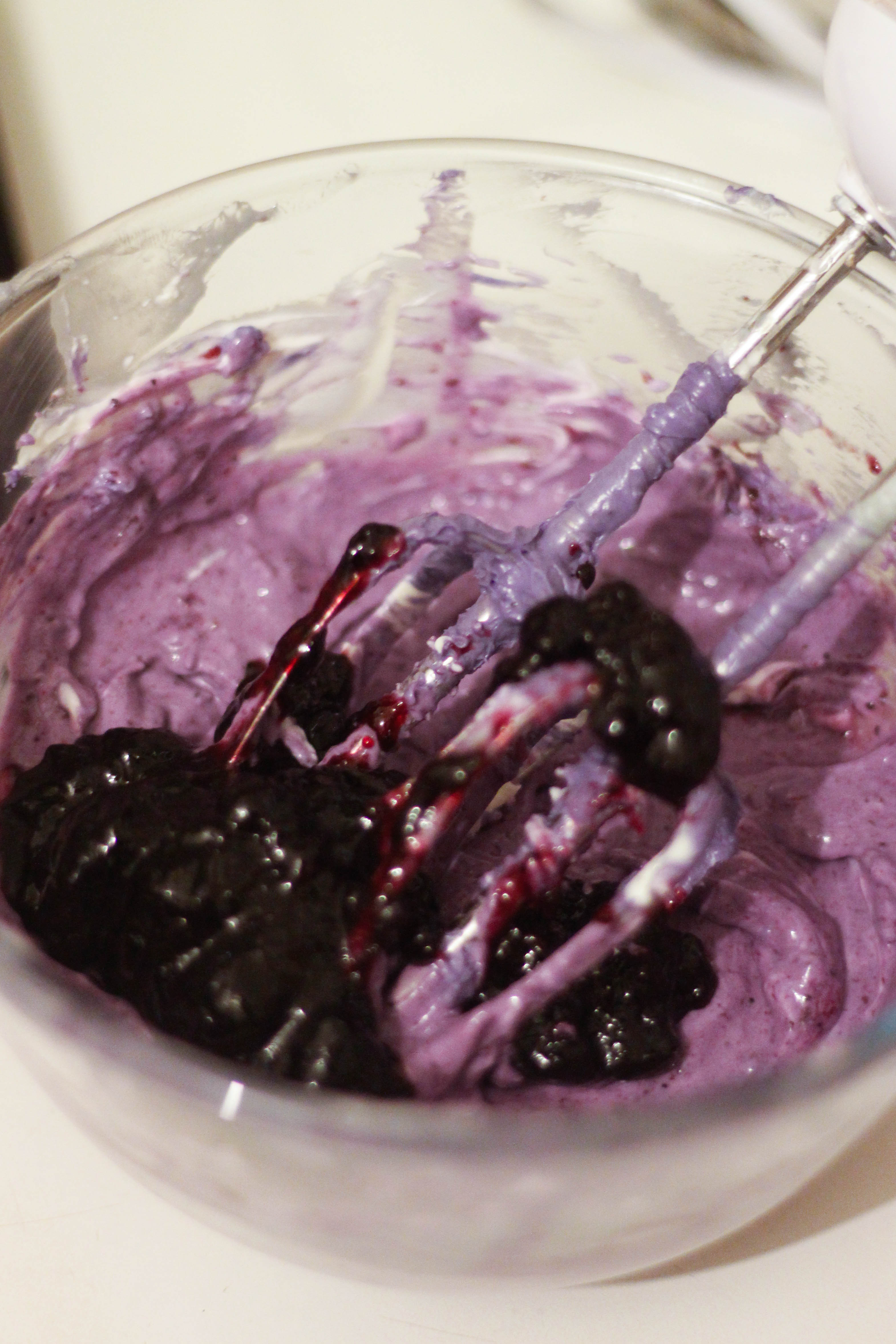 Briefly beat together the cream cheese and buttercream, then add the blueberry jam. Beat again until just combined.