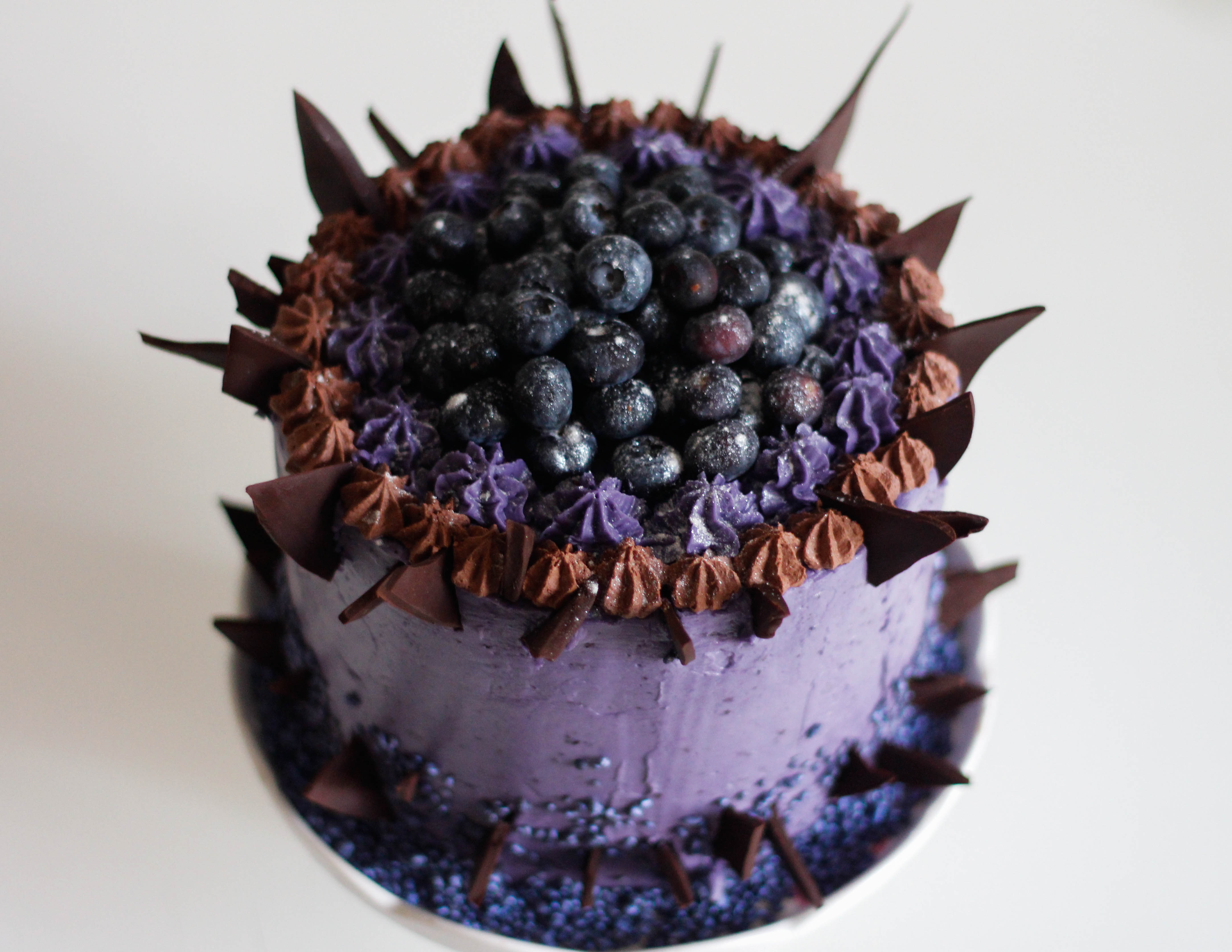 A deep, rich, velveteen chocolate cake filled with a tangy and sweet blueberry cream cheese filling, finished with a silky blueberry buttercream, crisp chocolate shards and an indulgent dark chocolate ganache.