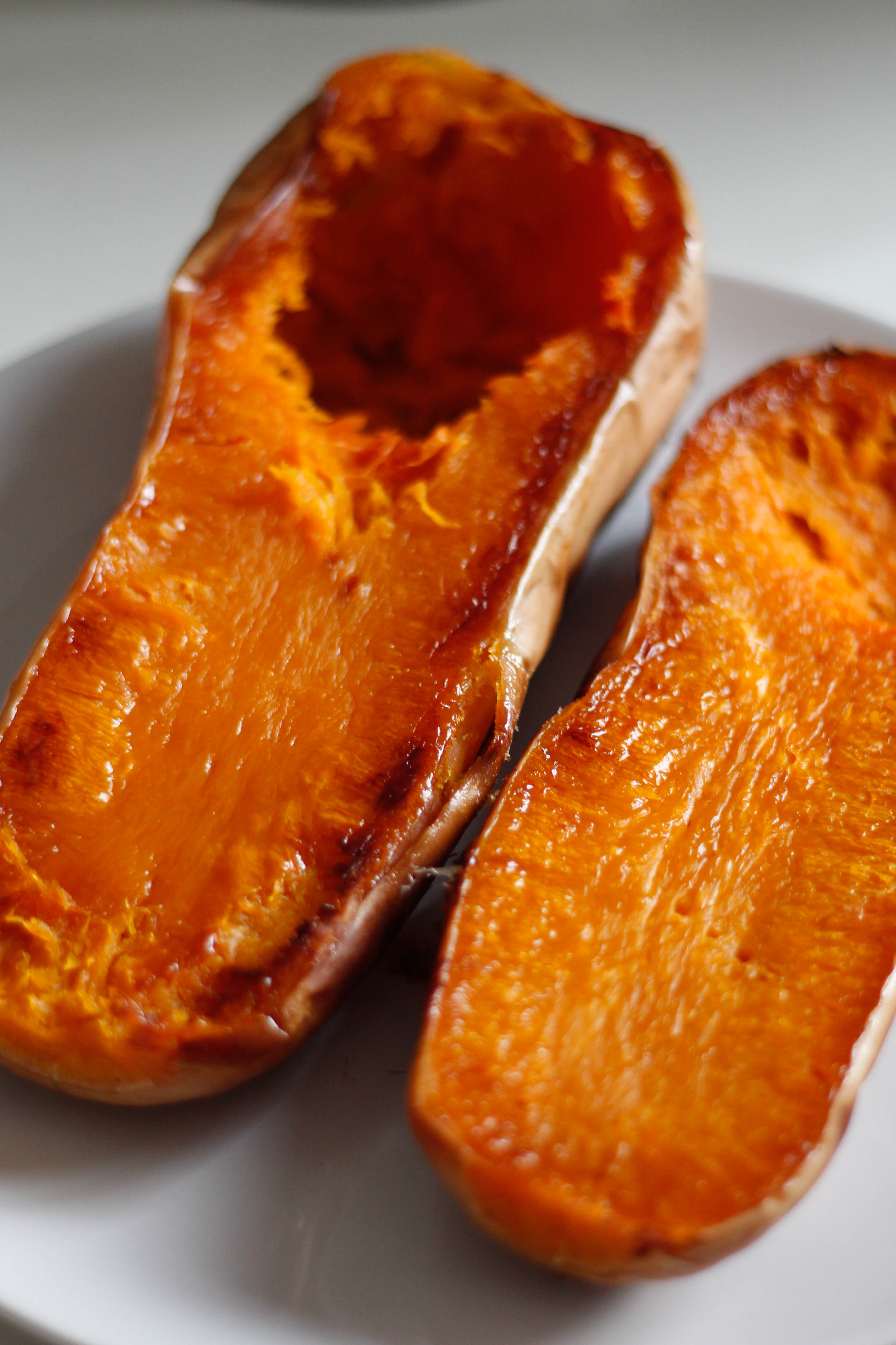 Slice the butternut squash down the middle and place face down on a baking tray lined with baking paper. Place in the oven and bake for around one hour, or until soft all the way through.