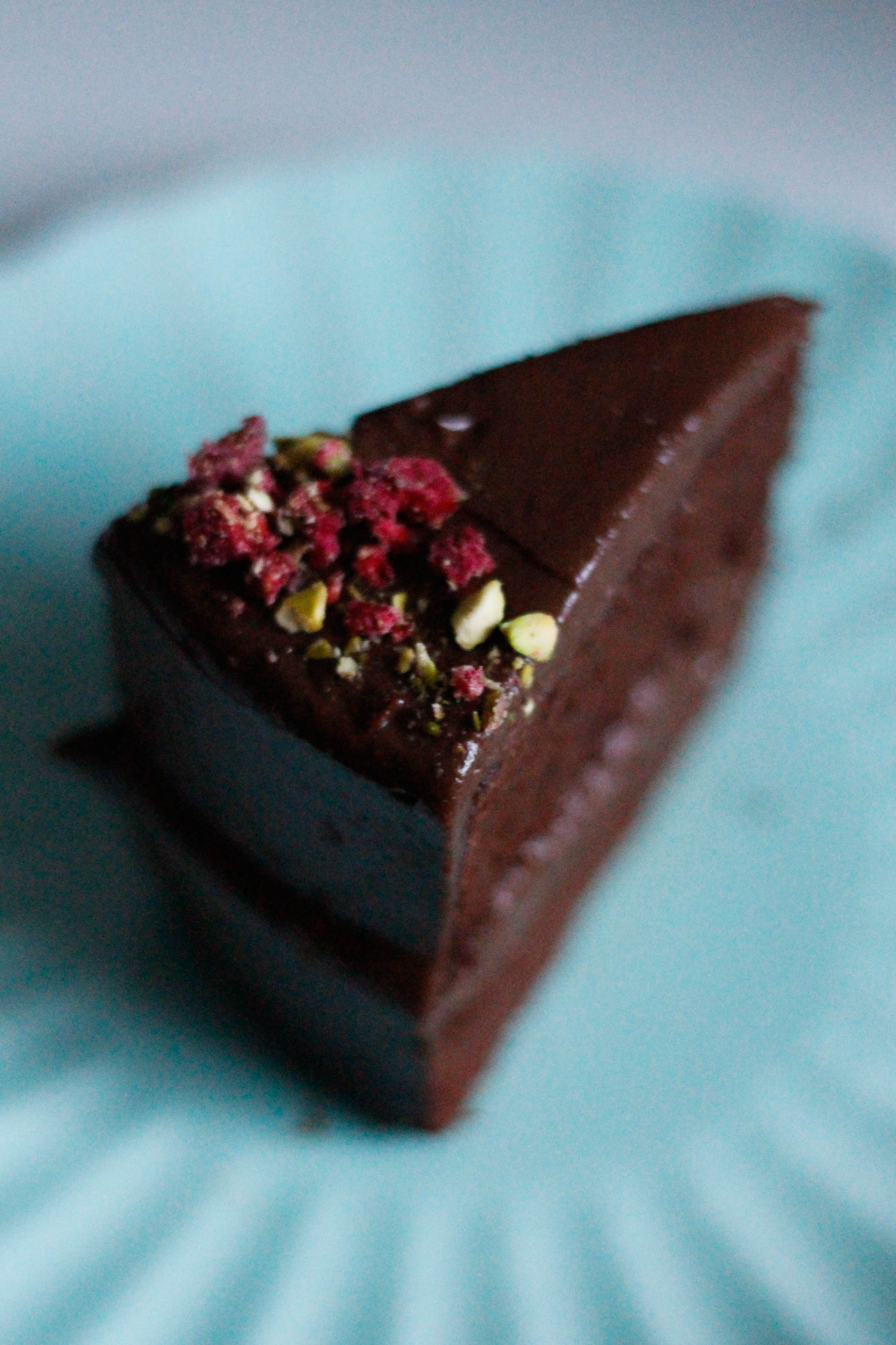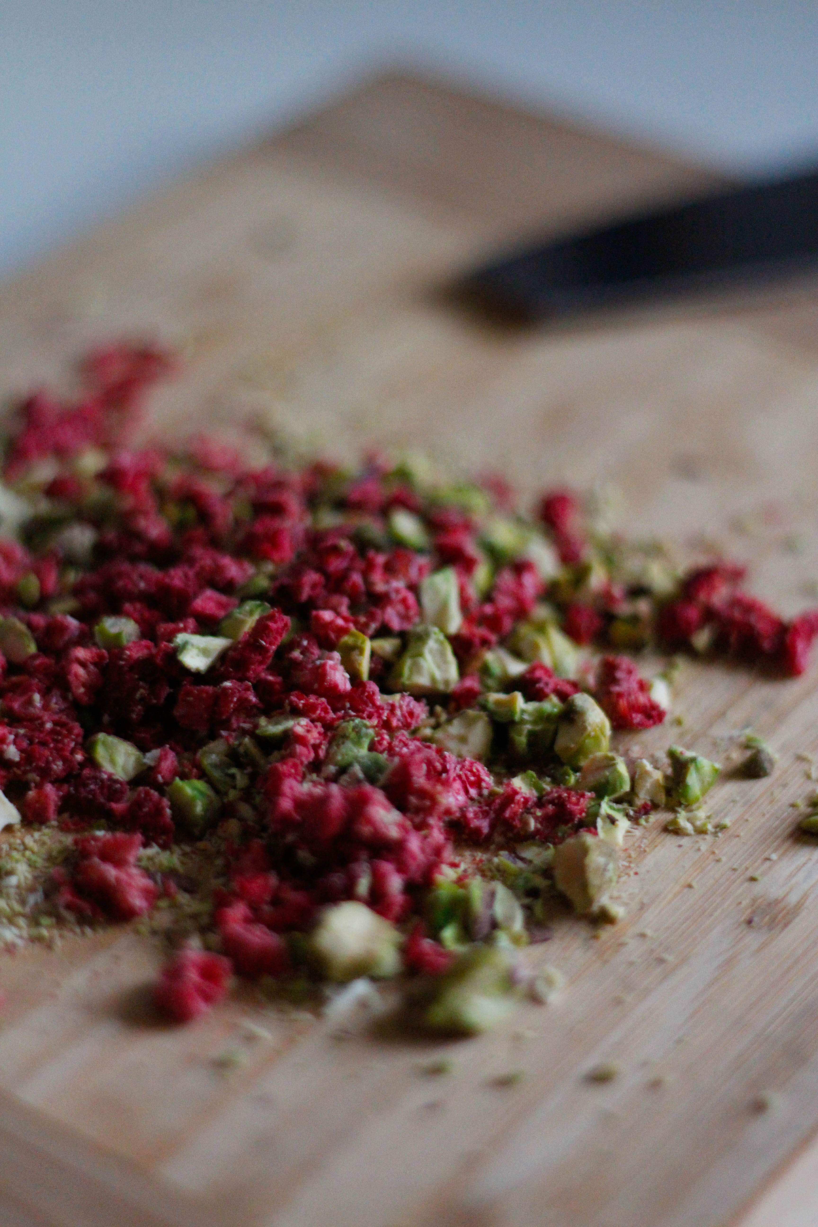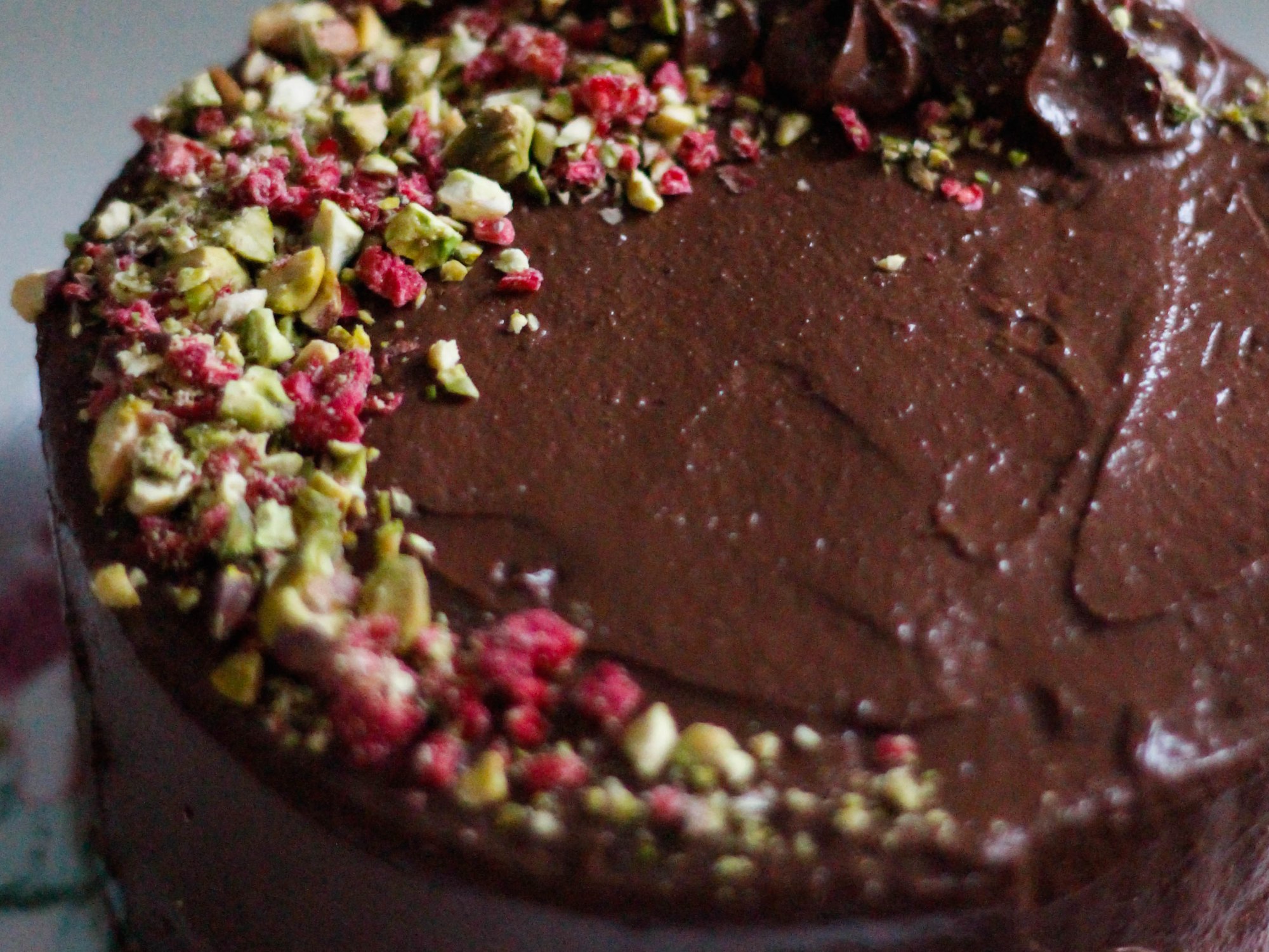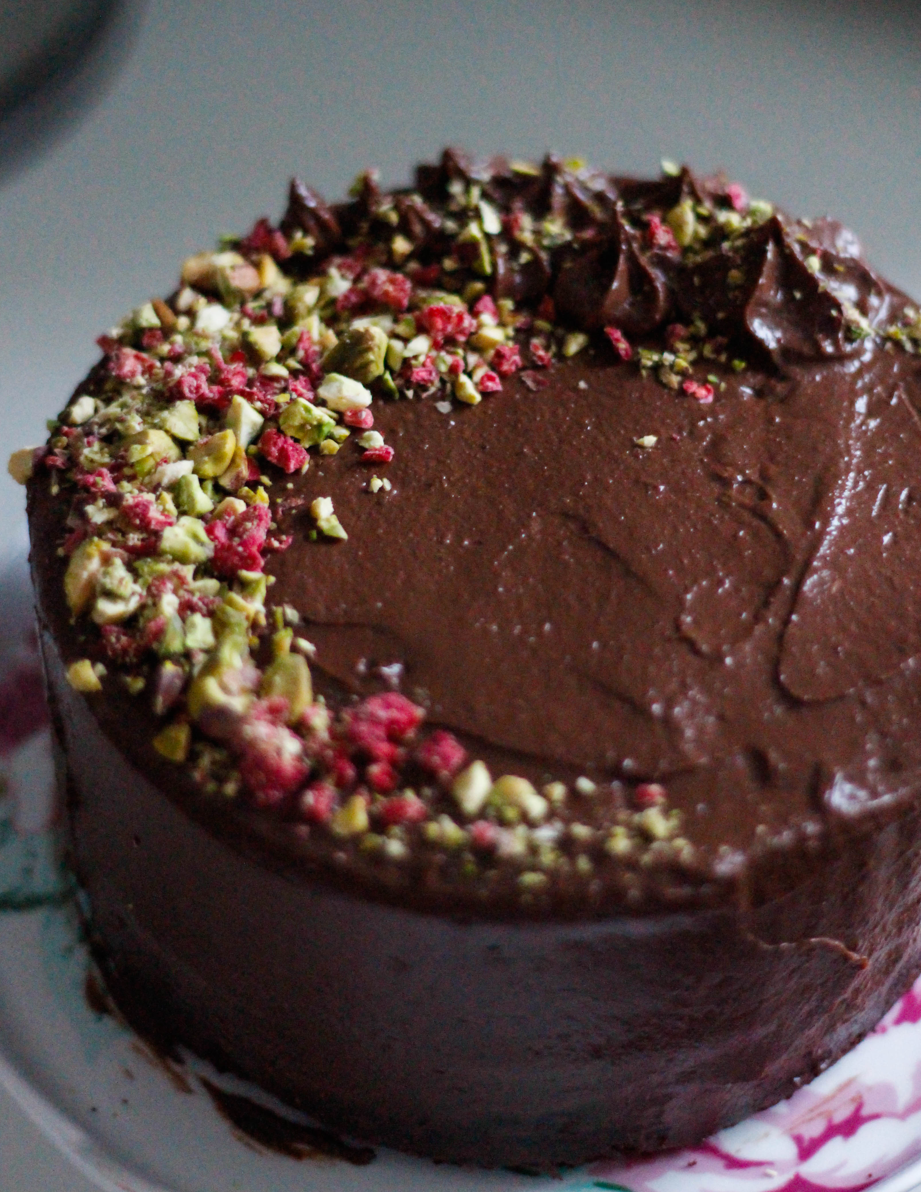 Top the cake with some chopped pistachios and freeze-dried raspberries for a zesty crunch.
