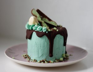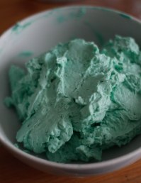 Beat the cooled chocolate into the icing mixture, then add the extract to desired taste, followed by the food colouring to desired colour – bear in mind that you still have the cream to add which will dilute the colour and flavour slightly.